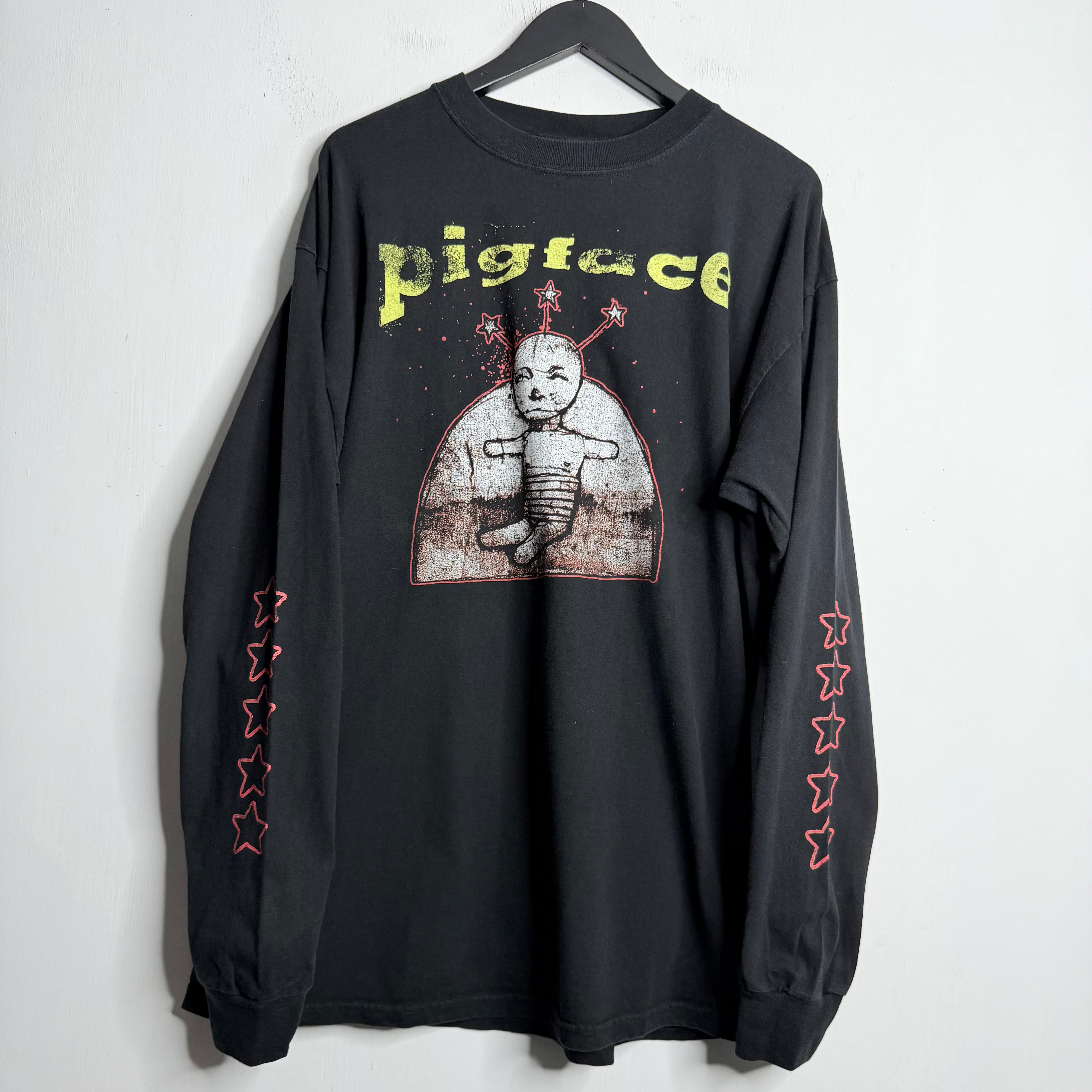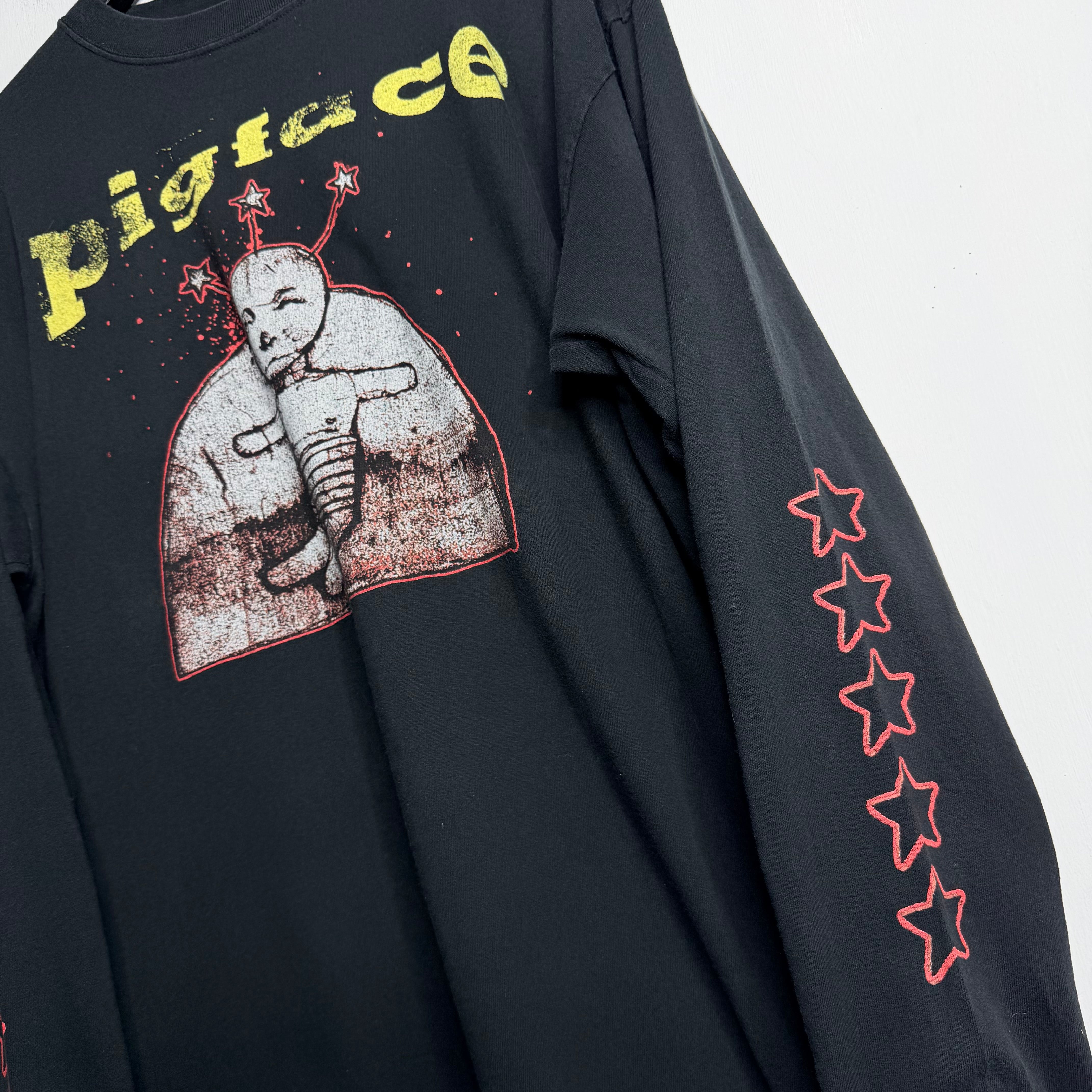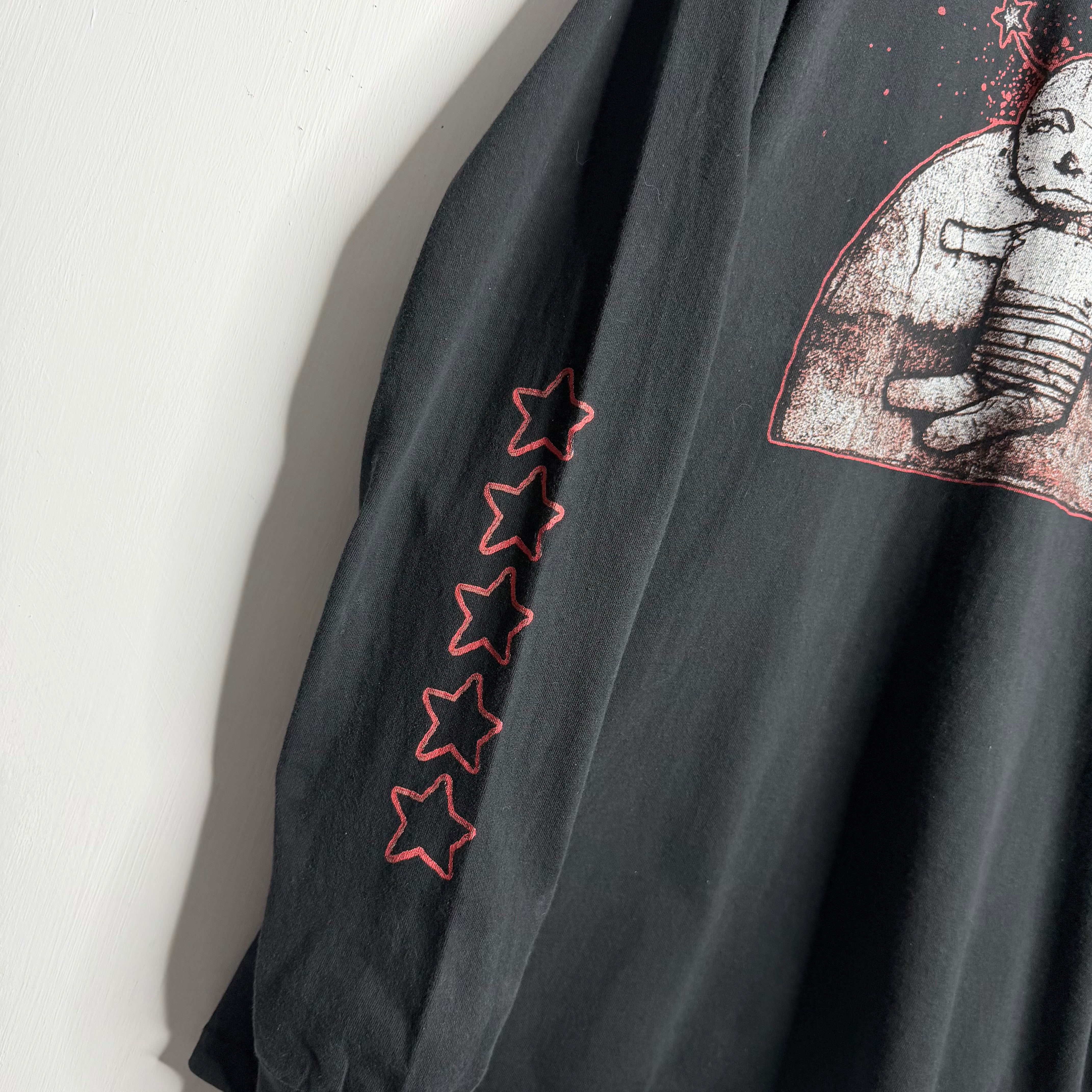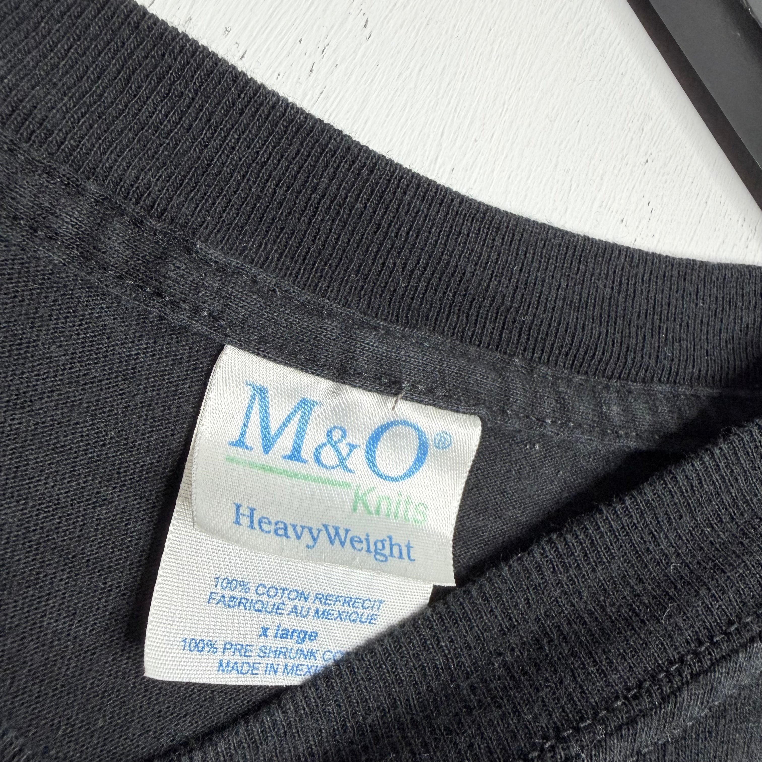 Repentless. 24" armpit to armpit, 31.5" top of back collar to bottom. Single stitch. M&O Knits says XL, fits slightly big. 100% cotton. Made in Mexico.
