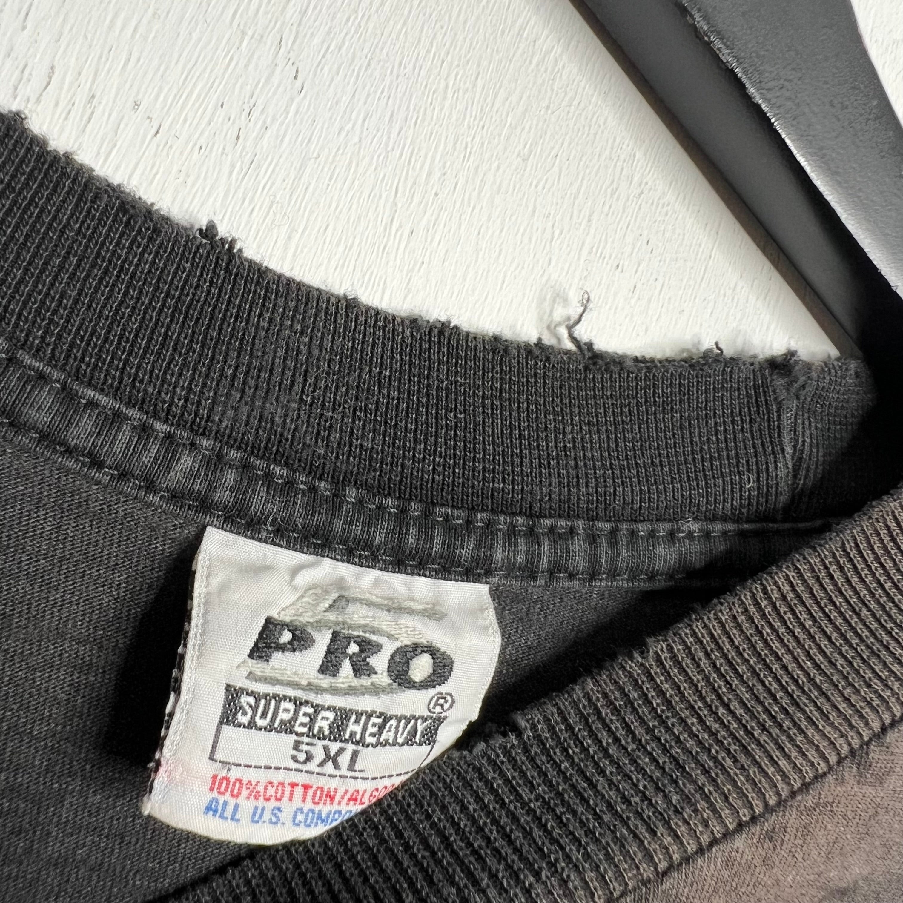 Rare wear. 20" armpit to armpit, 31" top of back collar to bottom. Pro 5 says 5XL, fits slightly short as bottom hem has been cut off. 100% cotton. Made in the USA.