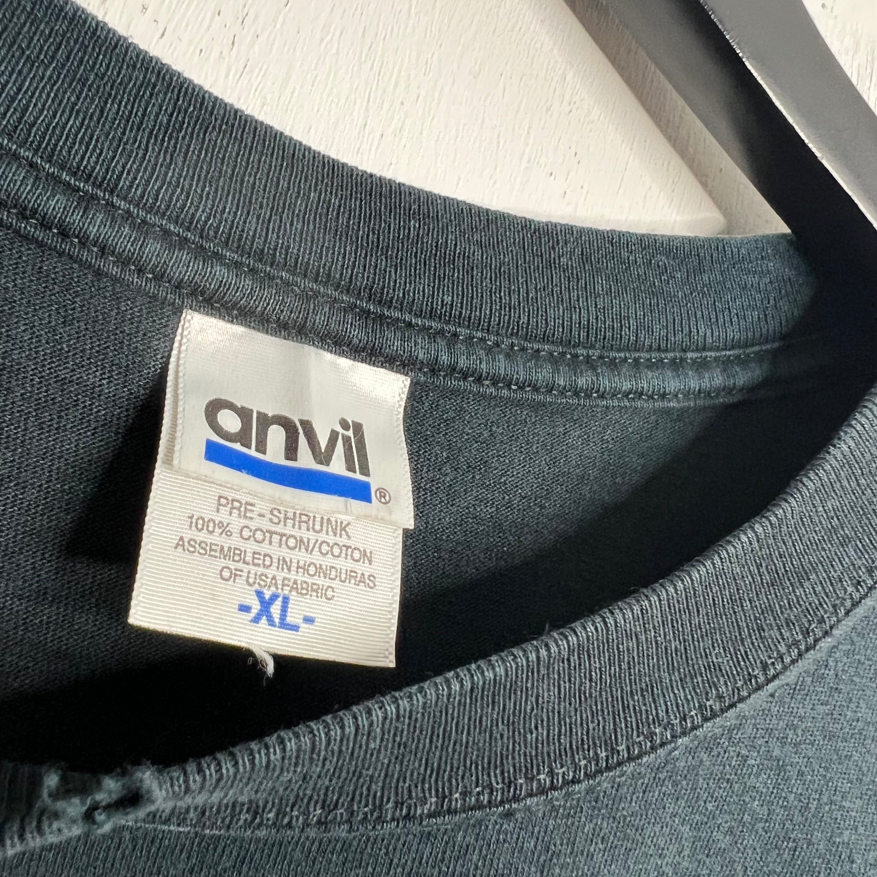 Righteous trash. 25.5" armpit to armpit, 29.5" top of back collar to bottom. Anvil says XL, fits big. 100% cotton. Made in Honduras.