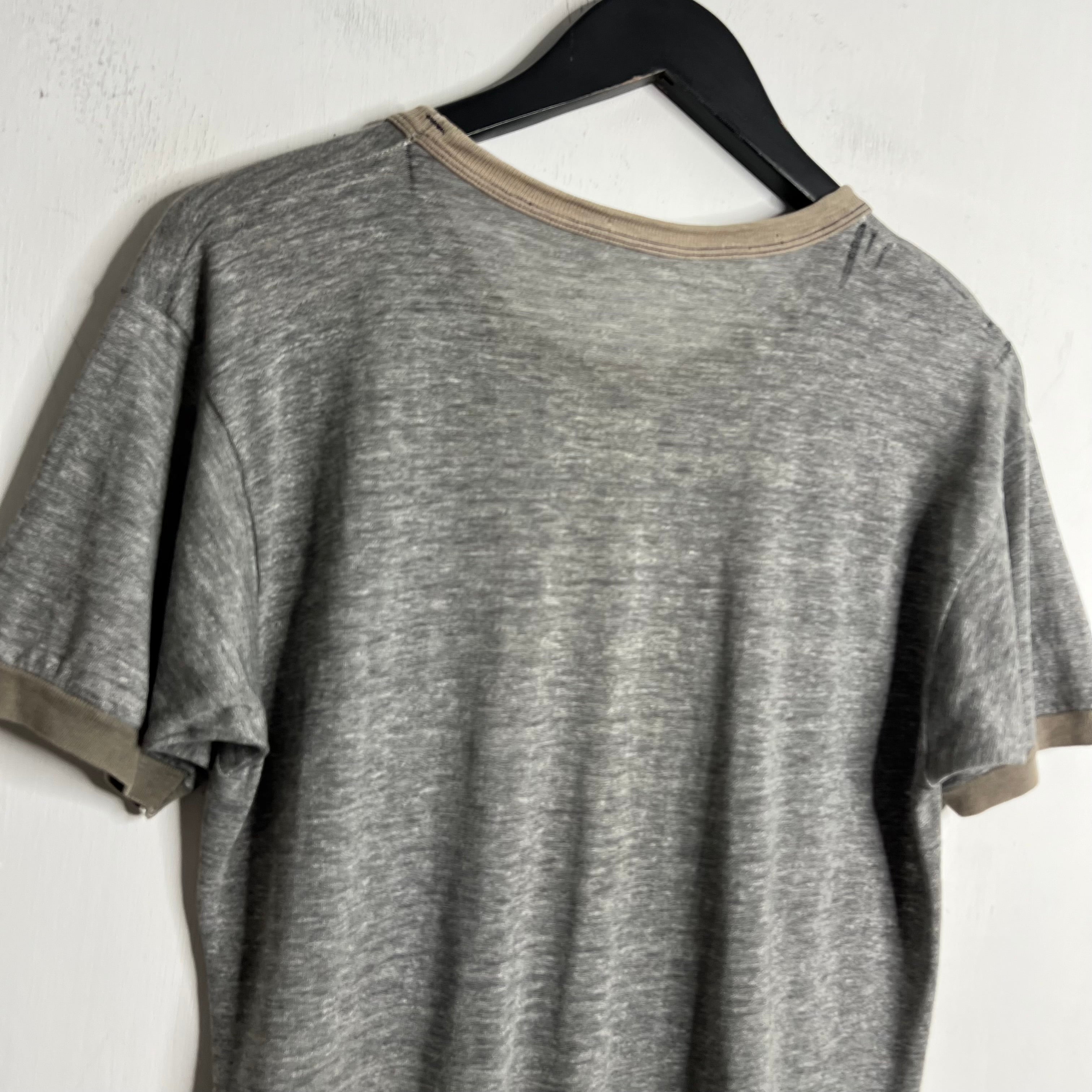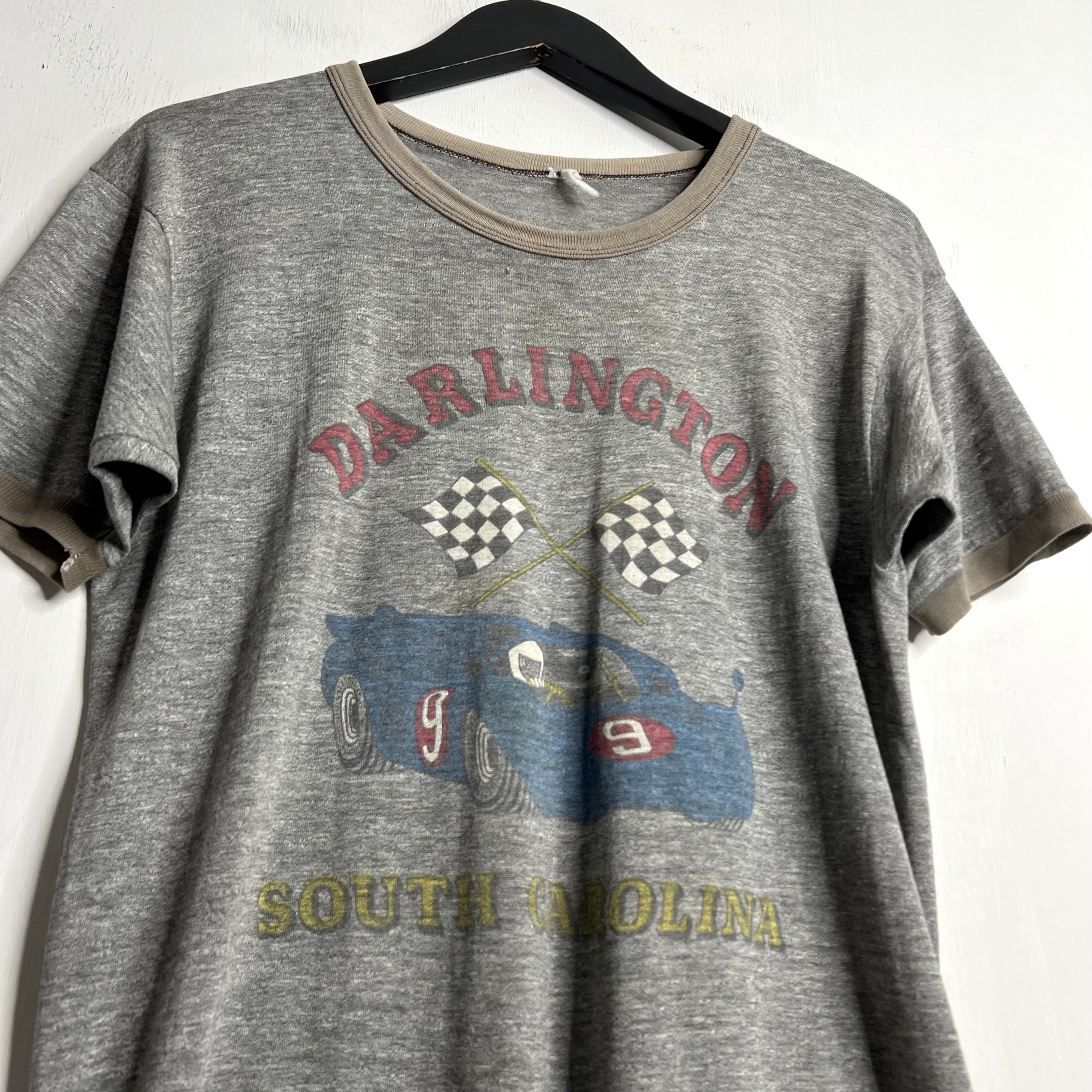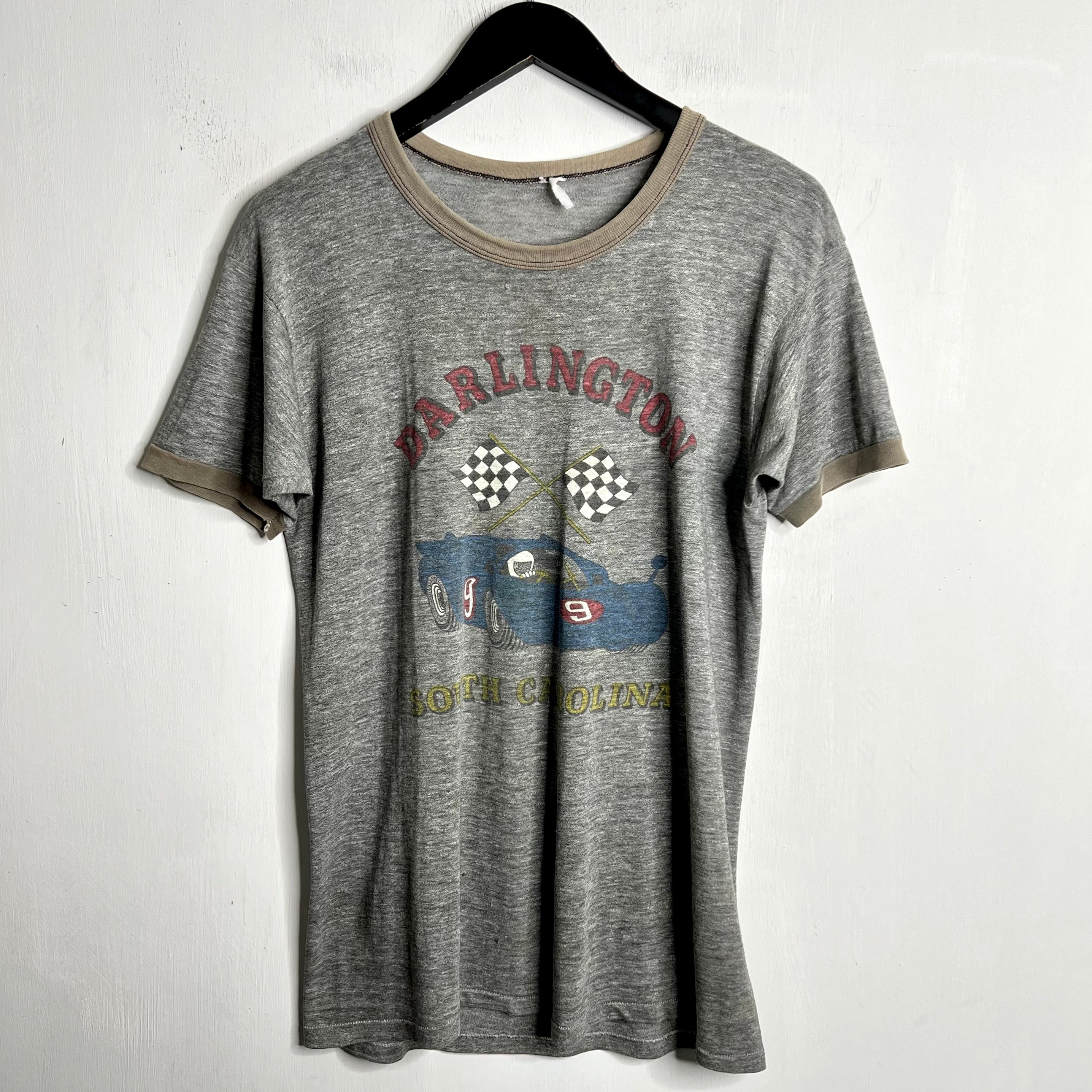 Raceways of yore. 20" armpit to armpit, 28.5" top of back collar to bottom. M/L. 50% cotton/50% polyester (may be a tri-blend with some rayon as it is extra soft). Made in the USA.