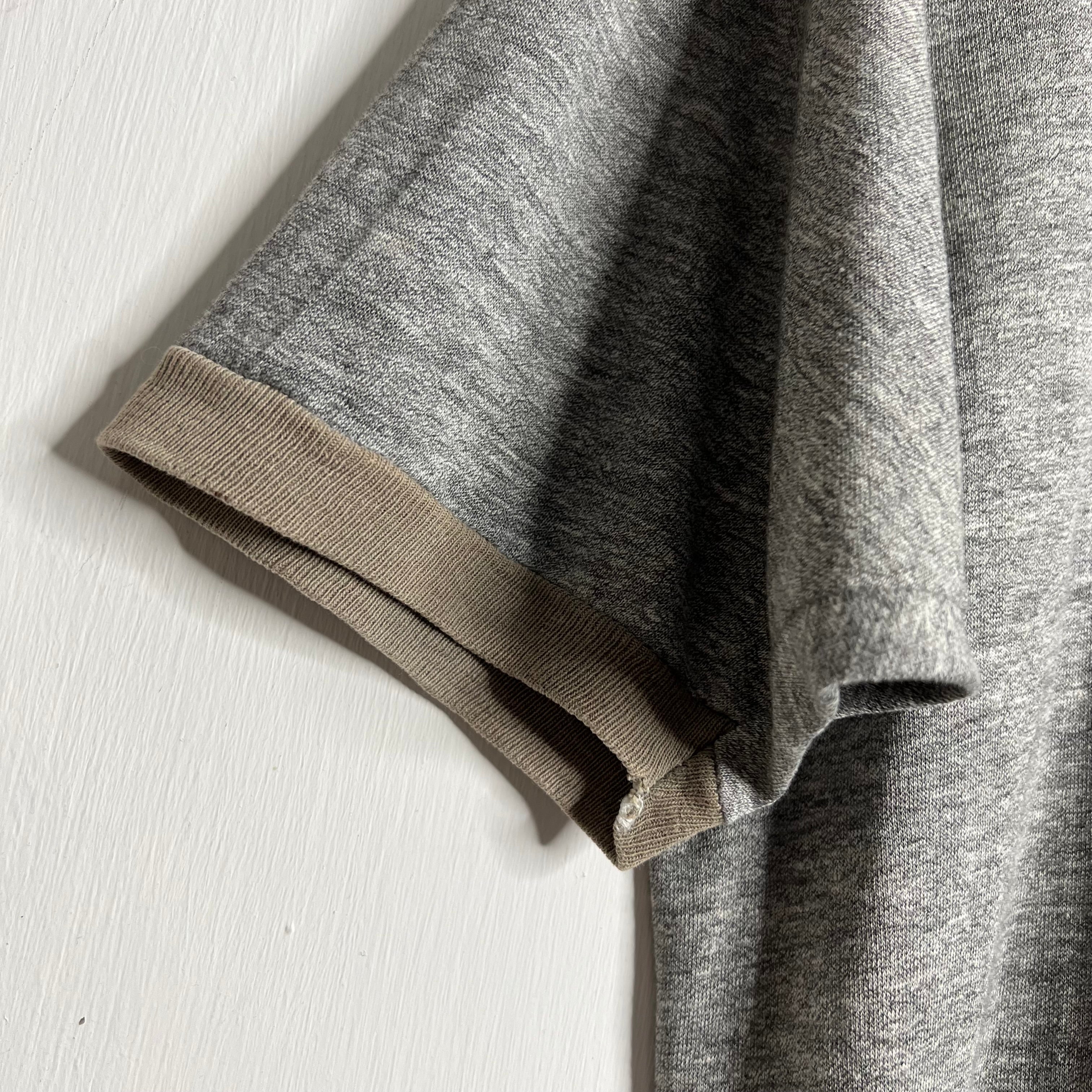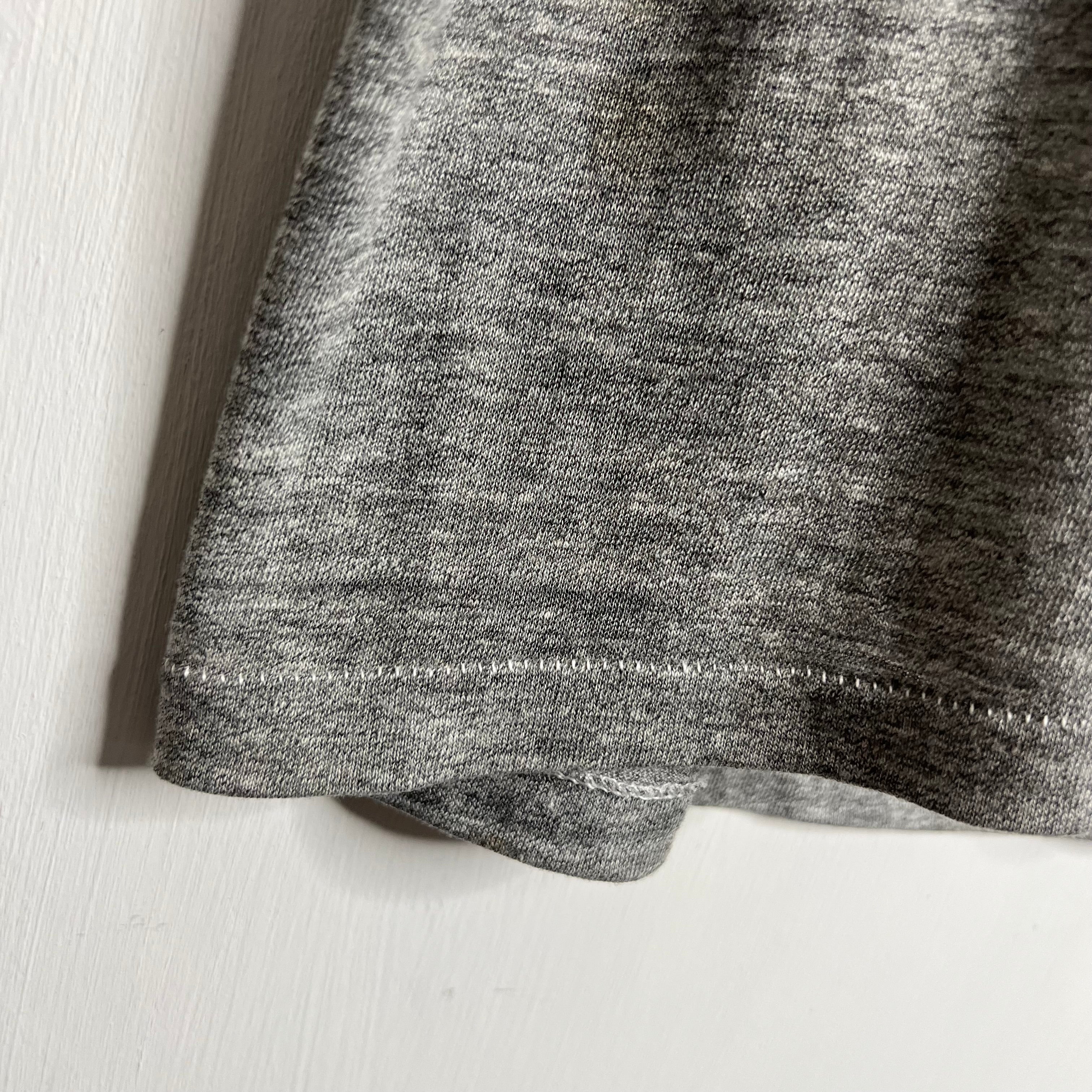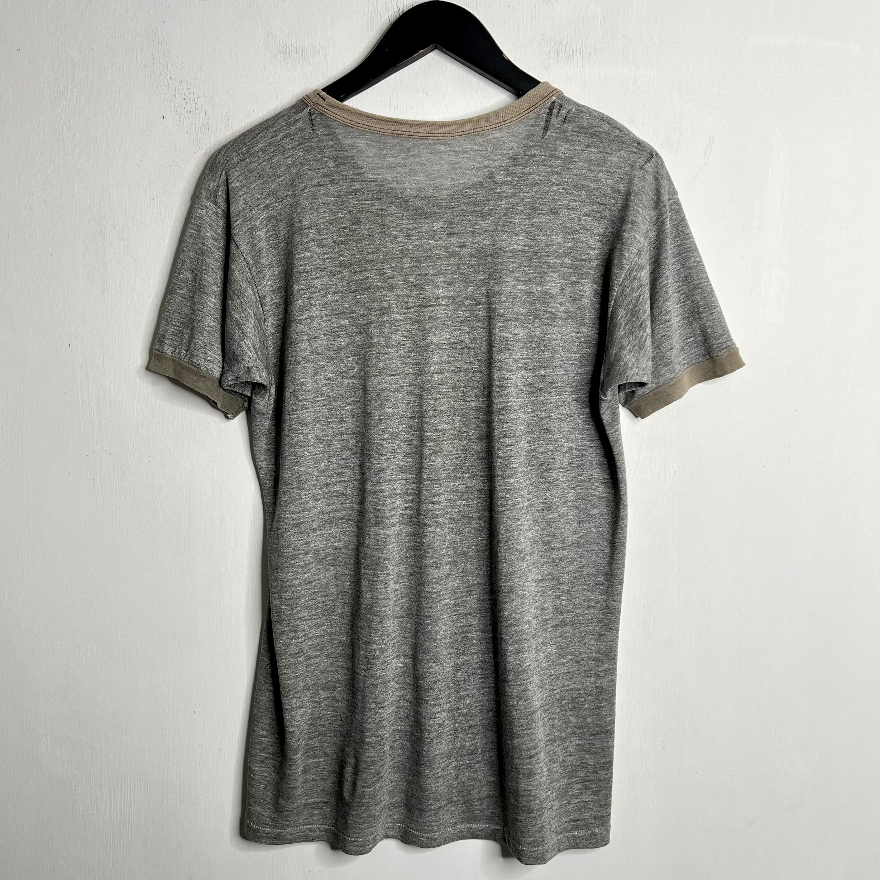 Raceways of yore. 20" armpit to armpit, 28.5" top of back collar to bottom. M/L. 50% cotton/50% polyester (may be a tri-blend with some rayon as it is extra soft). Made in the USA.