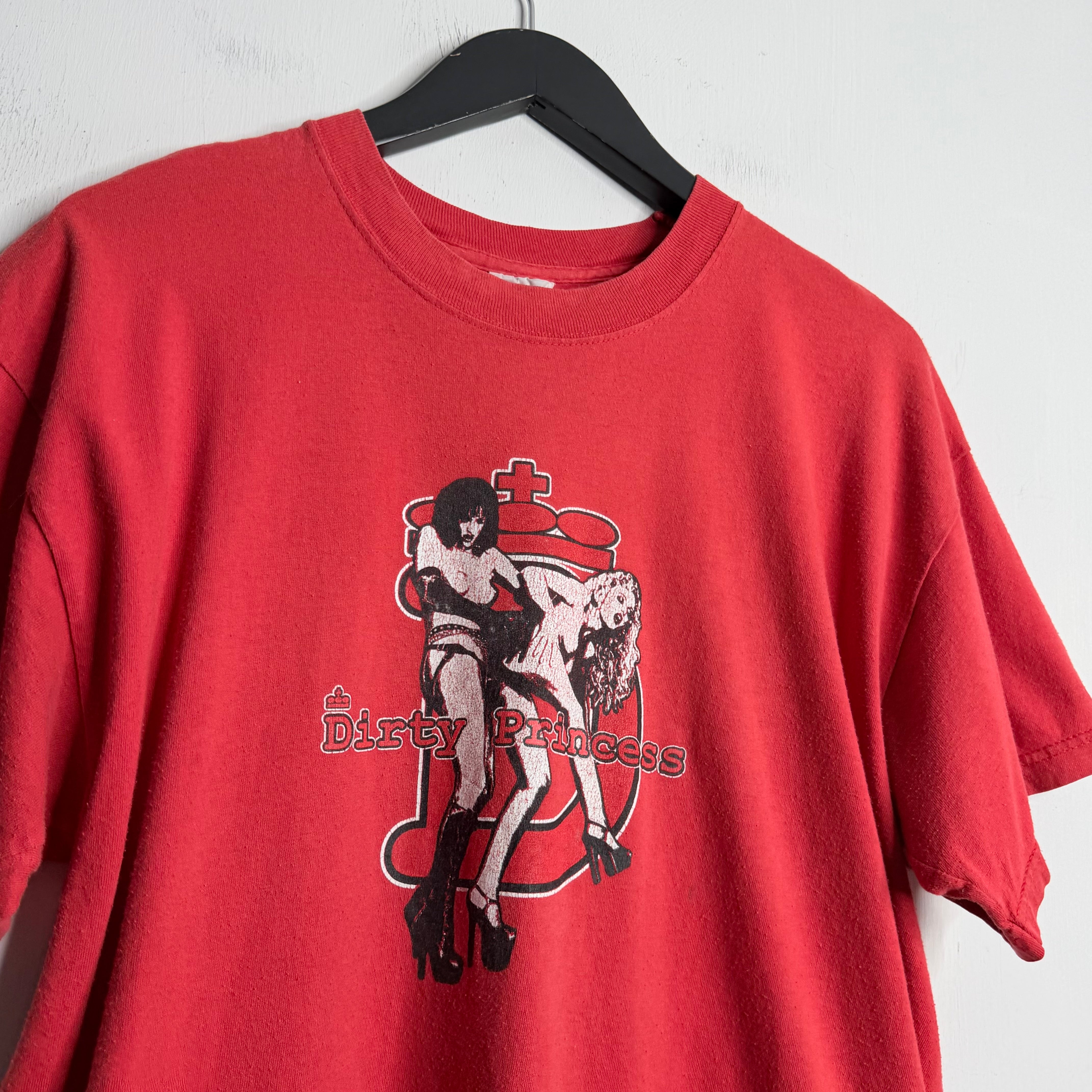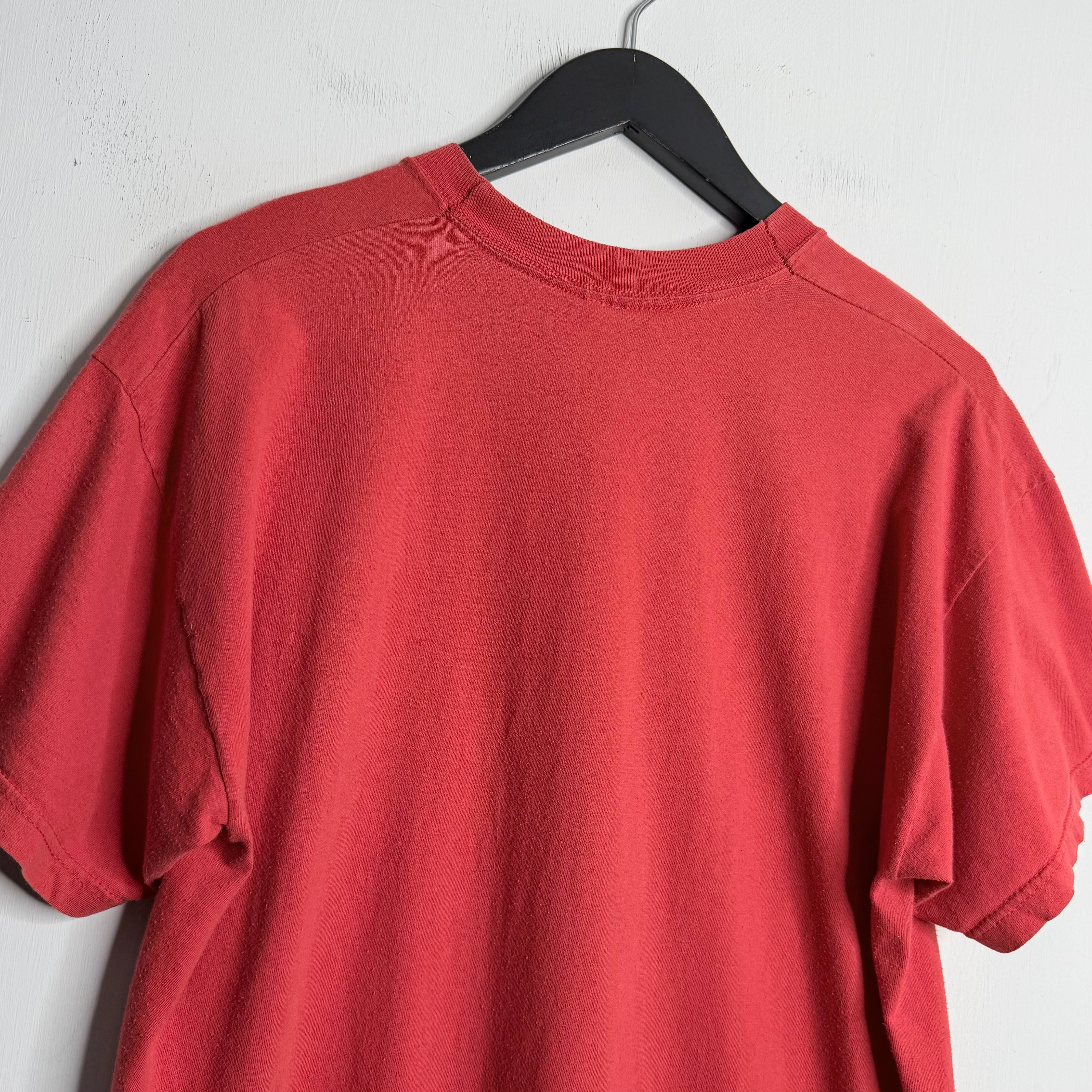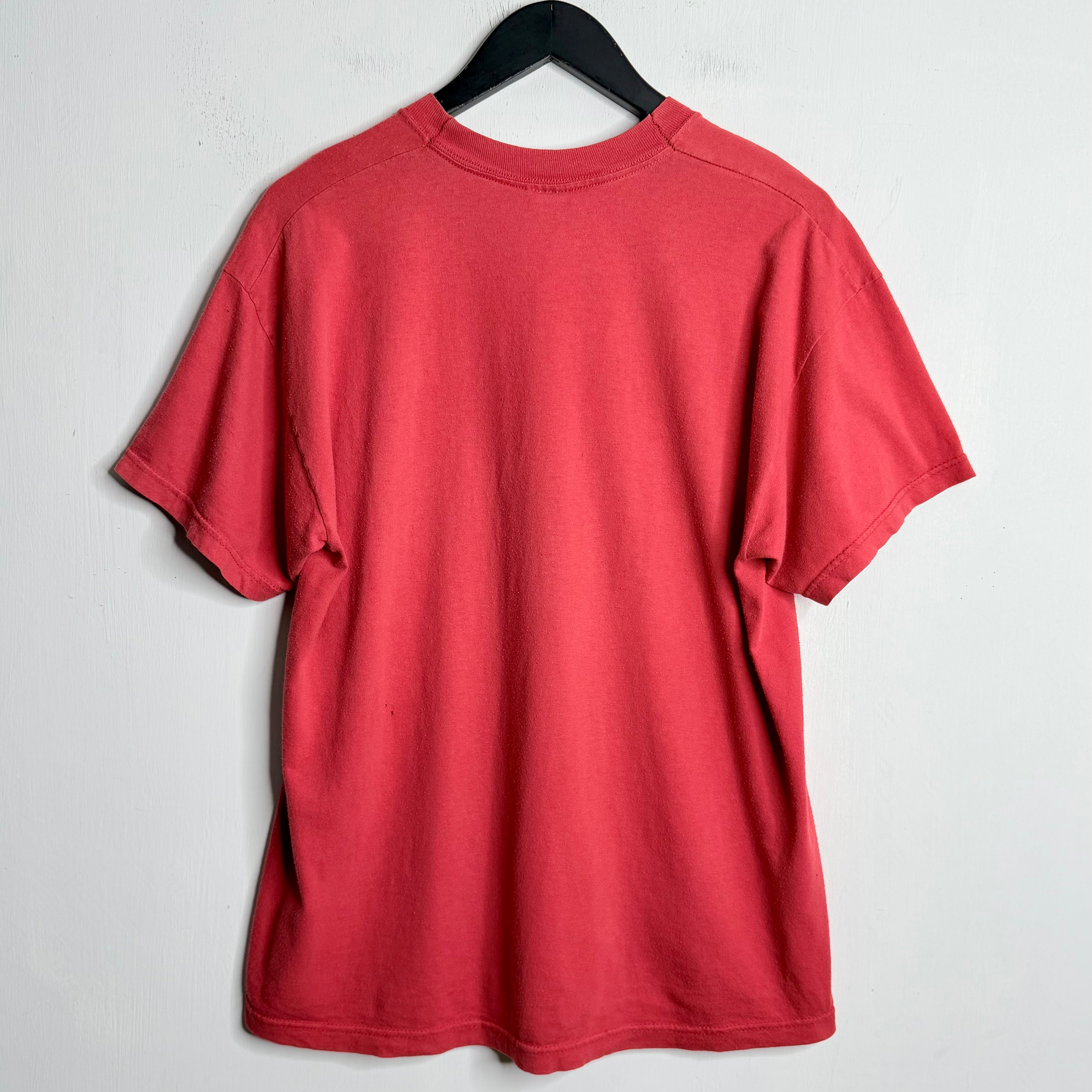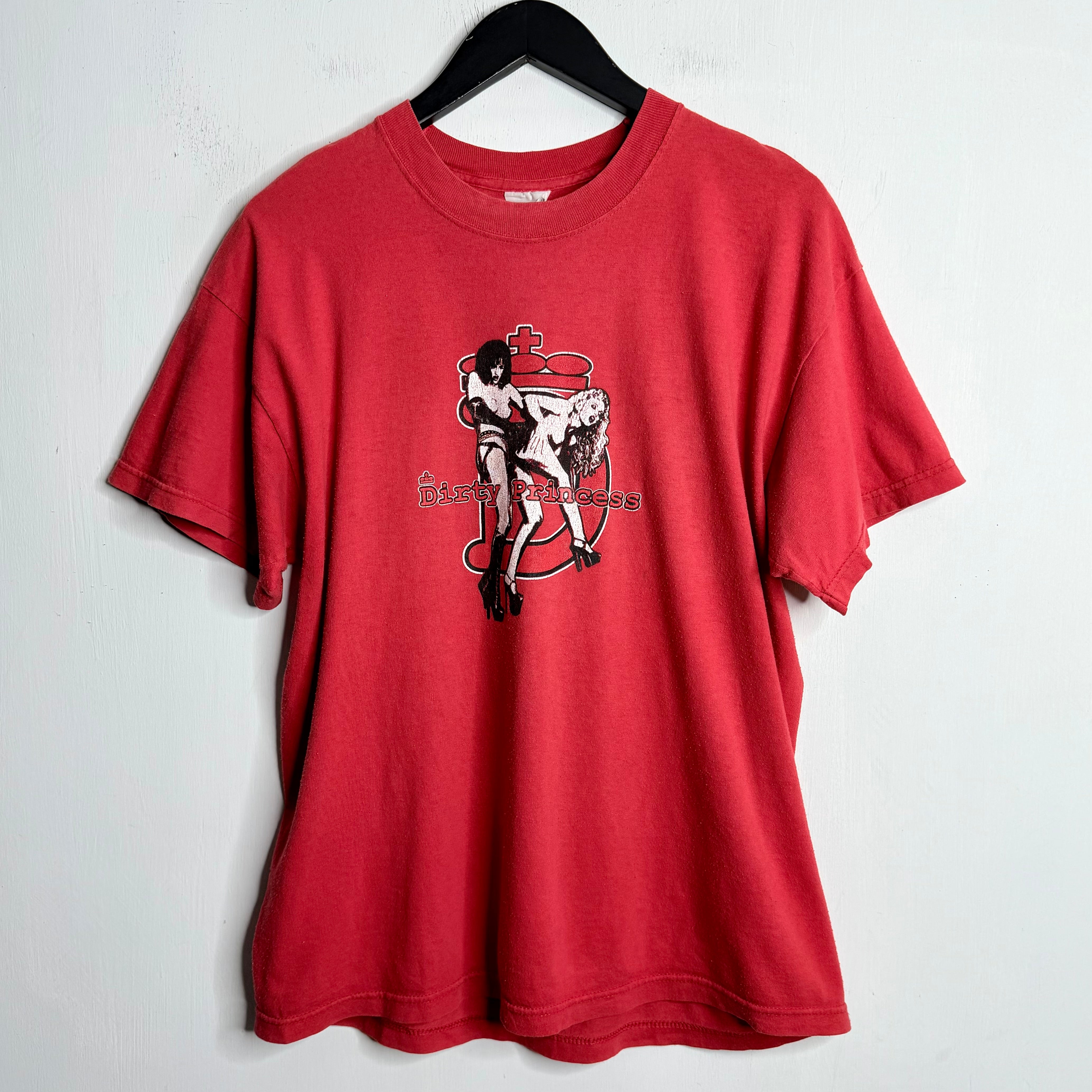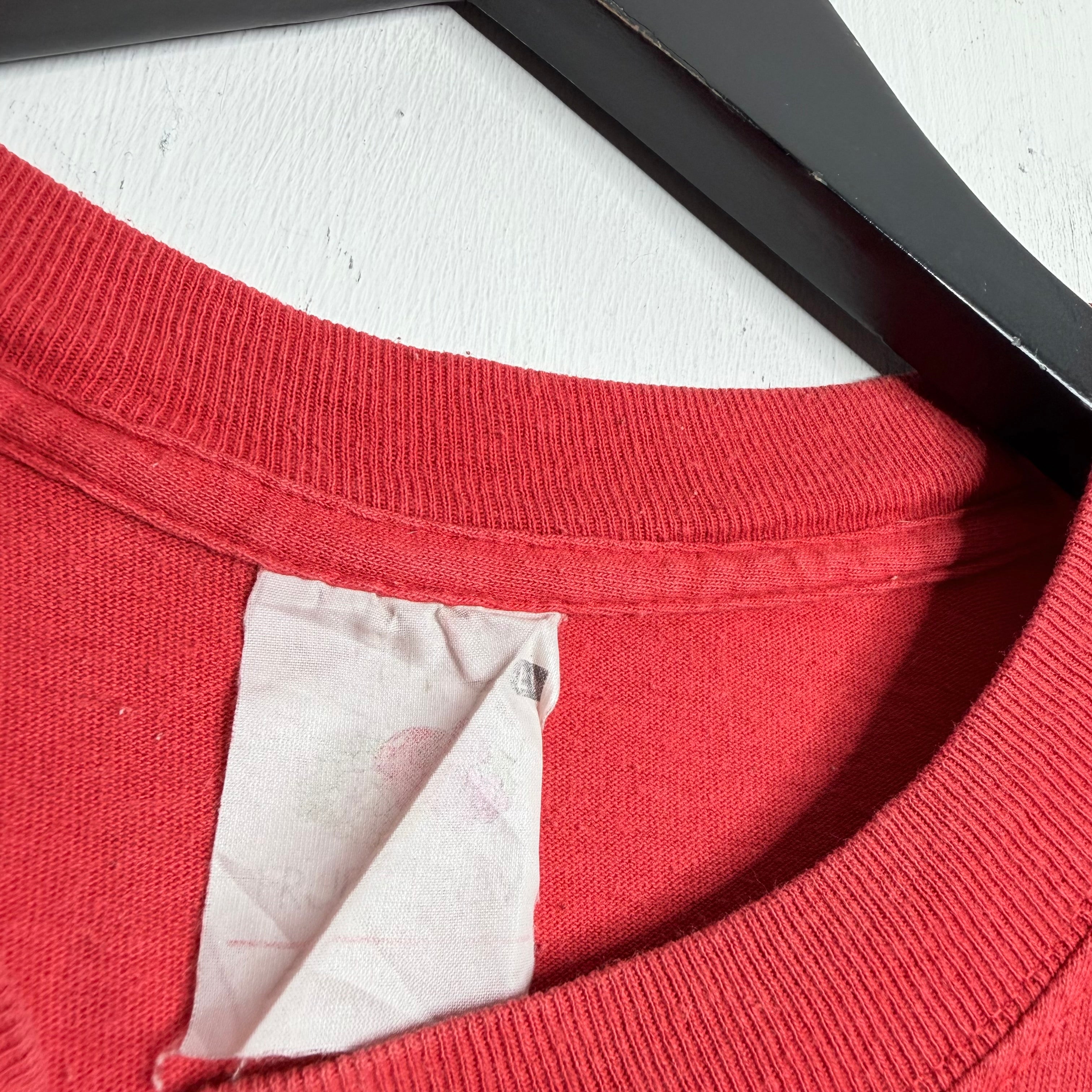 Saucy with a backbeat narrow and hard to mastser. 23" armpit to armpit, 27" top of back collar to bottom. Fruit Of The Loom says L. 100% cotton. Made in the Americas.