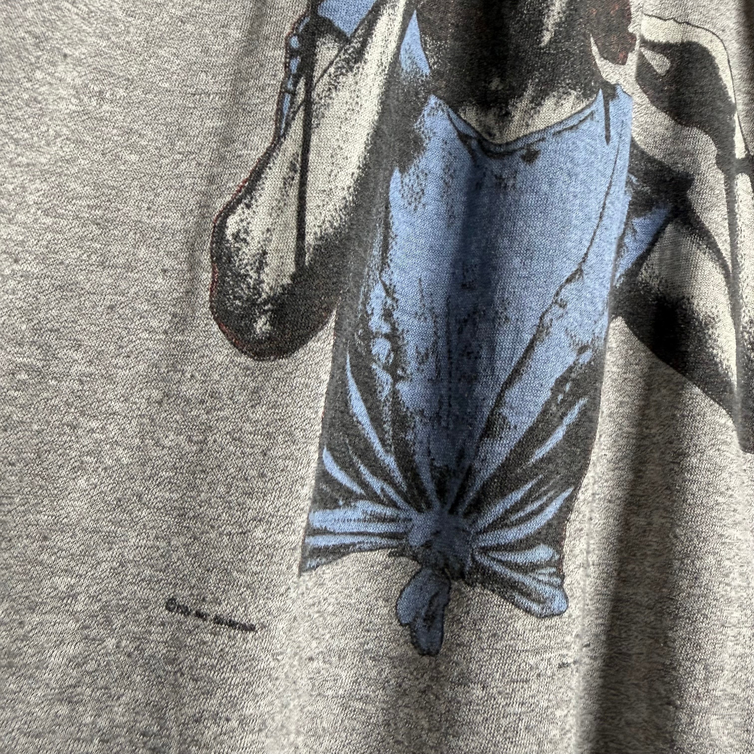 Myron Grombacher is a bad ass.. 20.5" armpit to armpit, 28" top of back collar to bottom. M/L. 50% cotton/50% polyester. Made in the USA.
