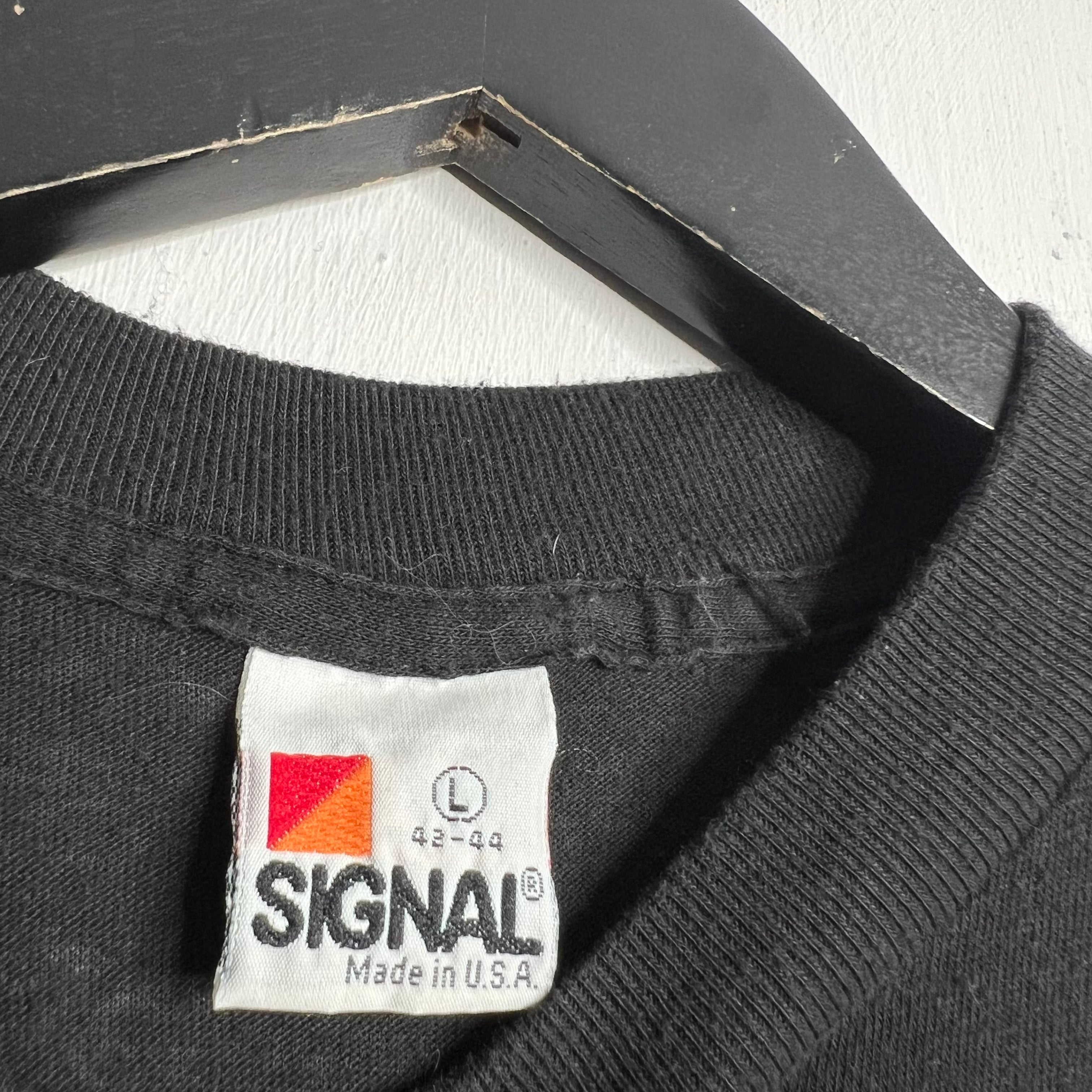 Had to dig thru the archive of Signal tags to date this one to 1988. 19.5" armpit to armpit, 29" top of back collar to bottom. Signal says L, fits like a long M. 50% cotton/50% polyester. Made in the USA.