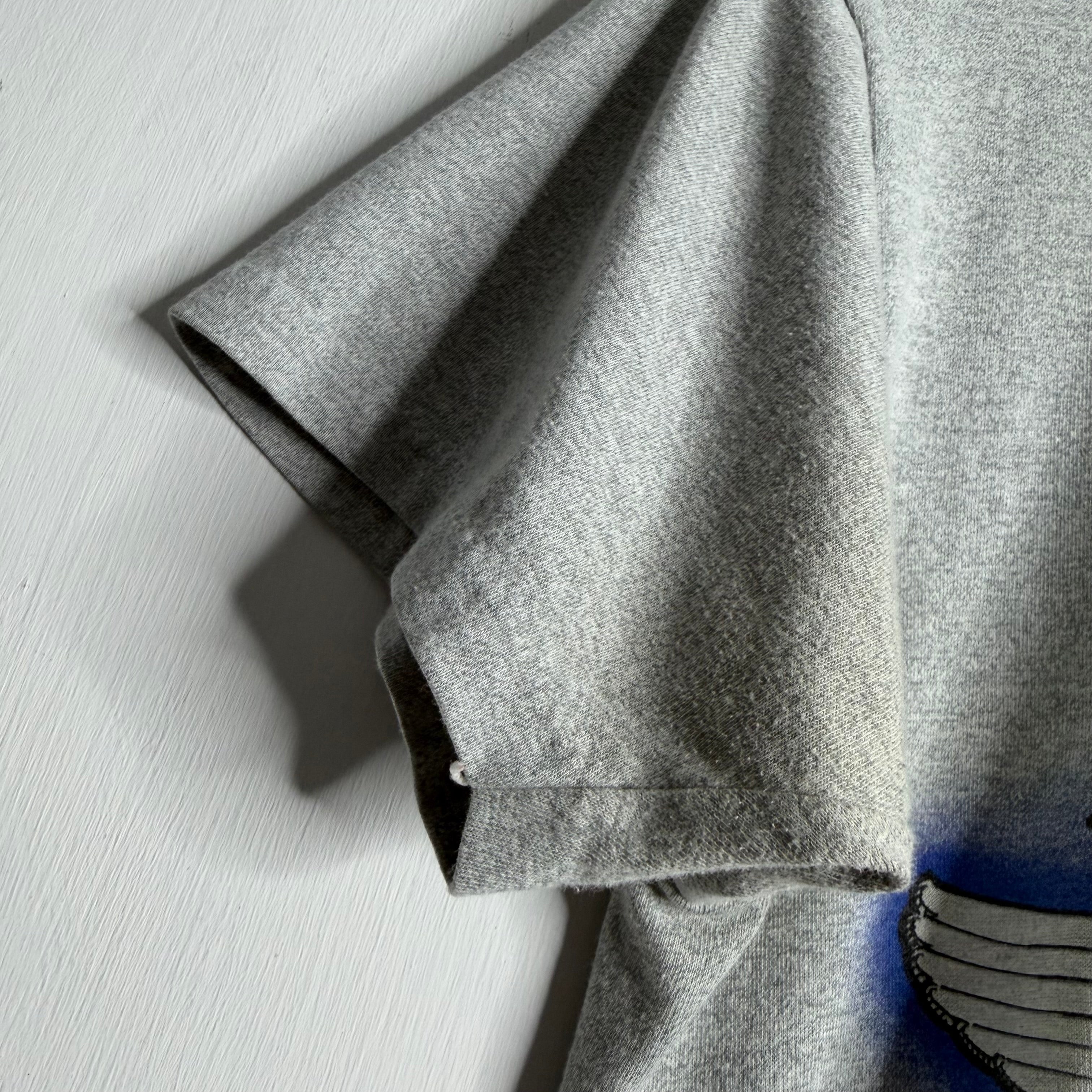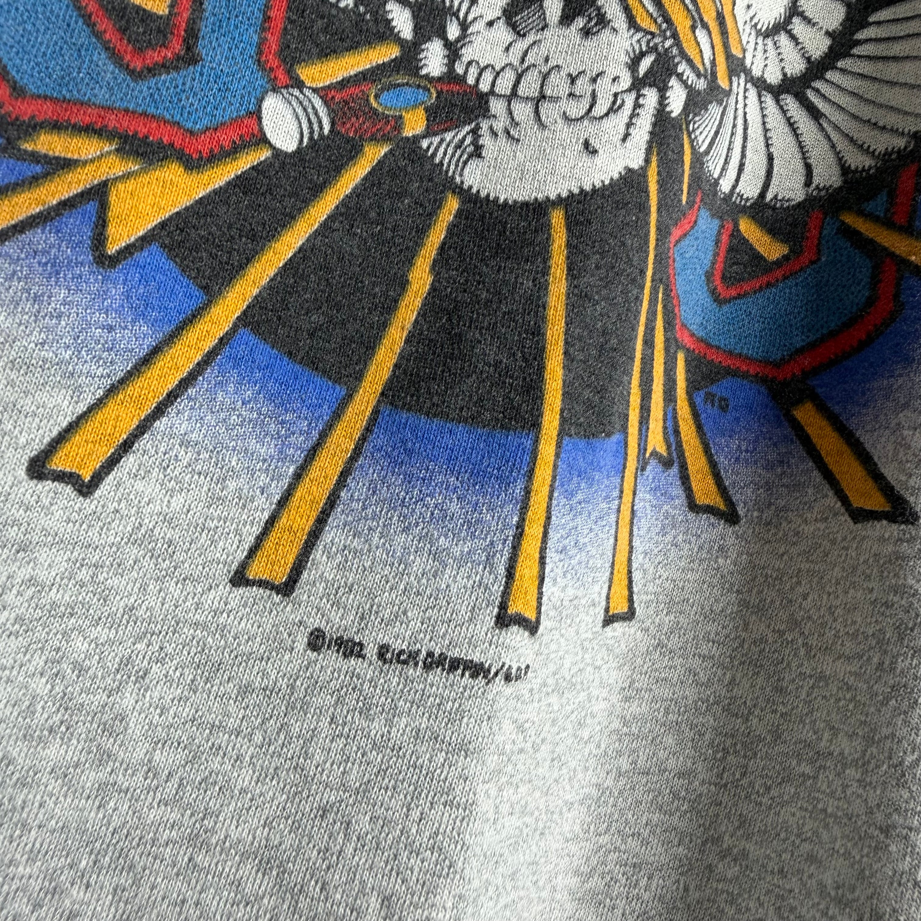 Stanley Mouse A.M.F. 19" armpit to armpit, 27" top of back collar to bottom. M. 50% cotton/50% polyester. Made in the USA.