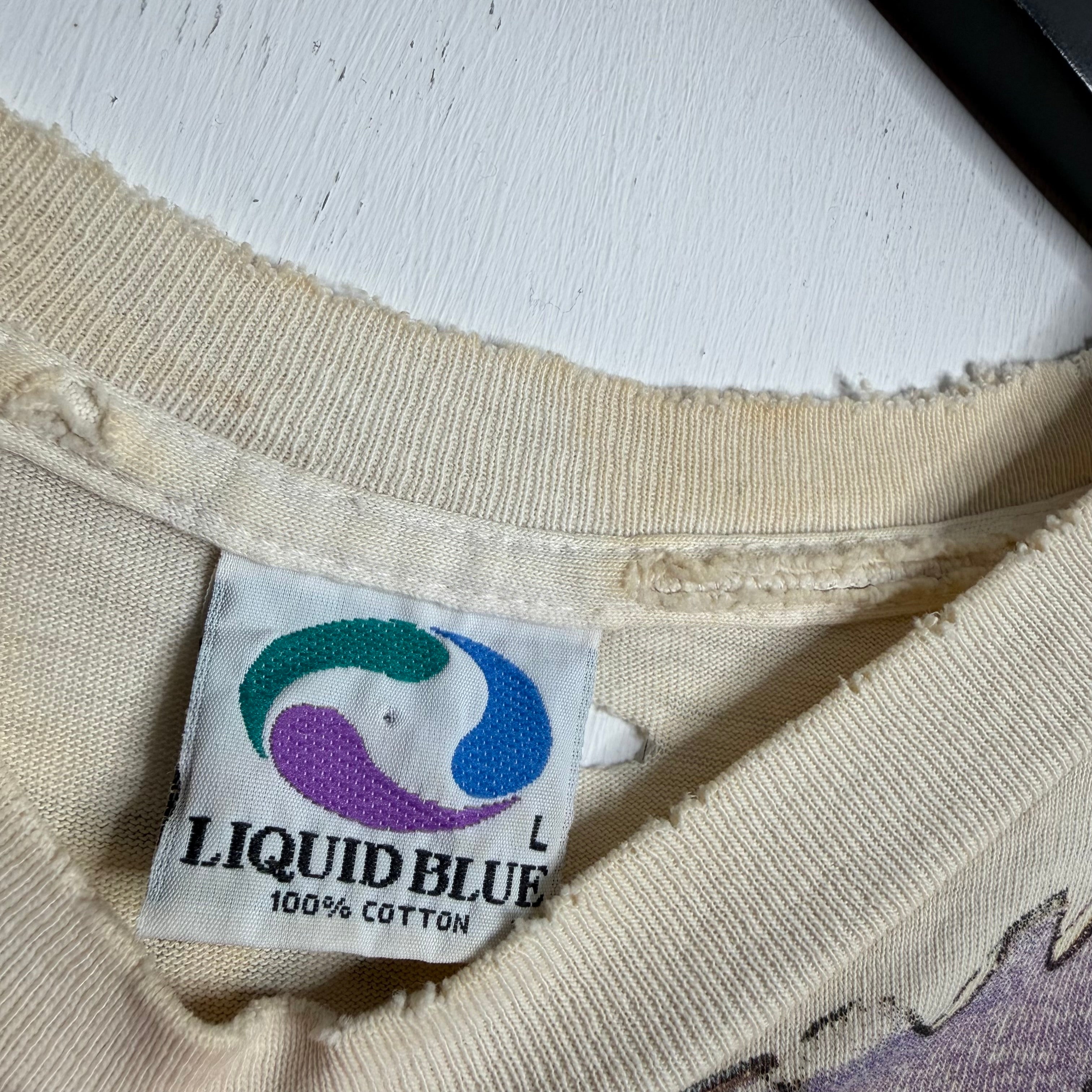 Run of shows at the legendary MSG circa '91 with an insane fade and wear. 22" armpit to armpit, 27" top of back collar to bottom. Liquid Blue says L. 100% cotton. Made in the USA.