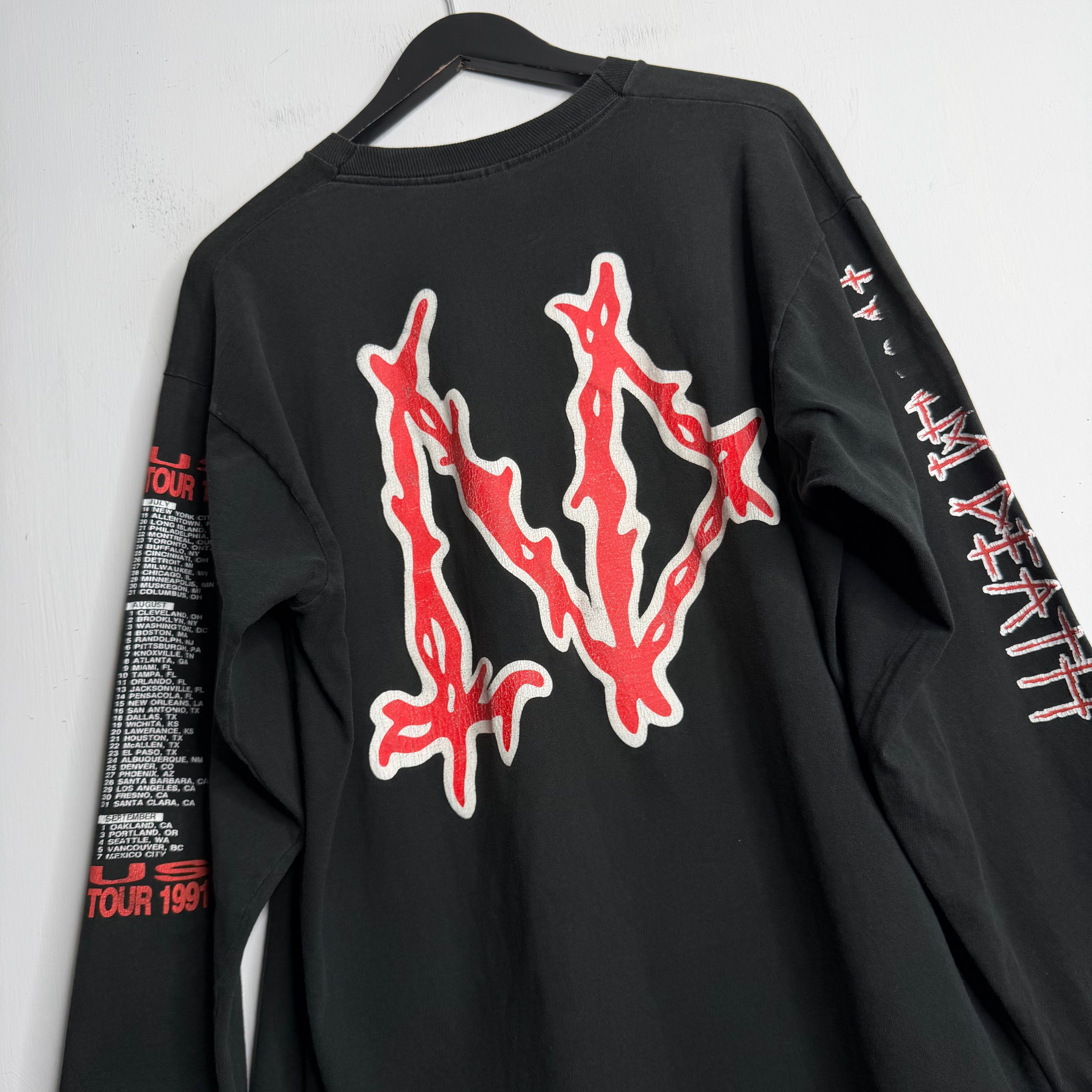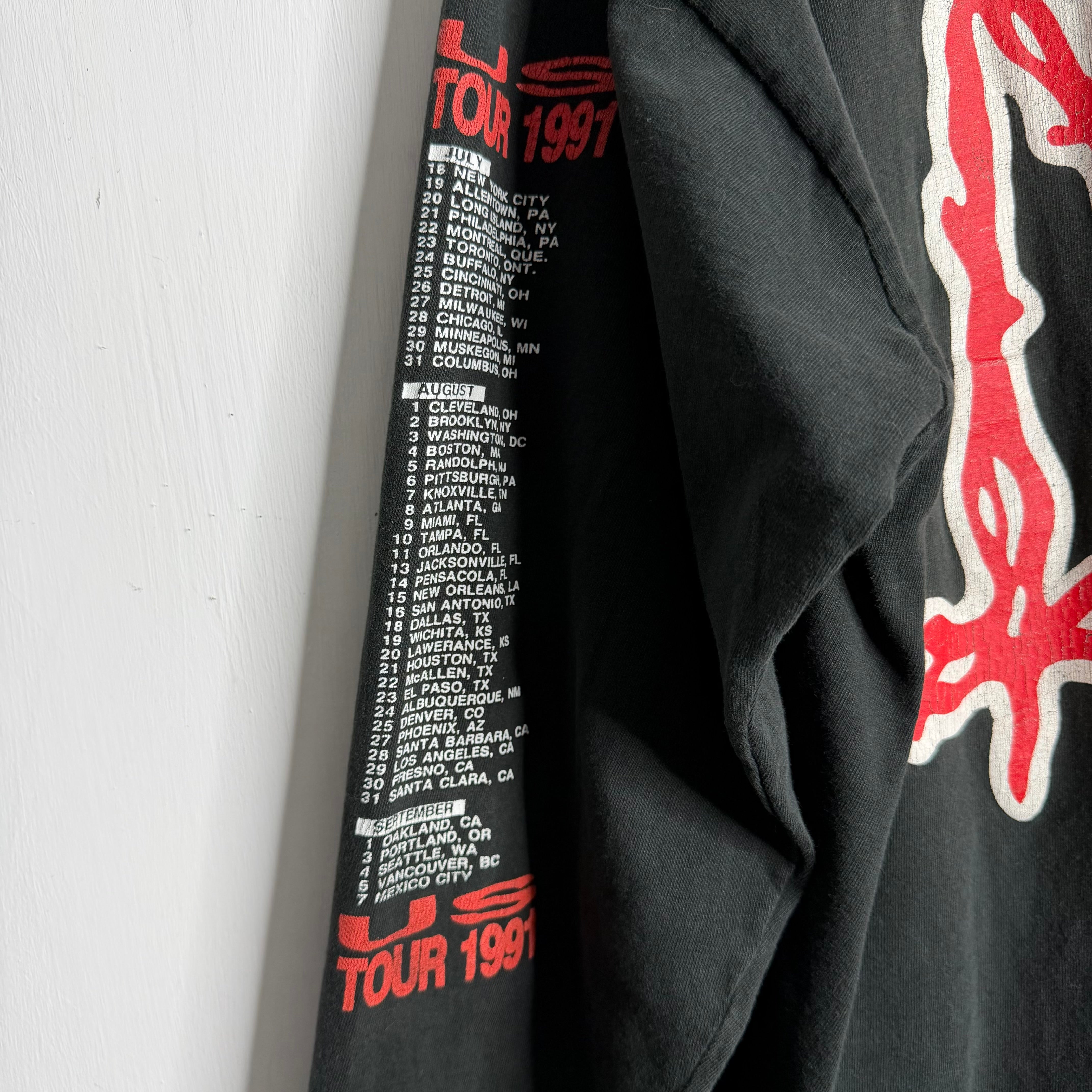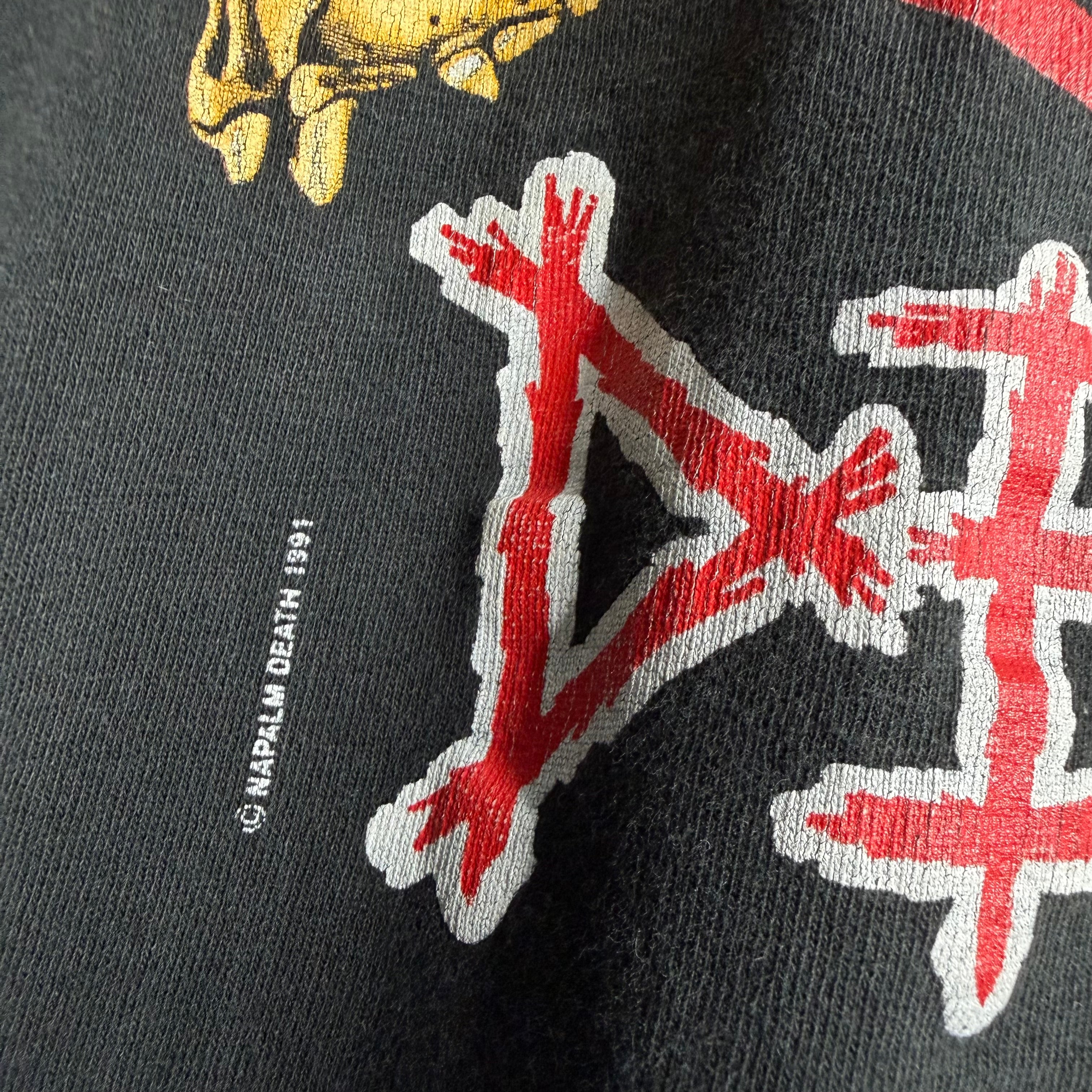 Slayful graphics inundate senses. 25" armpit to armpit, 29.5" top of back collar to bottom. FOTL says XL, fits slightly big. 100% cotton. Made in the USA.