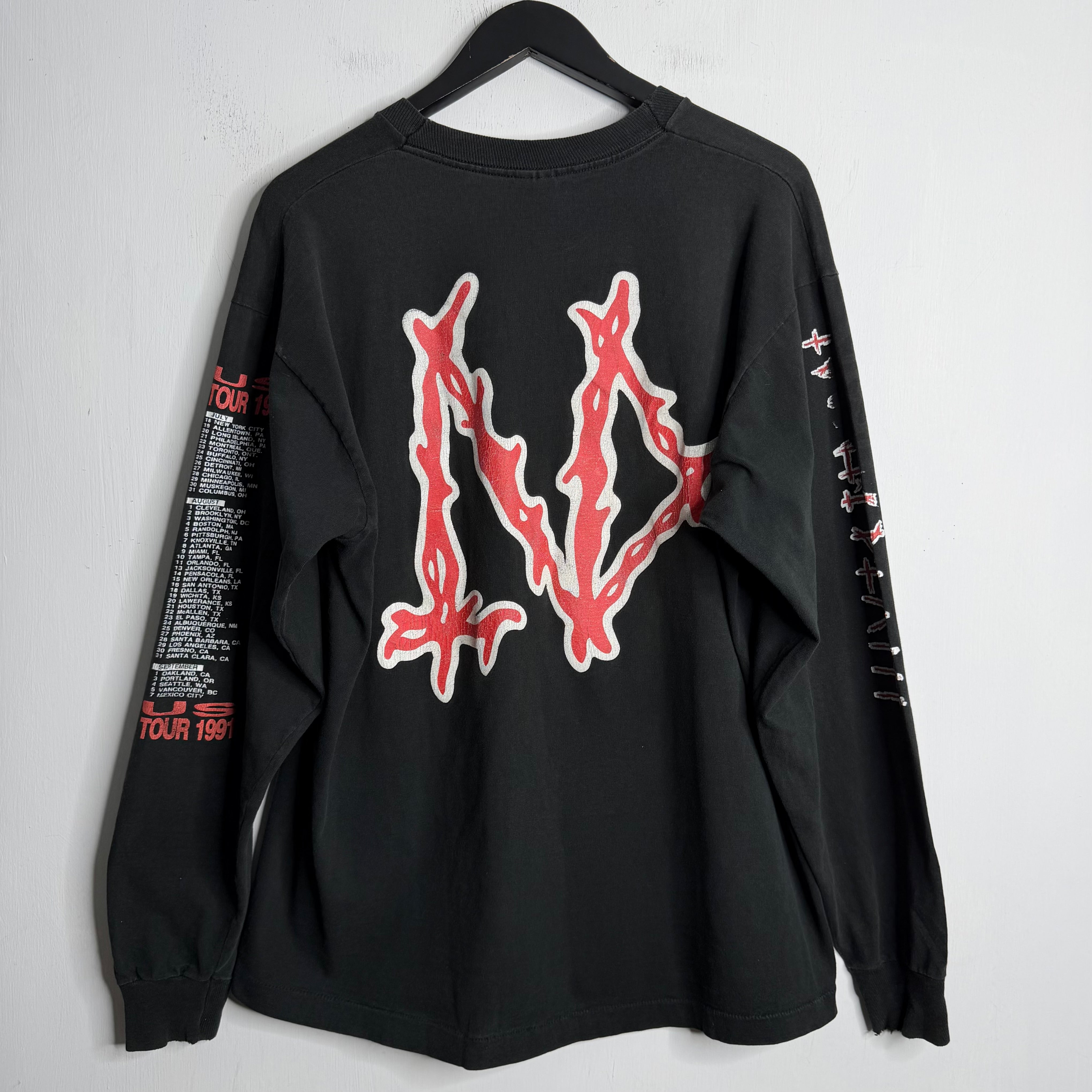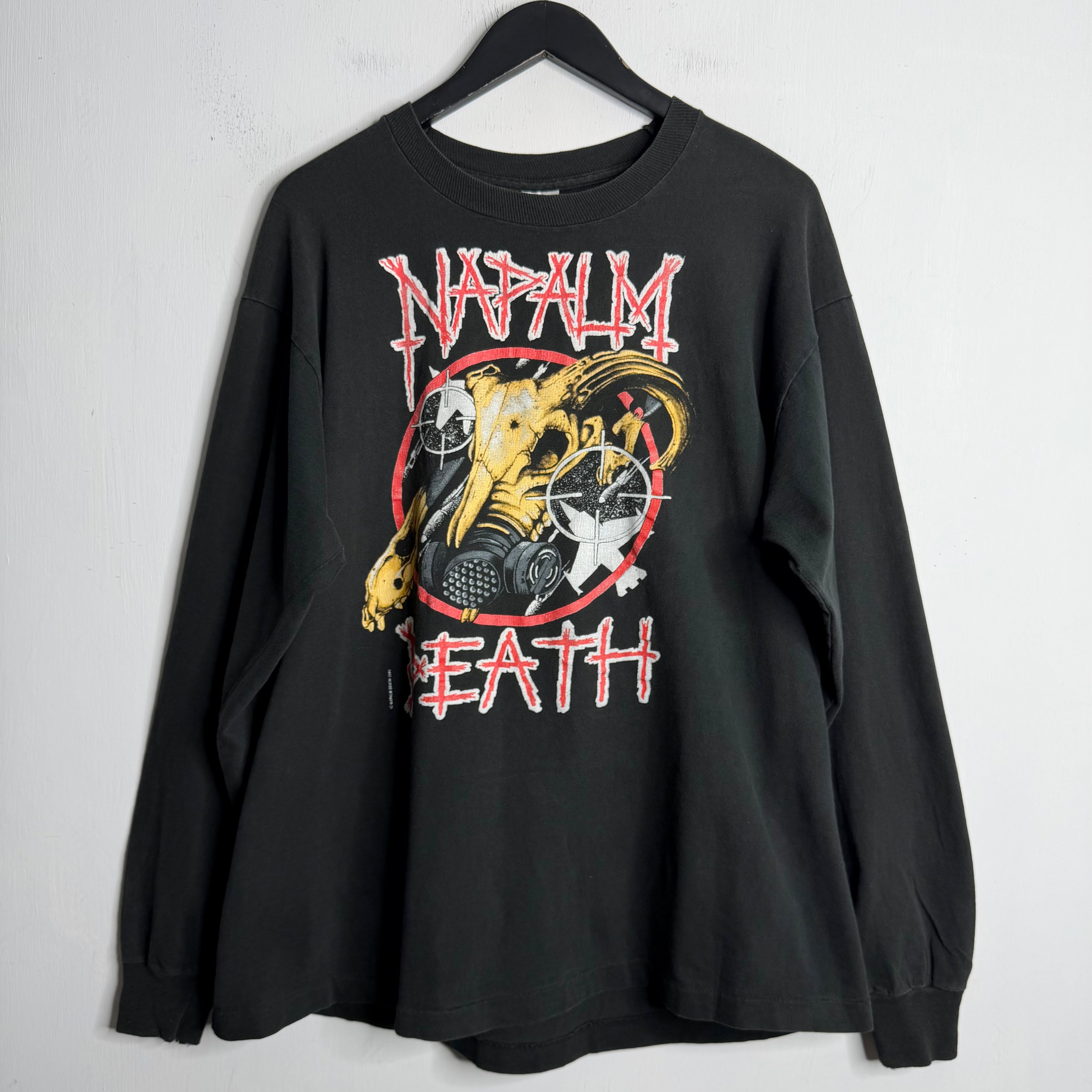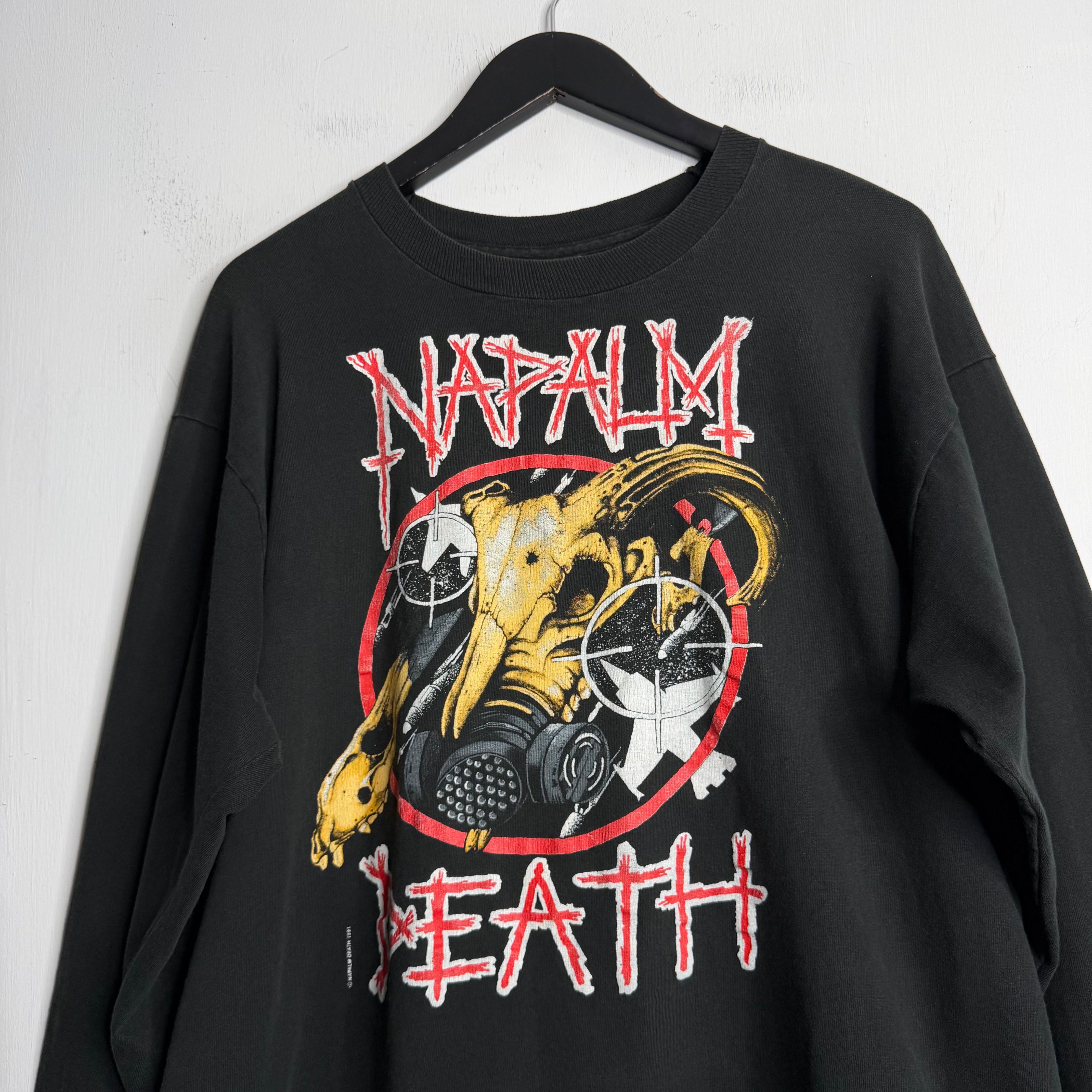 Slayful graphics inundate senses. 25" armpit to armpit, 29.5" top of back collar to bottom. FOTL says XL, fits slightly big. 100% cotton. Made in the USA.