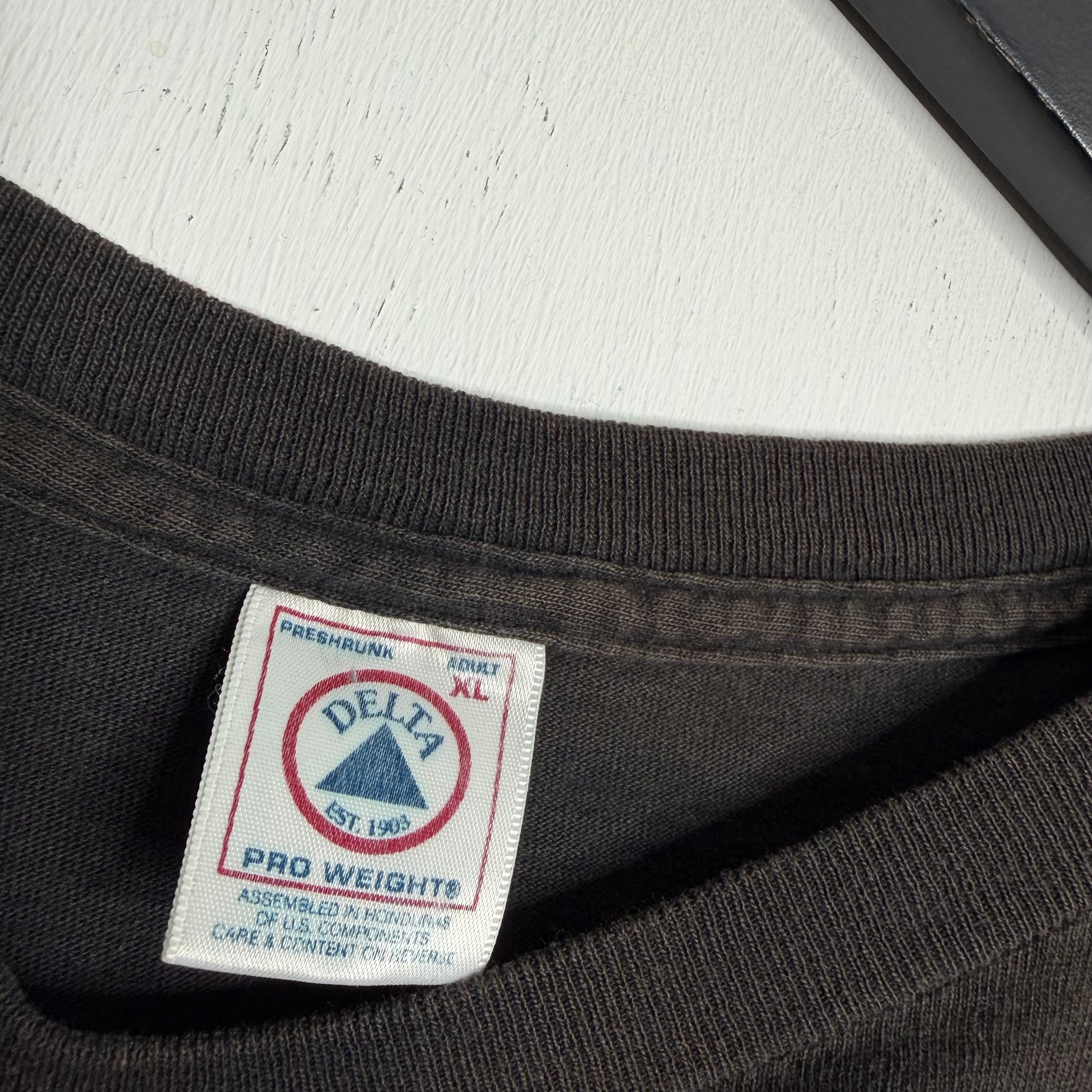 None more black. 25" armpit to armpit, 30" top of back collar to bottom. Delta says XL. 100% cotton. Made in the USA.