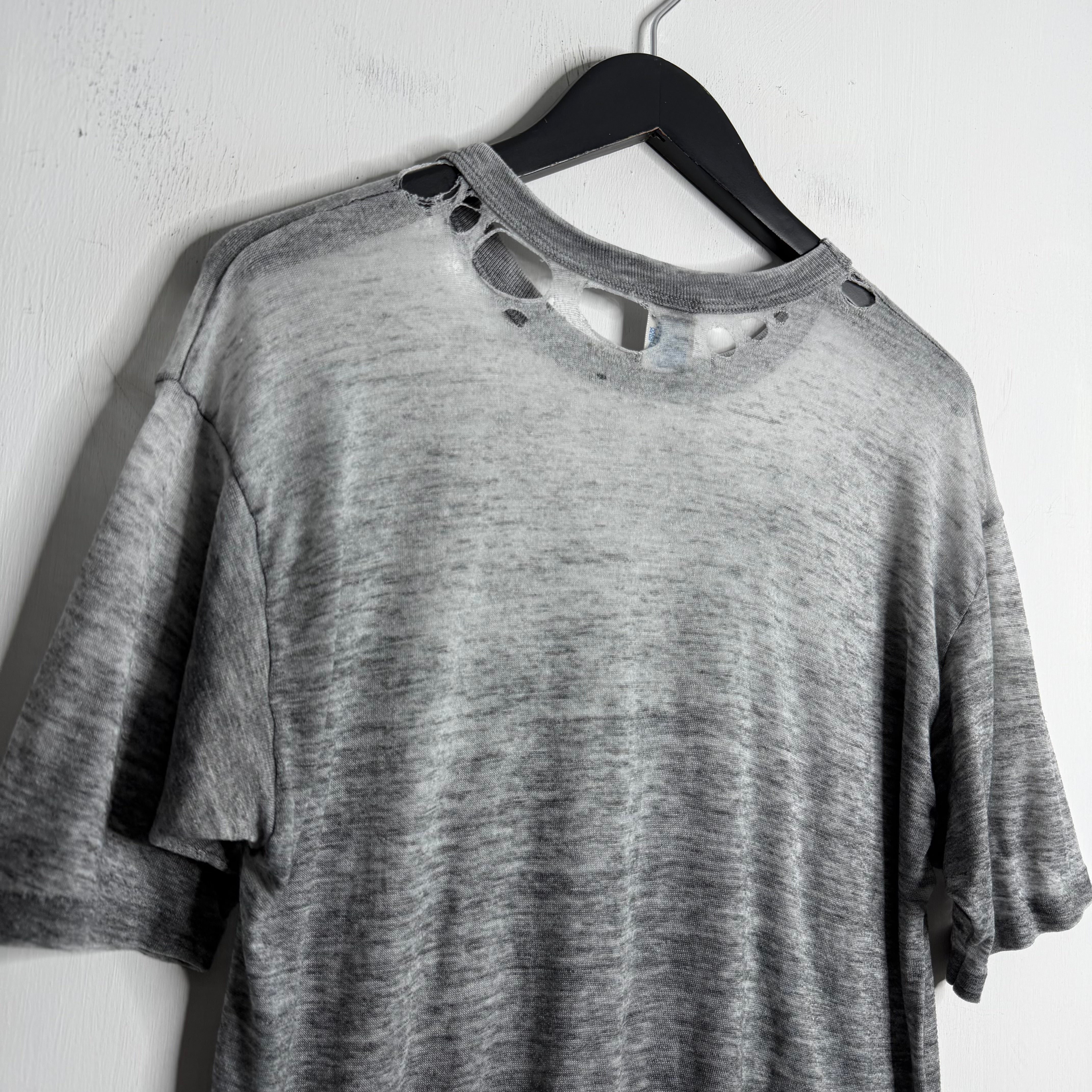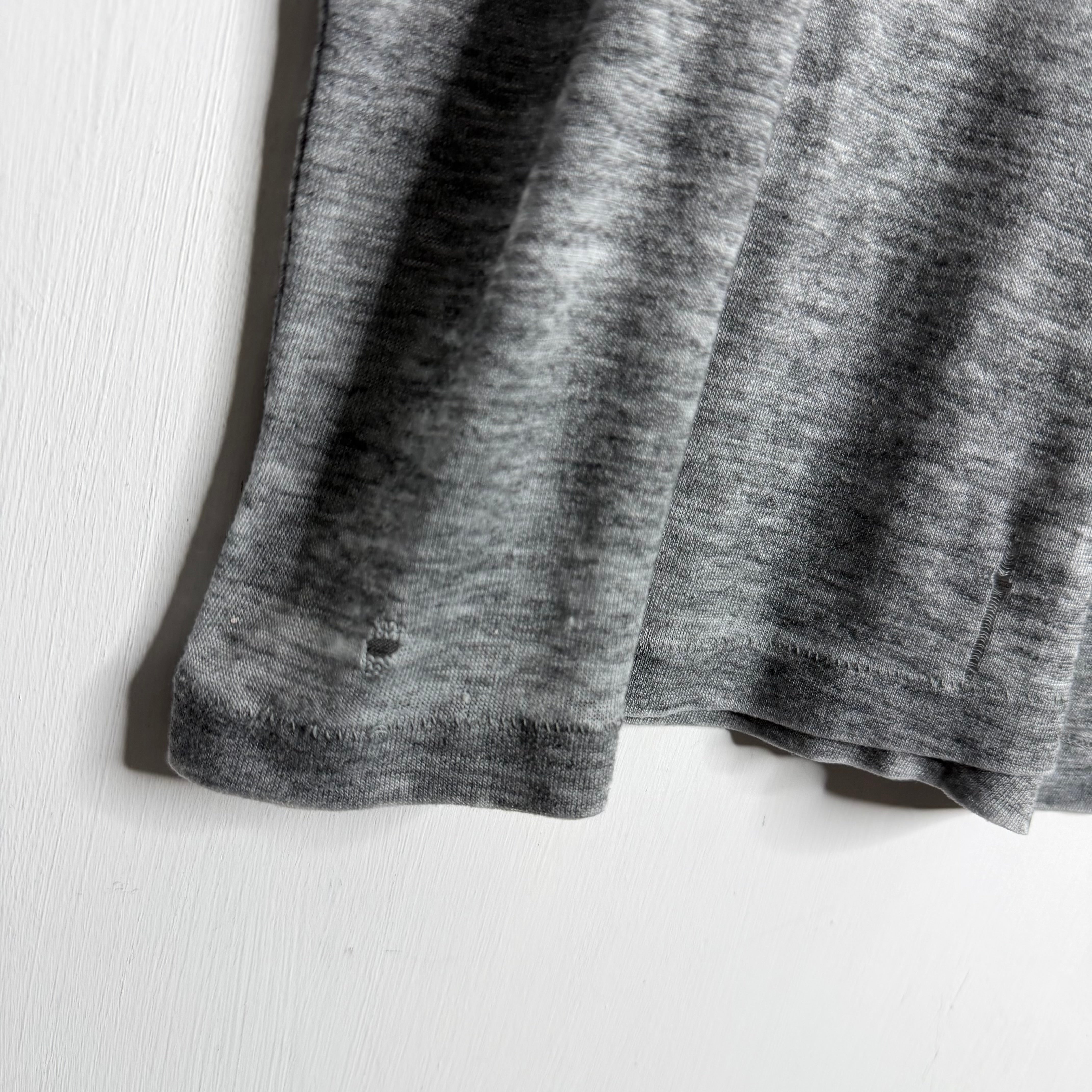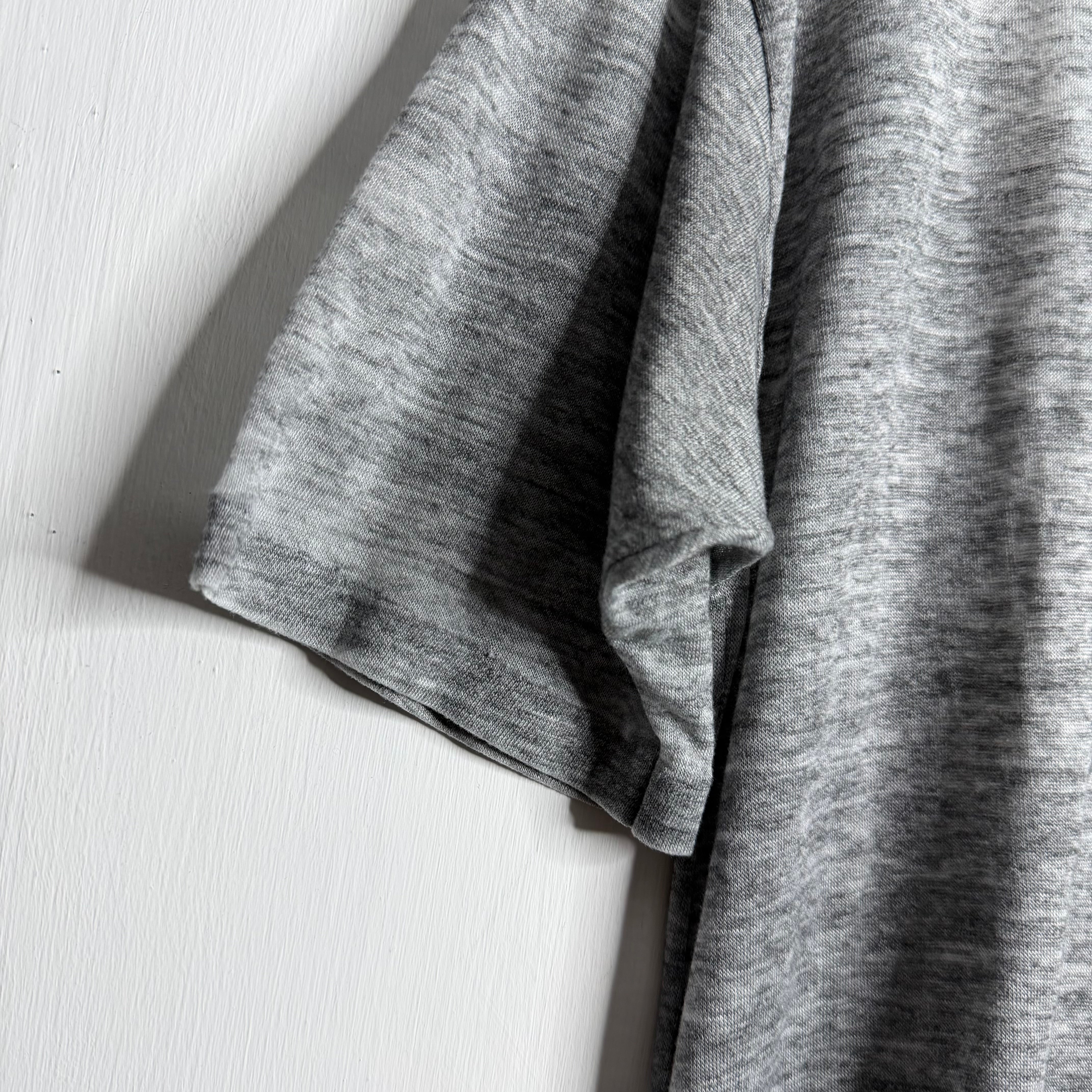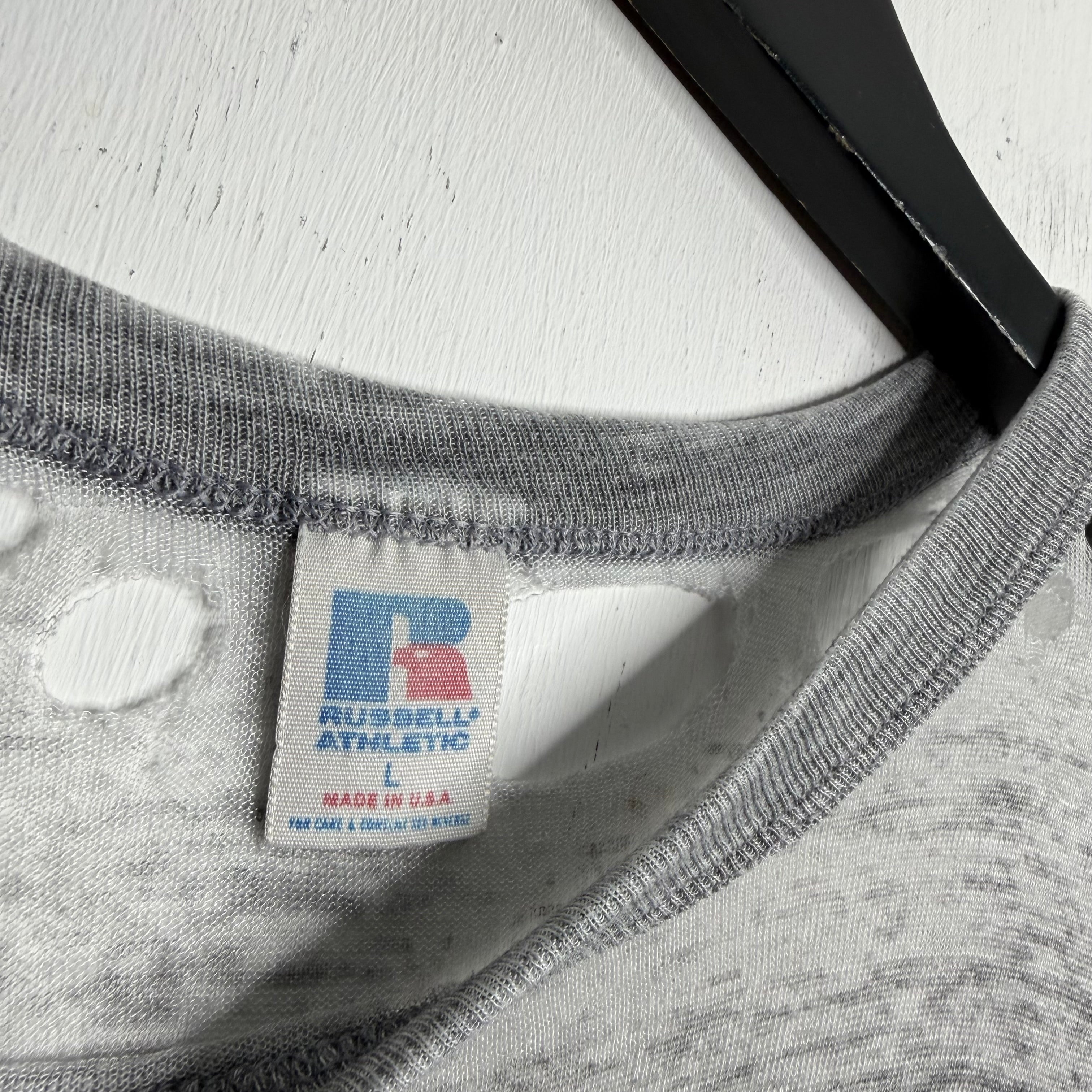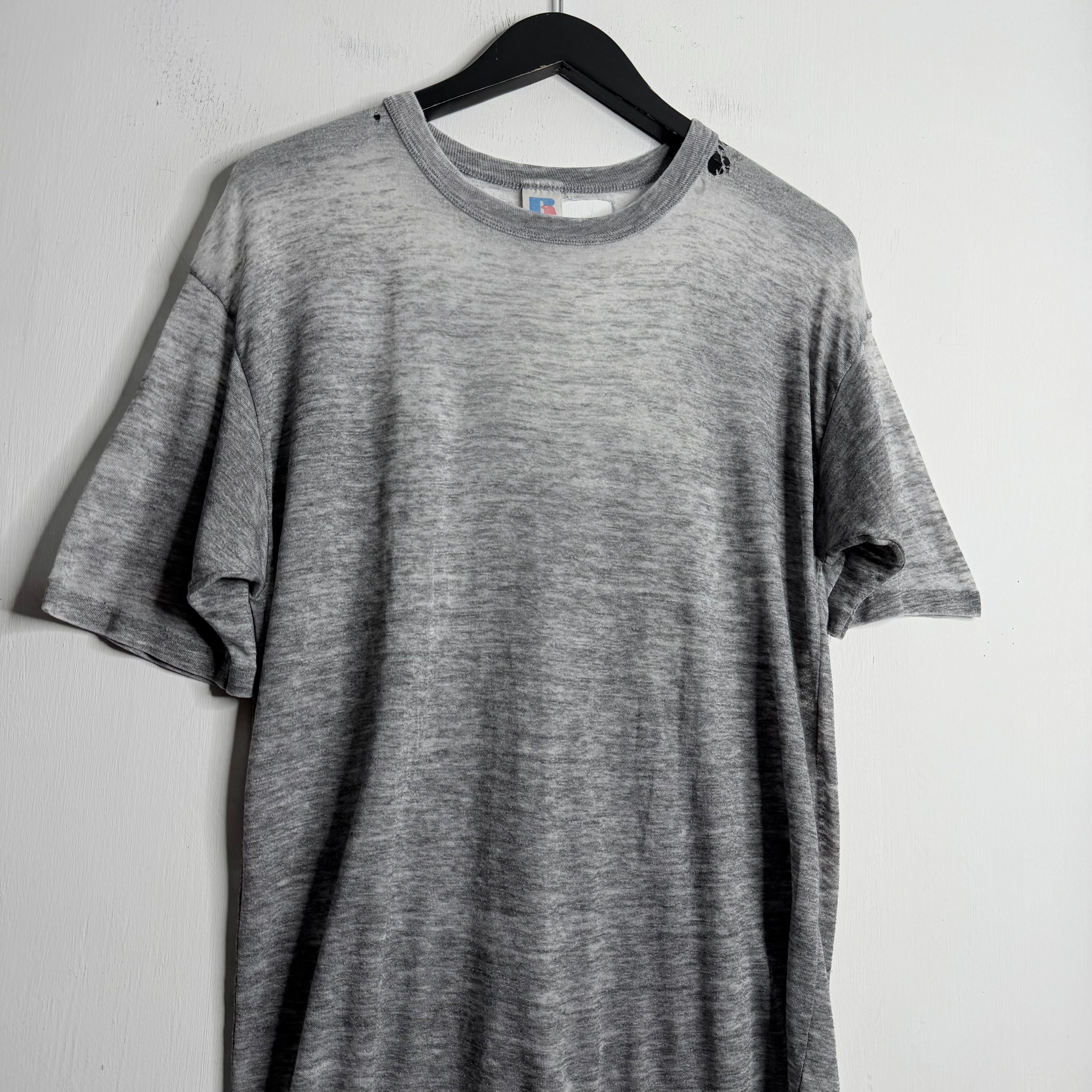 A tri-blend thrasher.. 22" armpit to armpit, 27" top of back collar to bottom. Wide Russell says L, fits slightly small. 40% cotton/47% polyester./13% rayon. Made in the USA.