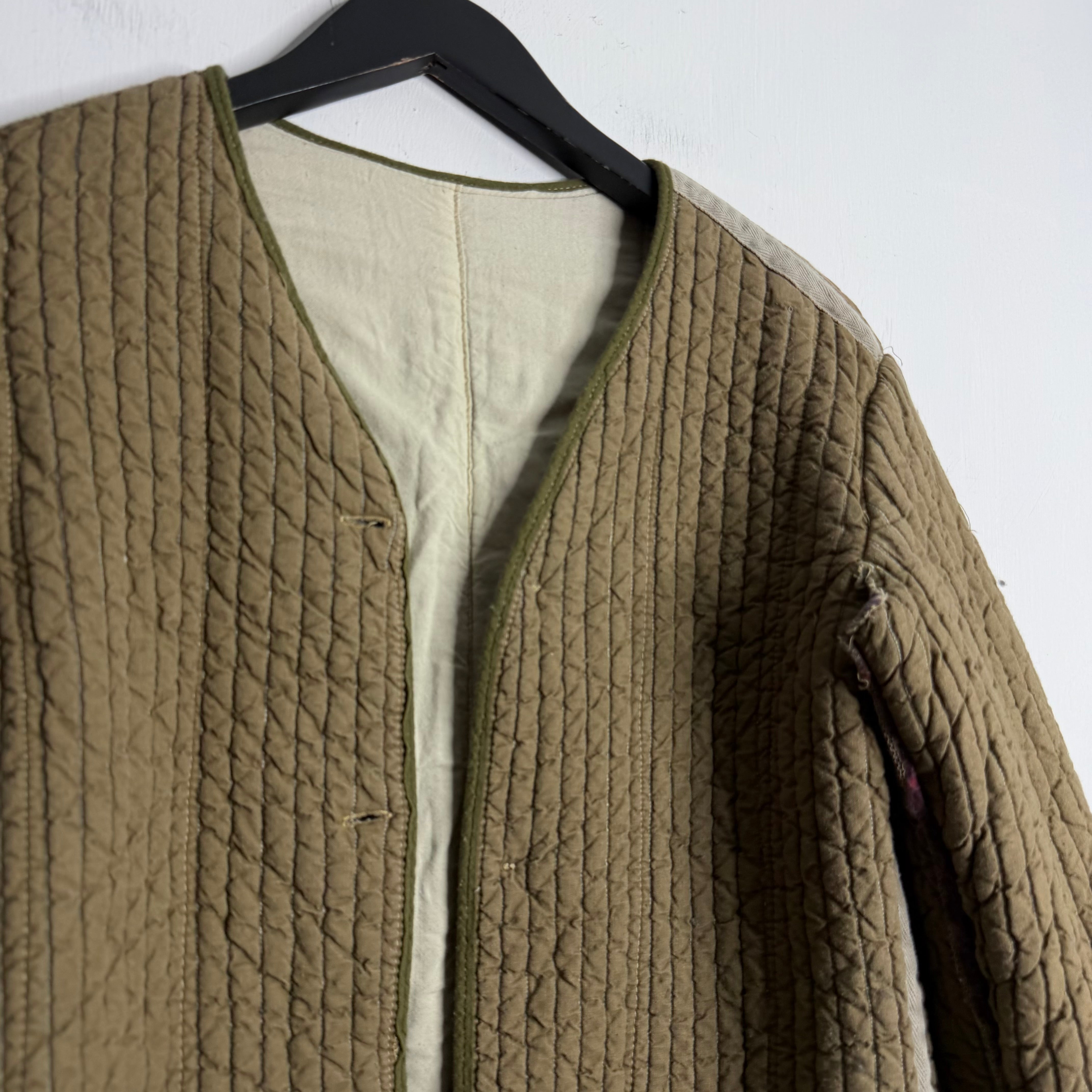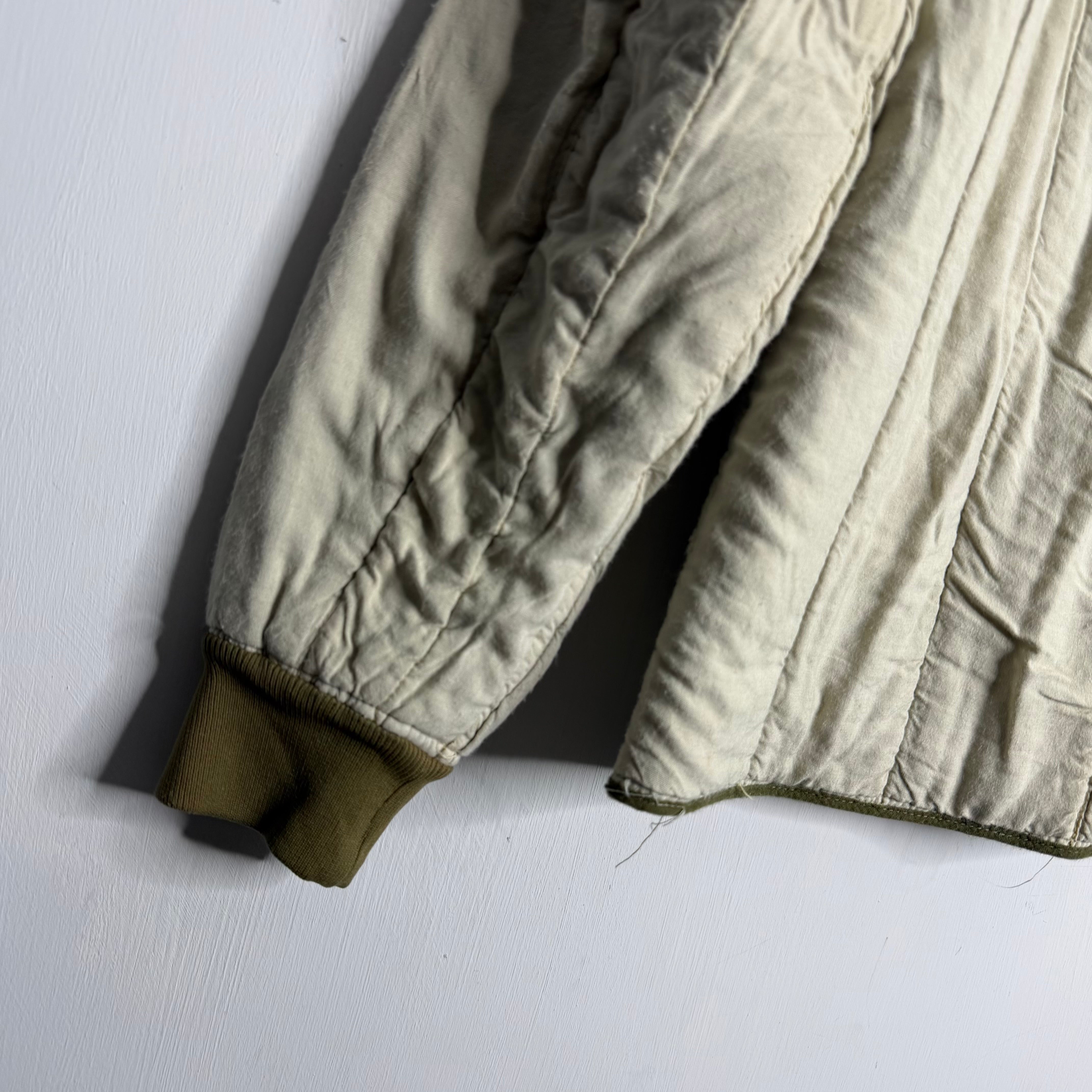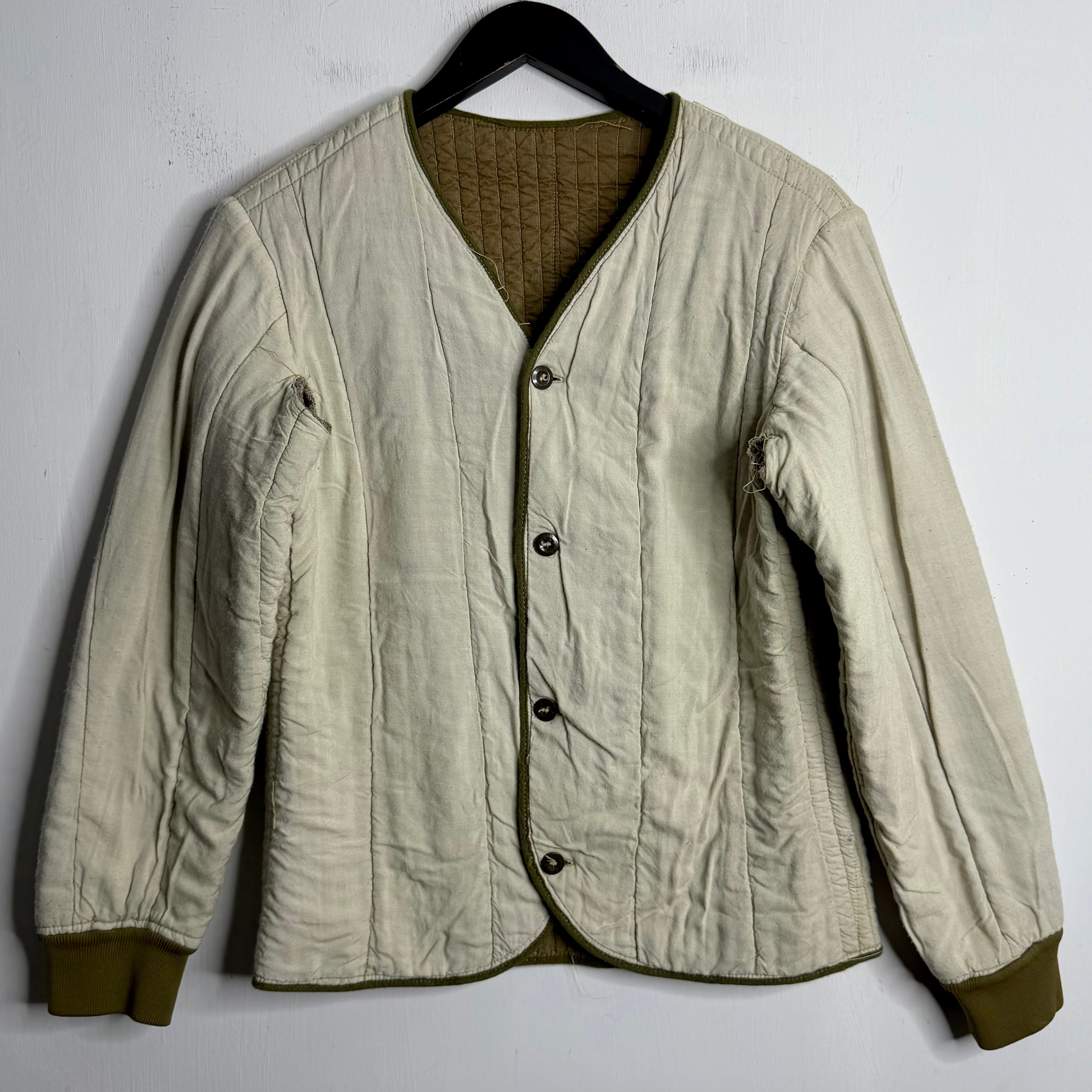 Reversible, 2 jackets-in-one Cold-war relic from behind the Iron Curtain keeps you warm. 19" armpit to armpit, 24.5" top of back collar to bottom, 16" across shoulders, 18.5" underarm inseam, 23" top of sleeve inseam. S/M. 100% cotton. Made in Eastern Europe.