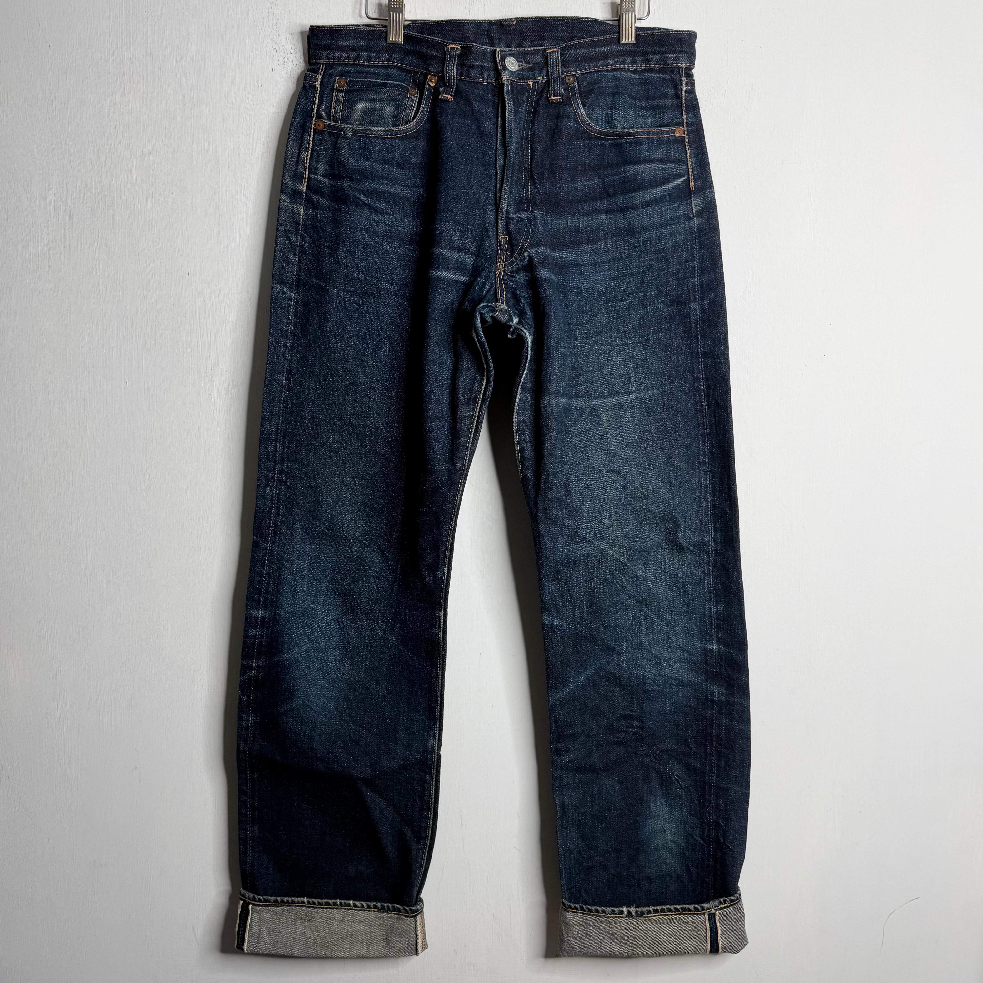 Dark indigo with grainy whiskering and fading make this pair of 1950s tribute Osaka-made Levi's a gotta grab. Features include red line selvedge, hidden back pocket rivets, leather back waistband patch, single stitch back pockets and waistband, watch pocket selvdge, well-ounced denim built to last decades. 32" waist, 34" inseam, 44" waist to bottom hem. Fit is standard, cut is semi-loose. 100% cotton. Made in Japan.