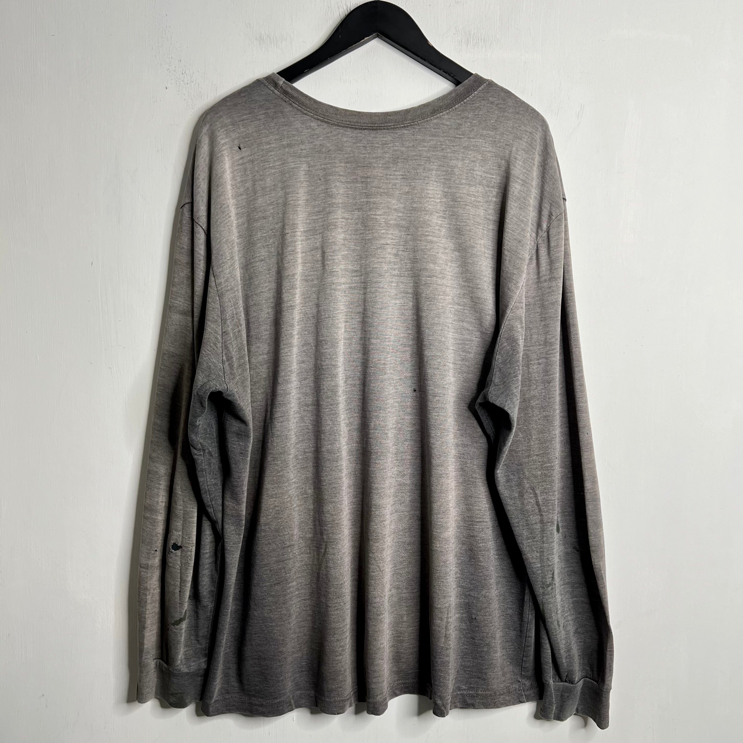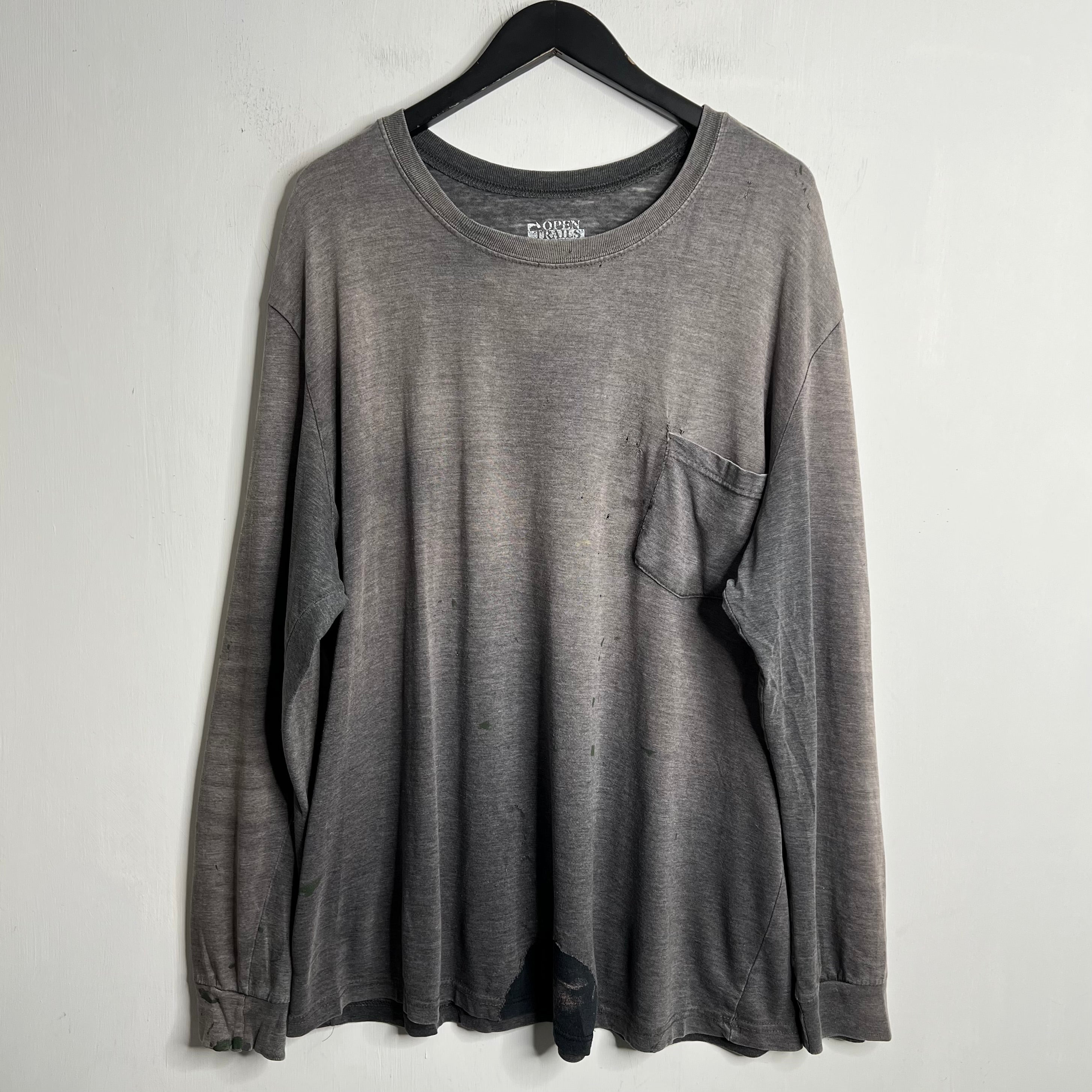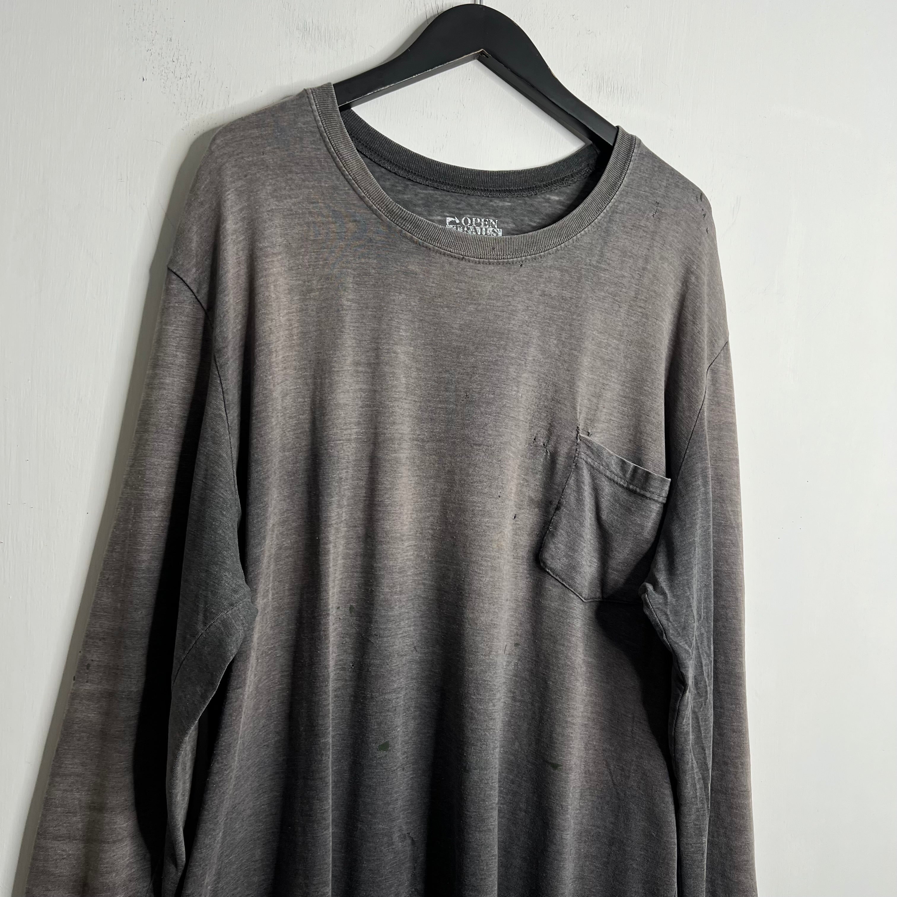 A true slam trasher. Hand-stitched repairs done in-house by us-us (bottom patch section, slightly off-center pocket restitch, etc..). 28" armpit to armpit, 30.5" top of back collar to bottom. Open Trails says 2XL, fits big. 50% cotton/50% polyester. Made in the Americas.