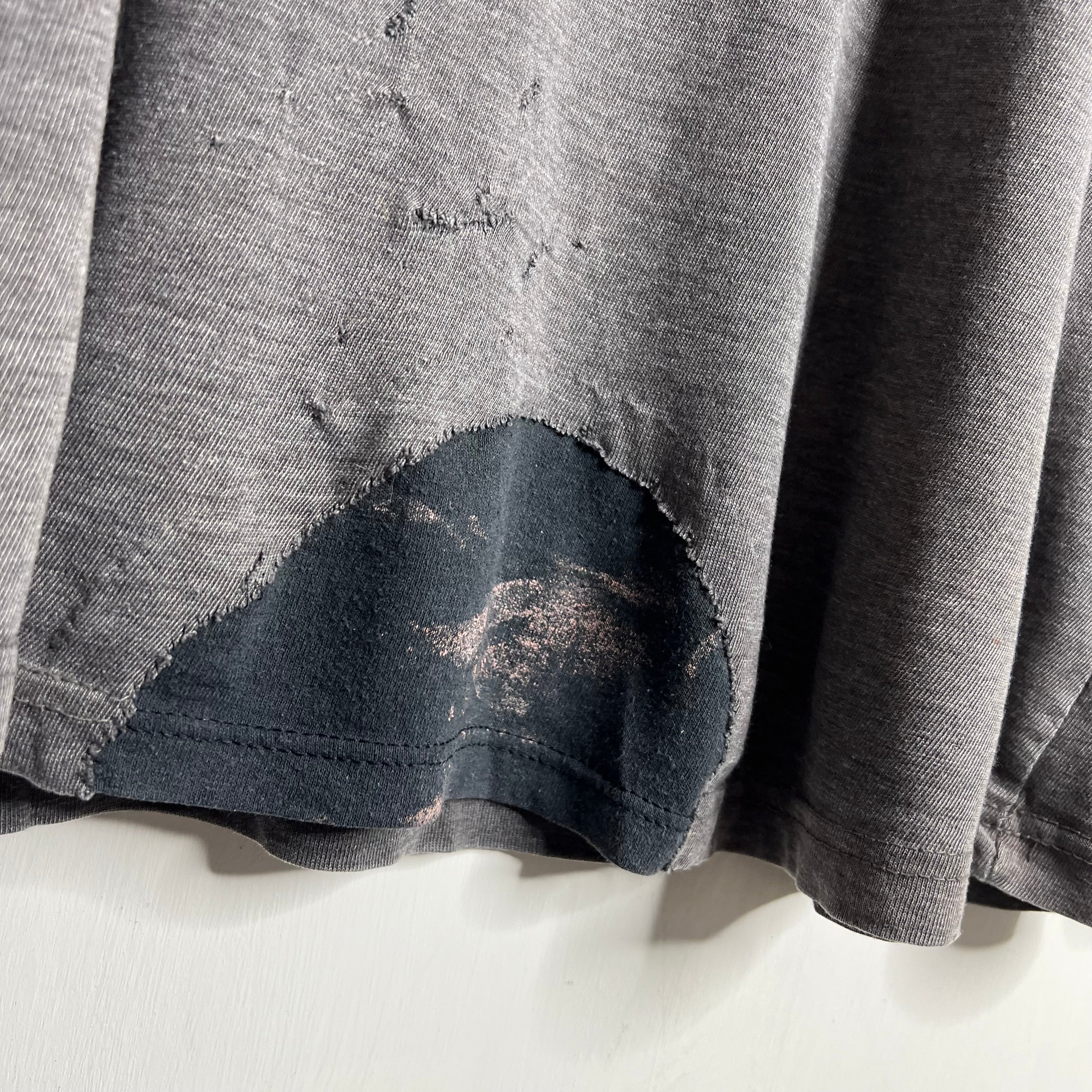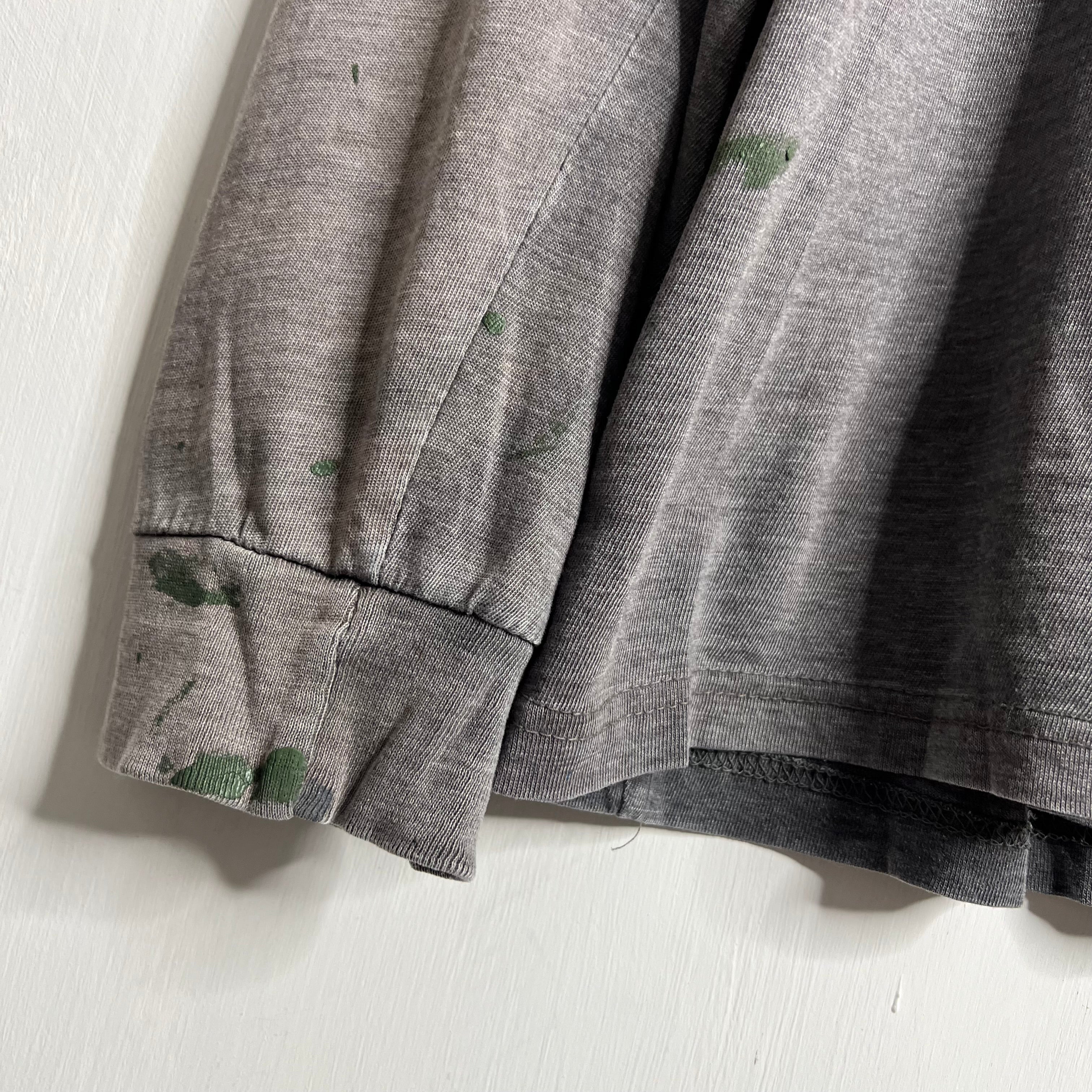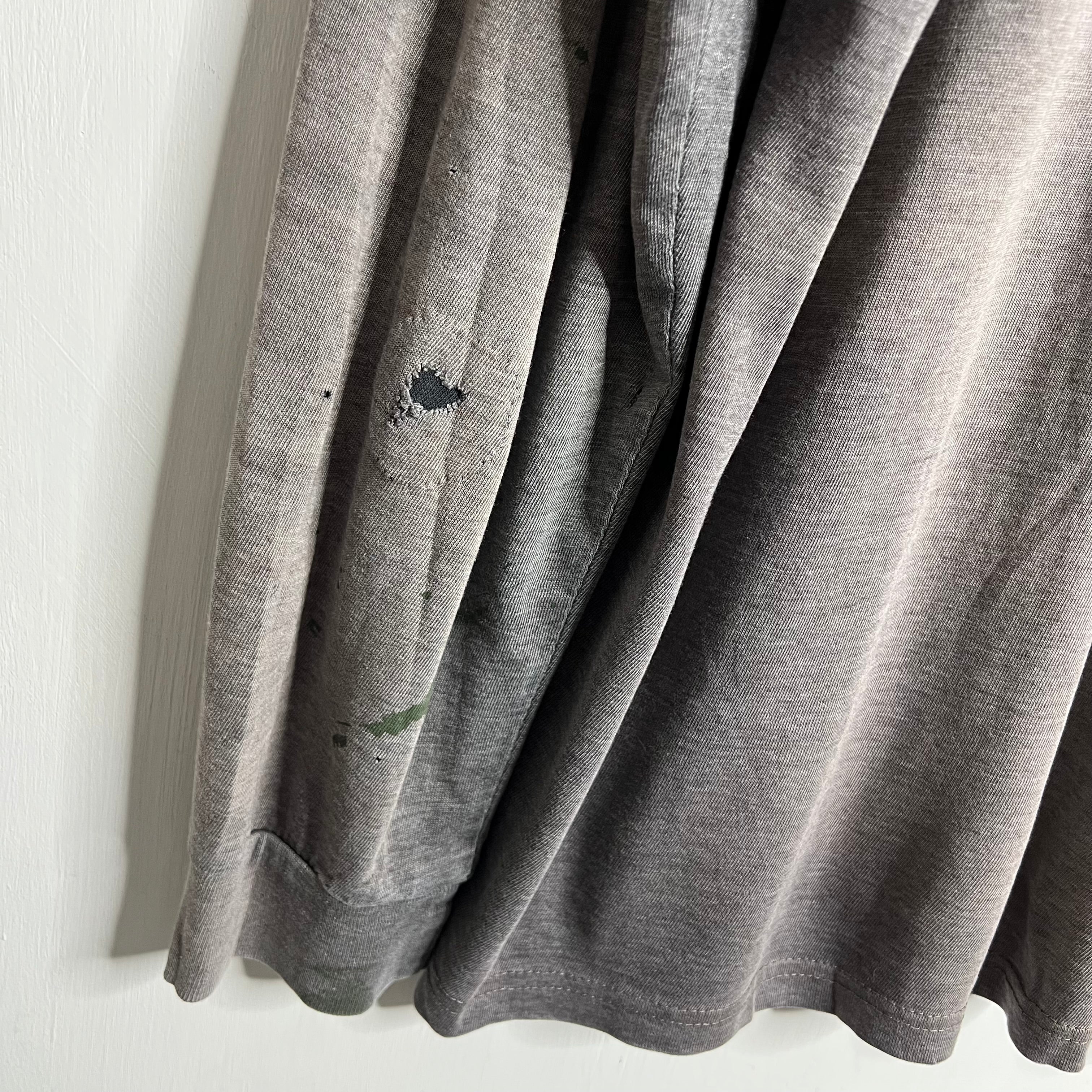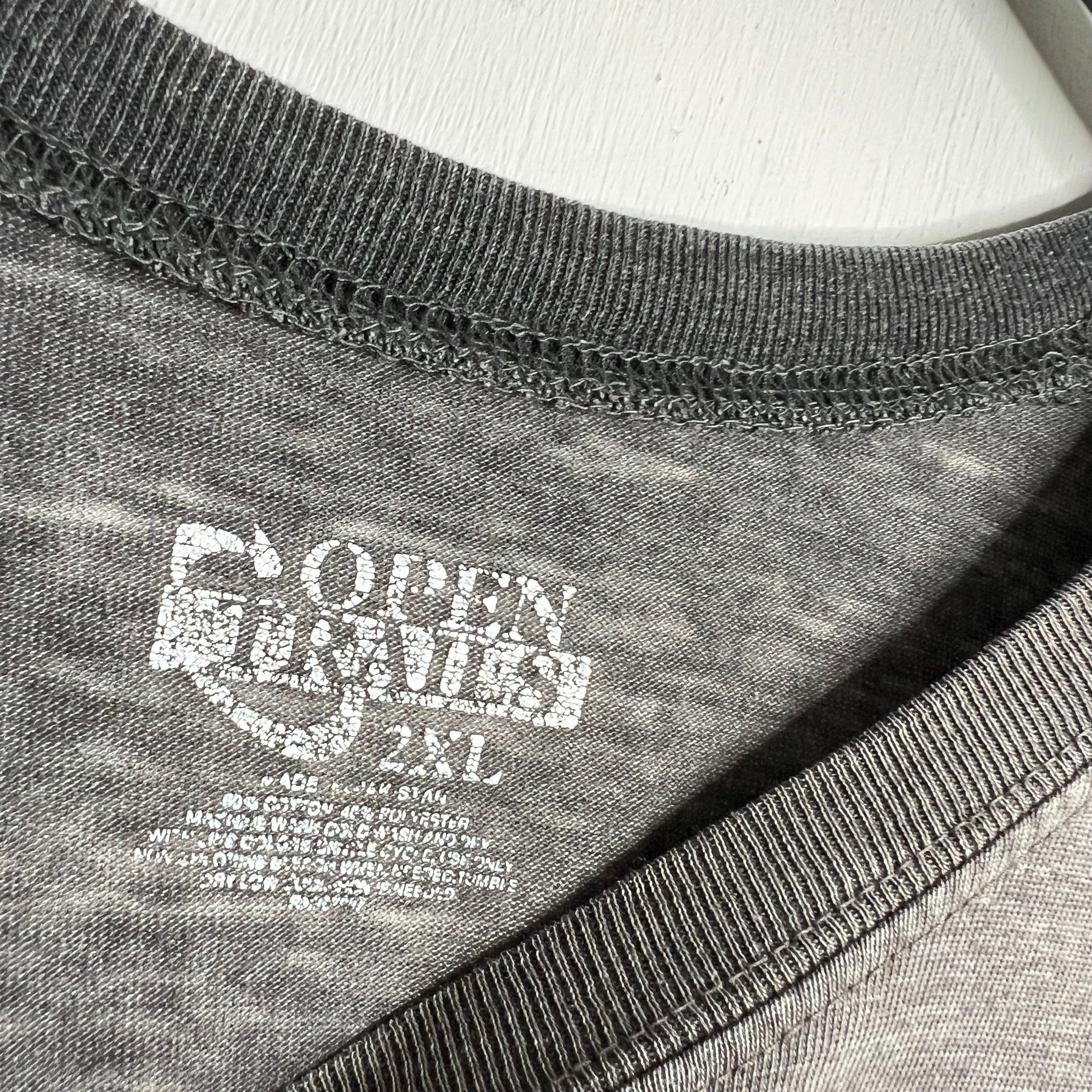 A true slam trasher. Hand-stitched repairs done in-house by us-us (bottom patch section, slightly off-center pocket restitch, etc..). 28" armpit to armpit, 30.5" top of back collar to bottom. Open Trails says 2XL, fits big. 50% cotton/50% polyester. Made in the Americas.