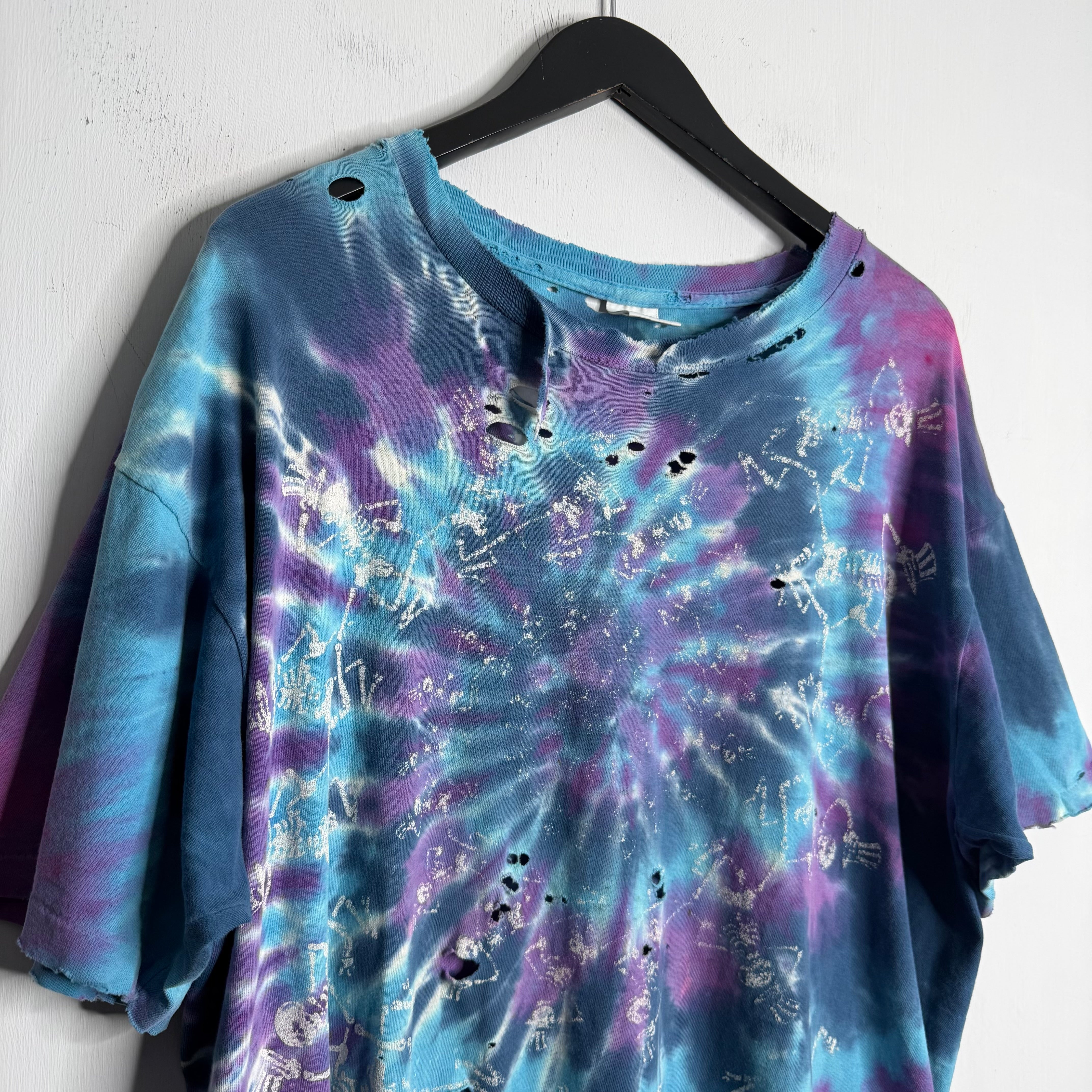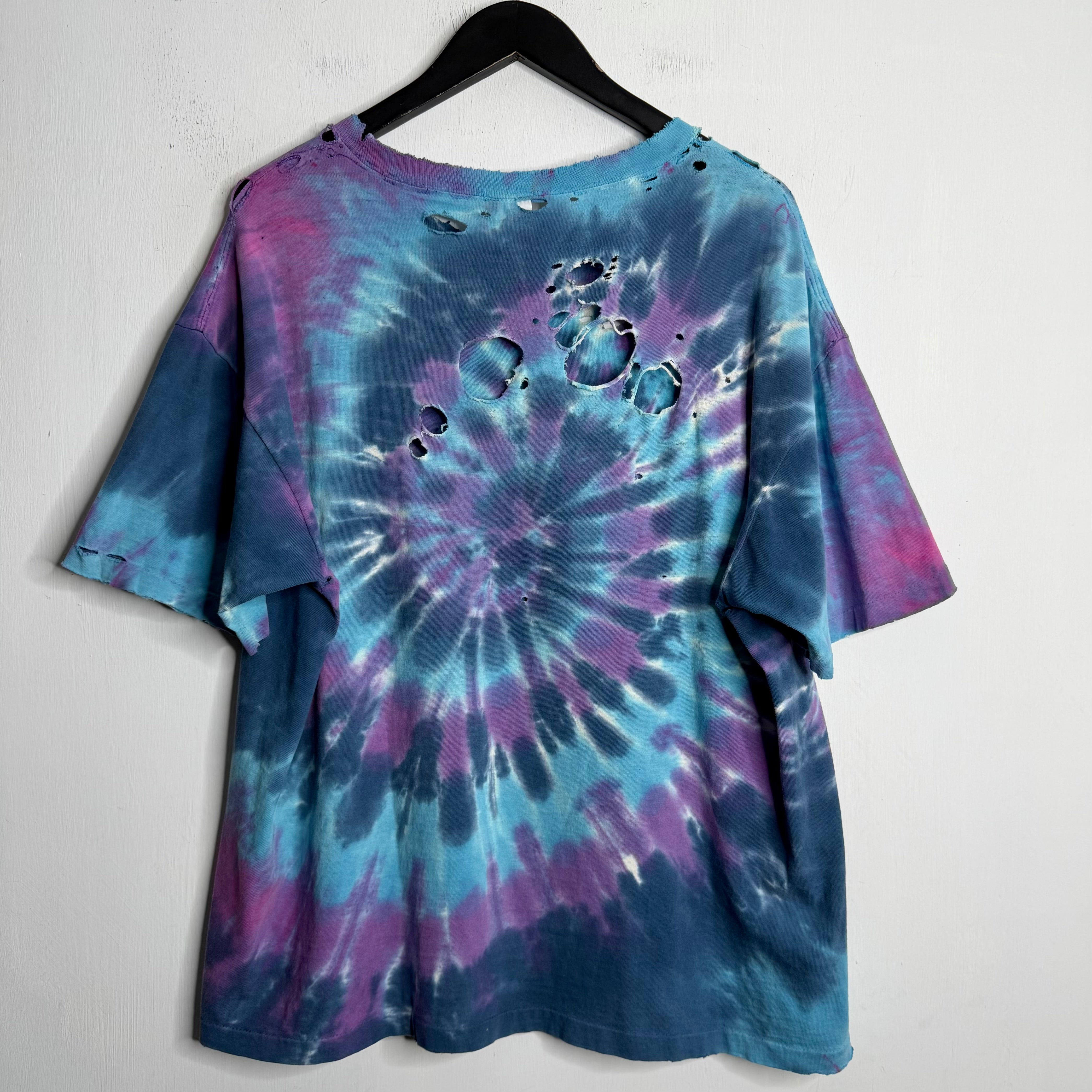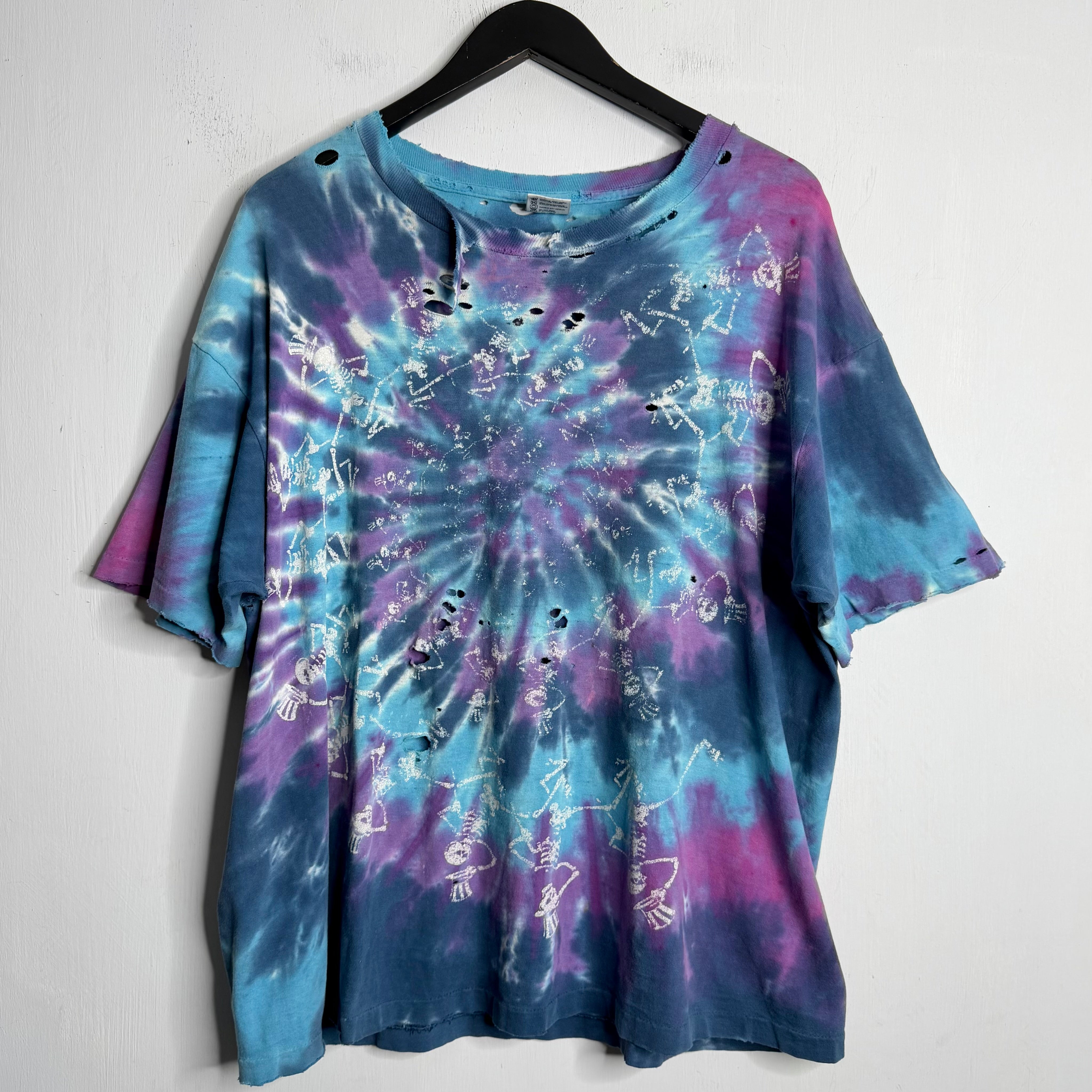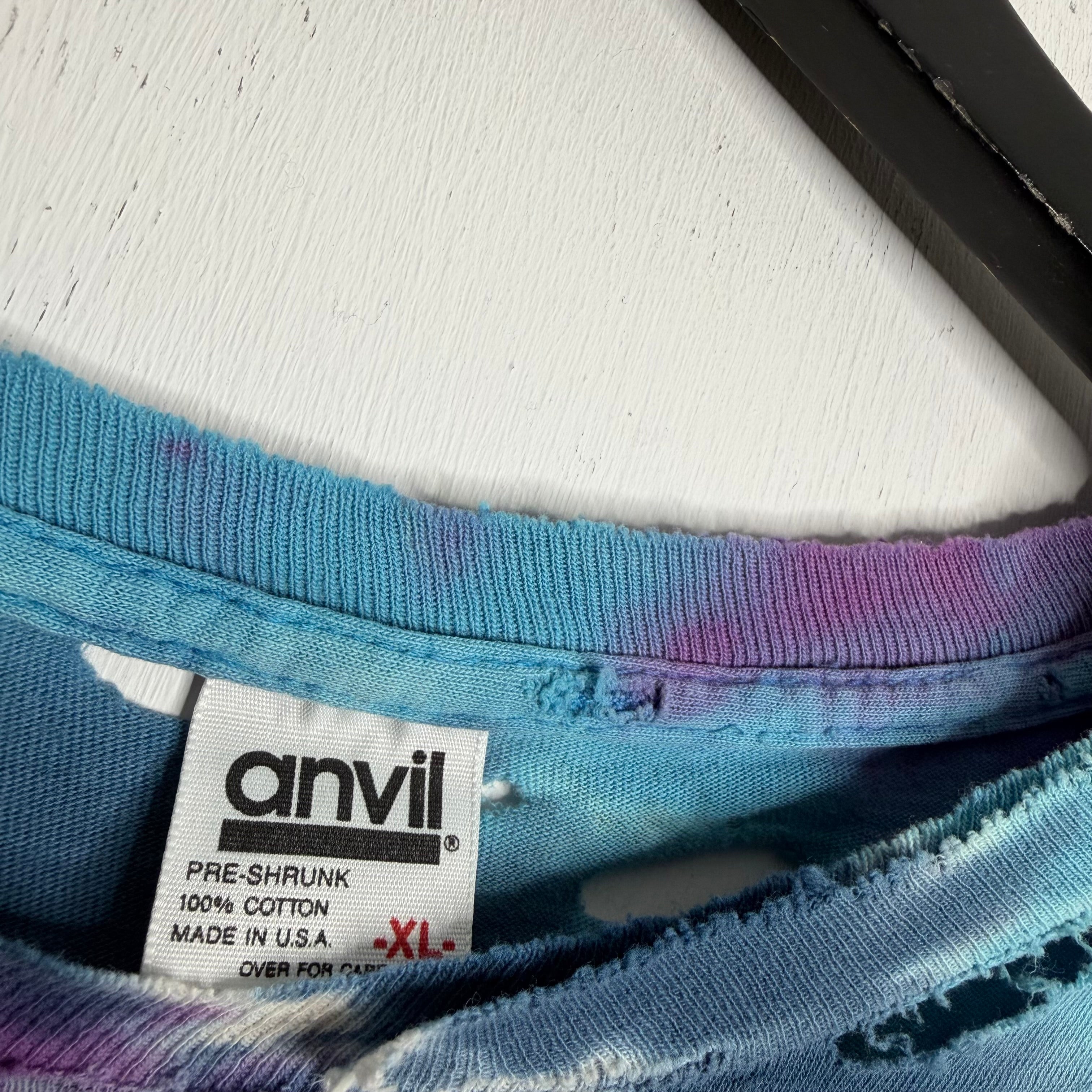 Tie dead. 25" armpit to armpit, 28" top of back collar to bottom. Anvil says XL, fits boxy. 100% cotton. Made in the USA.