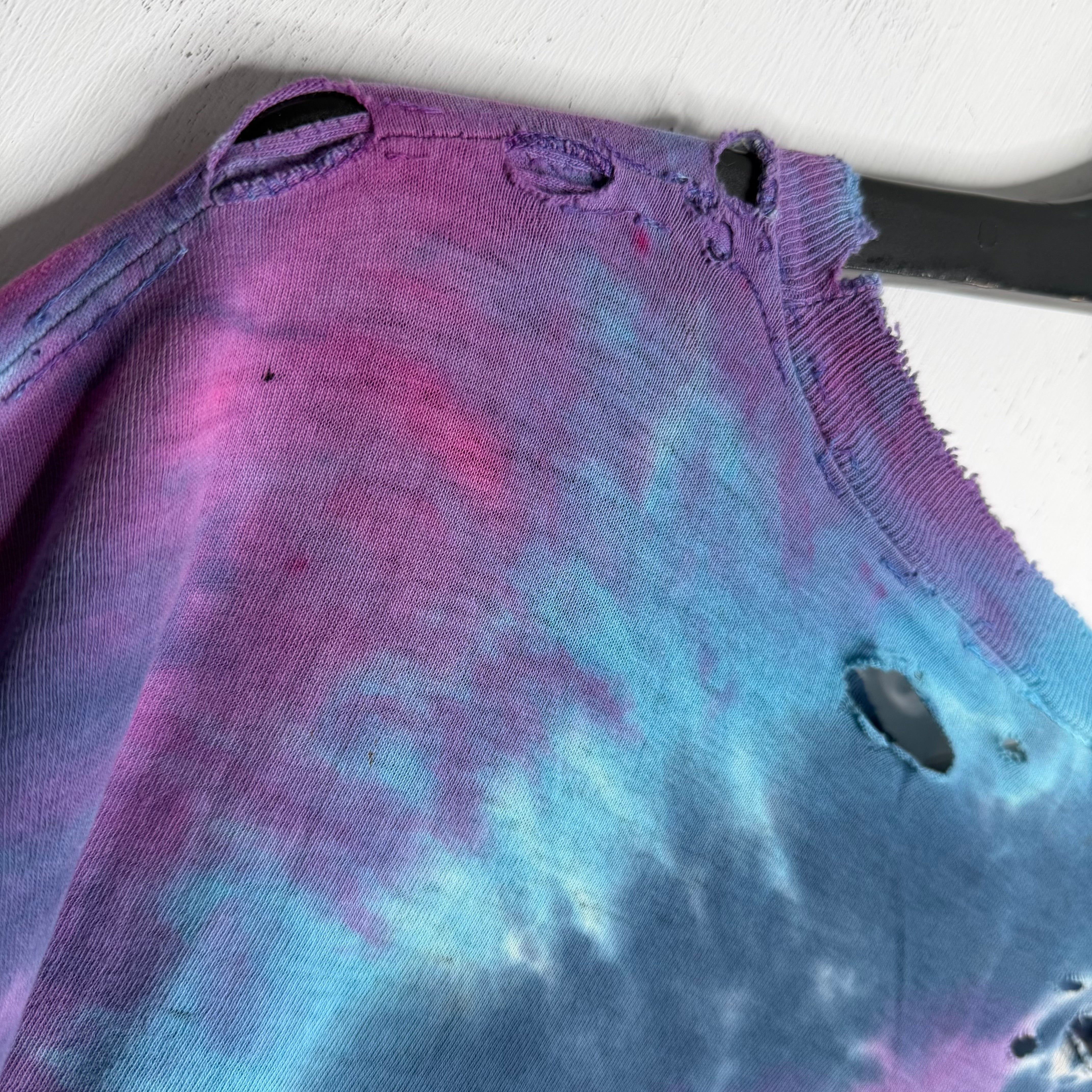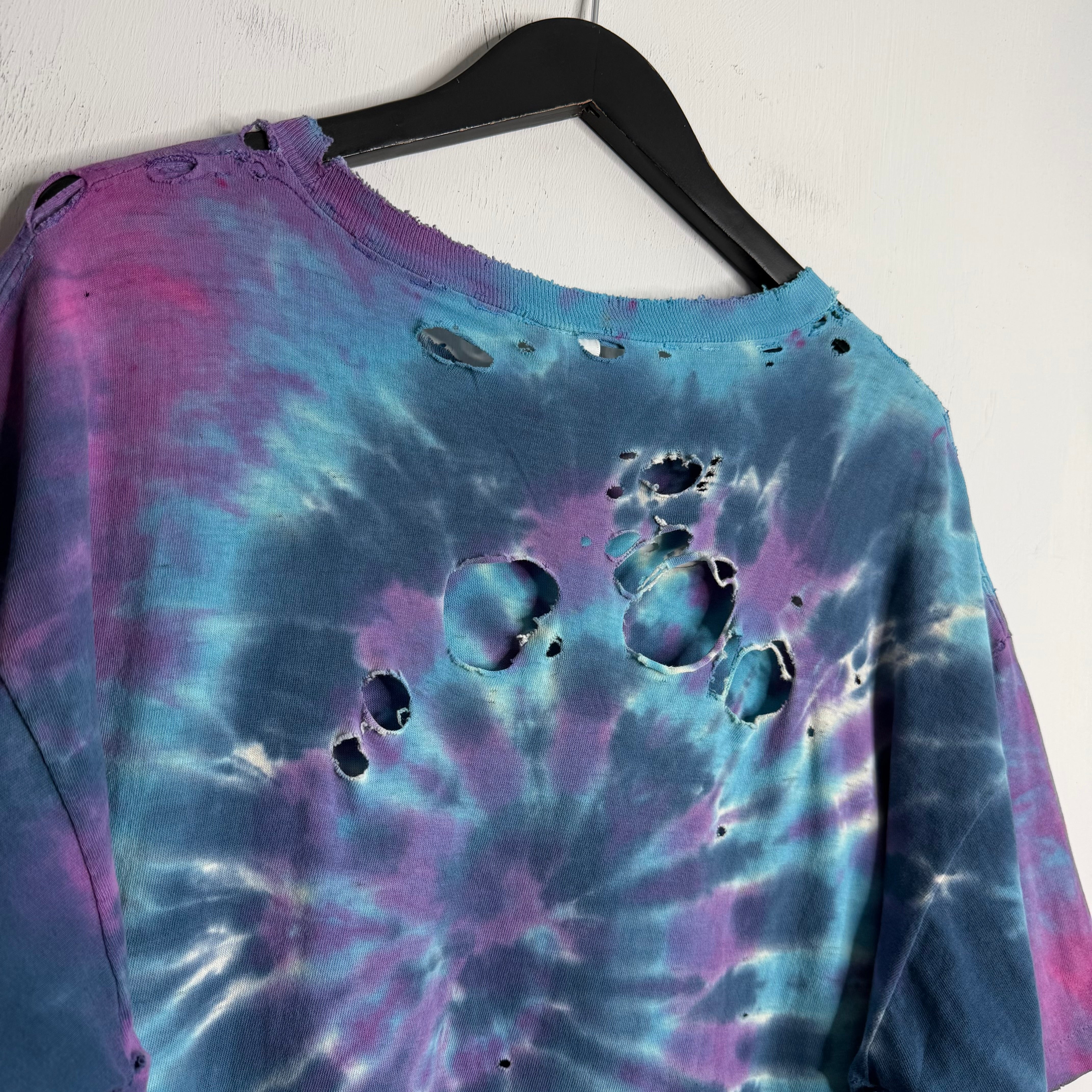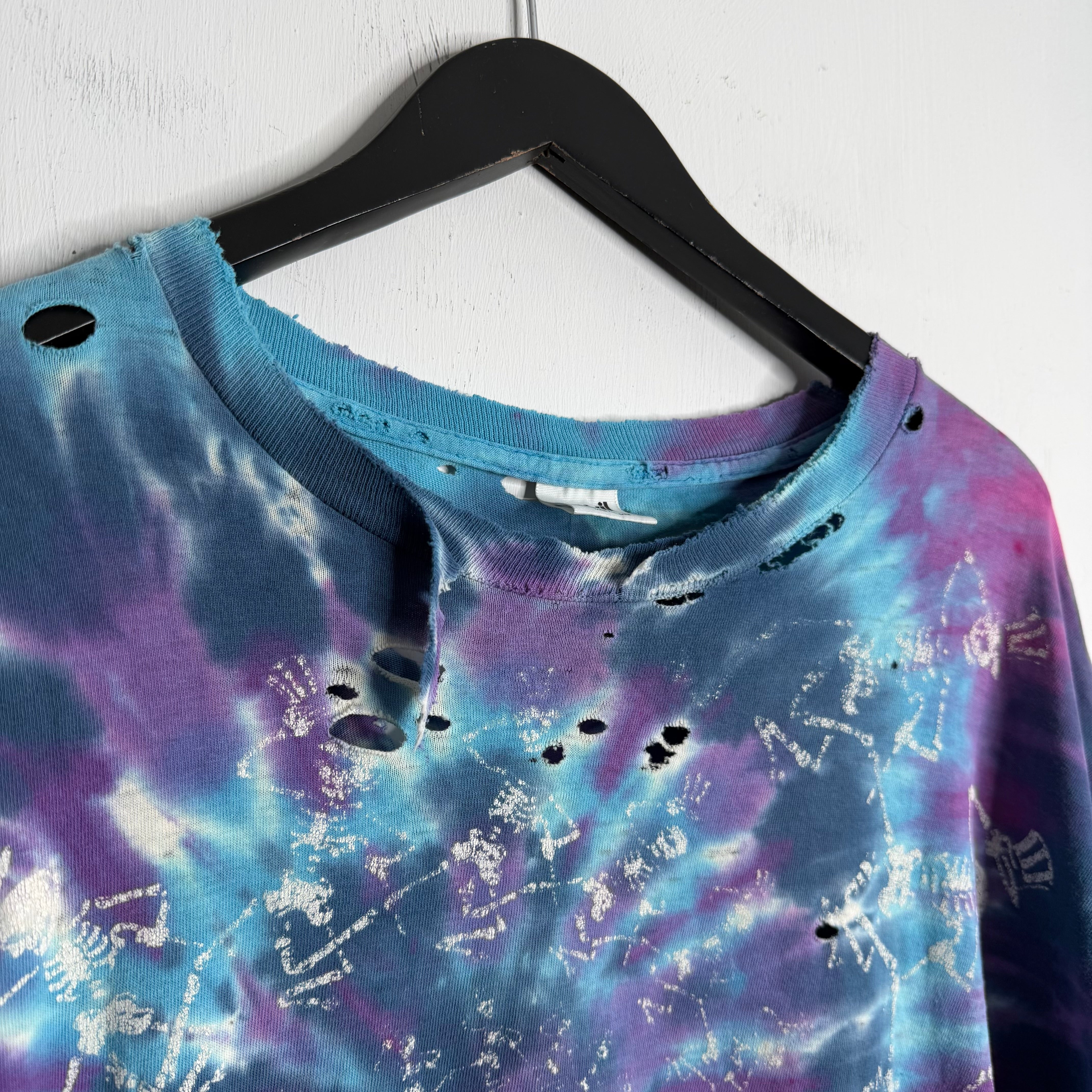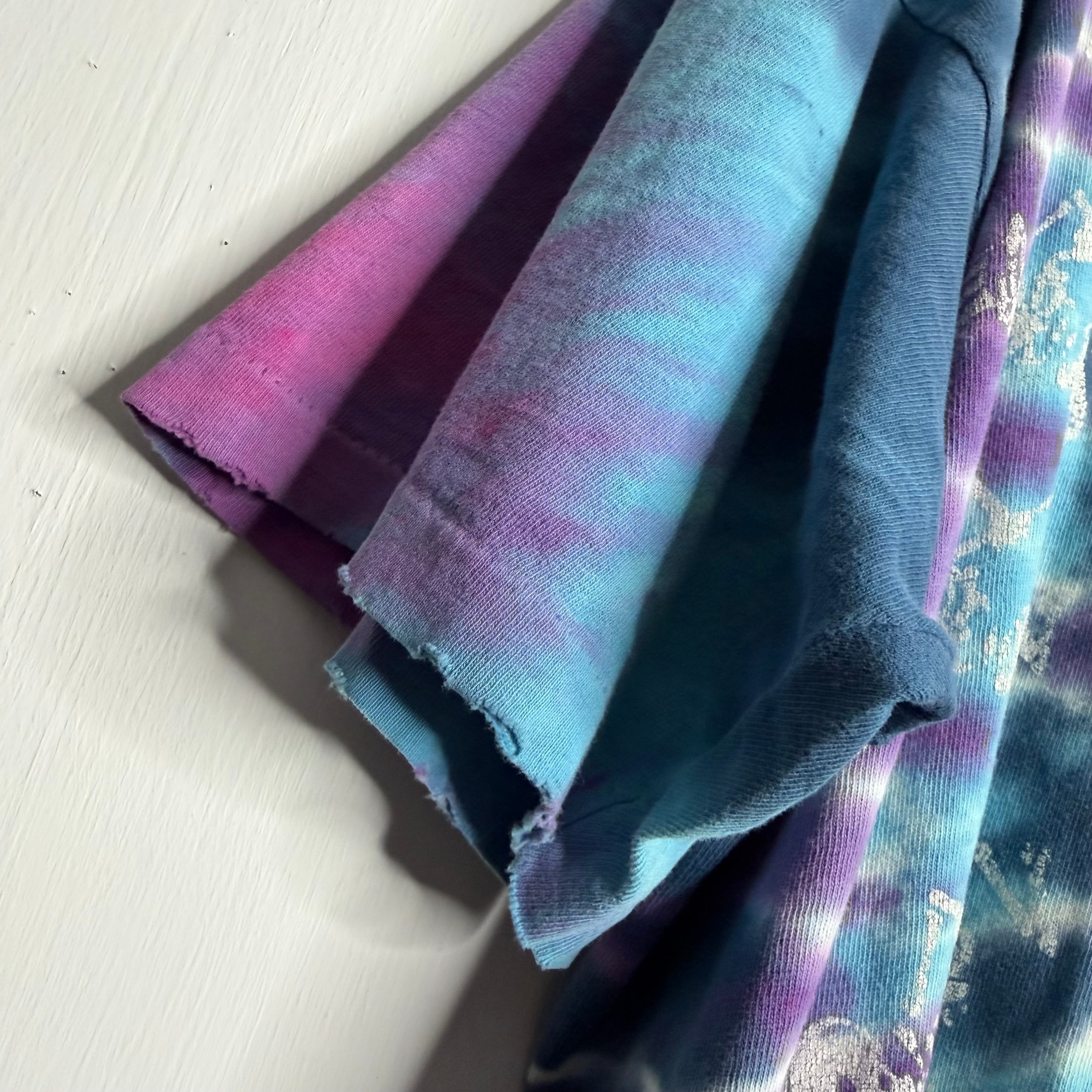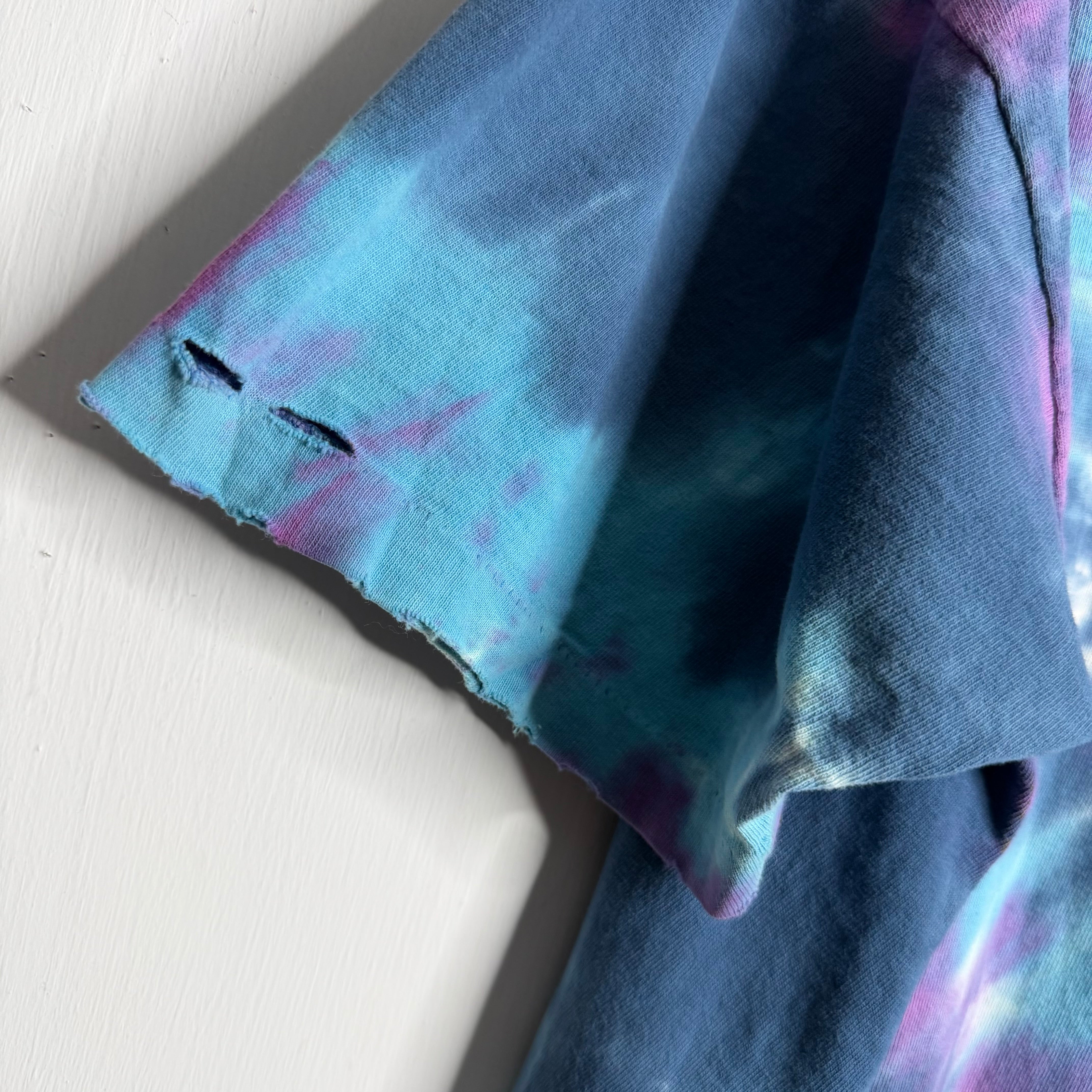 Tie dead. 25" armpit to armpit, 28" top of back collar to bottom. Anvil says XL, fits boxy. 100% cotton. Made in the USA.