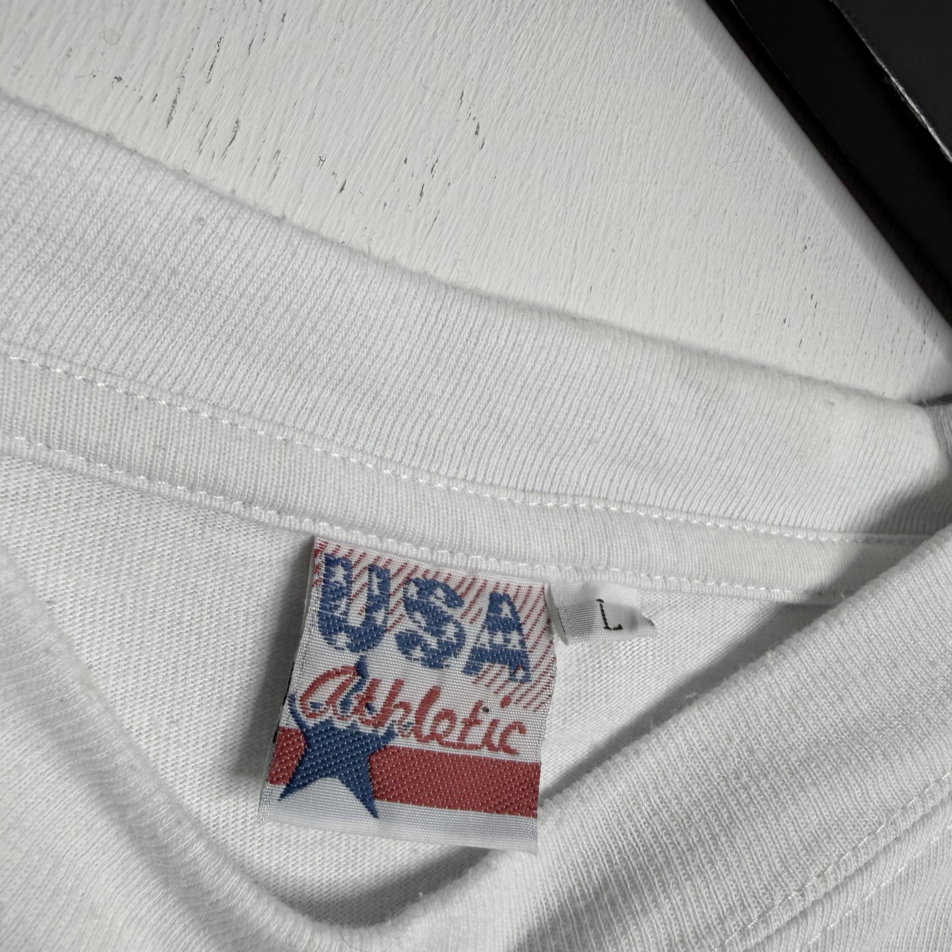 Epic-est line up... 25" armpit to armpit, 29.5" top of back collar to bottom. USA Athletic says L, fits a wide XL. 100% cotton. Made in China.