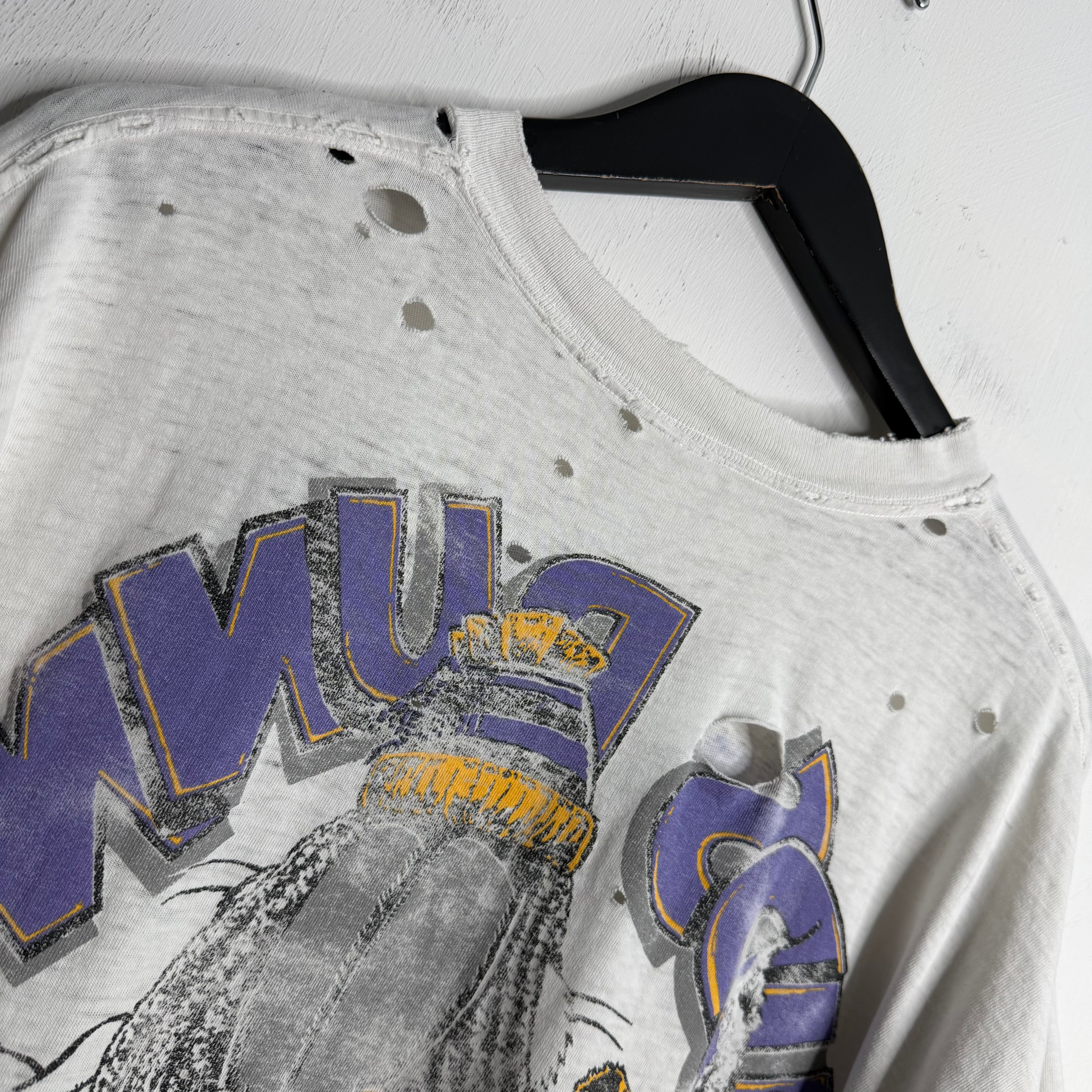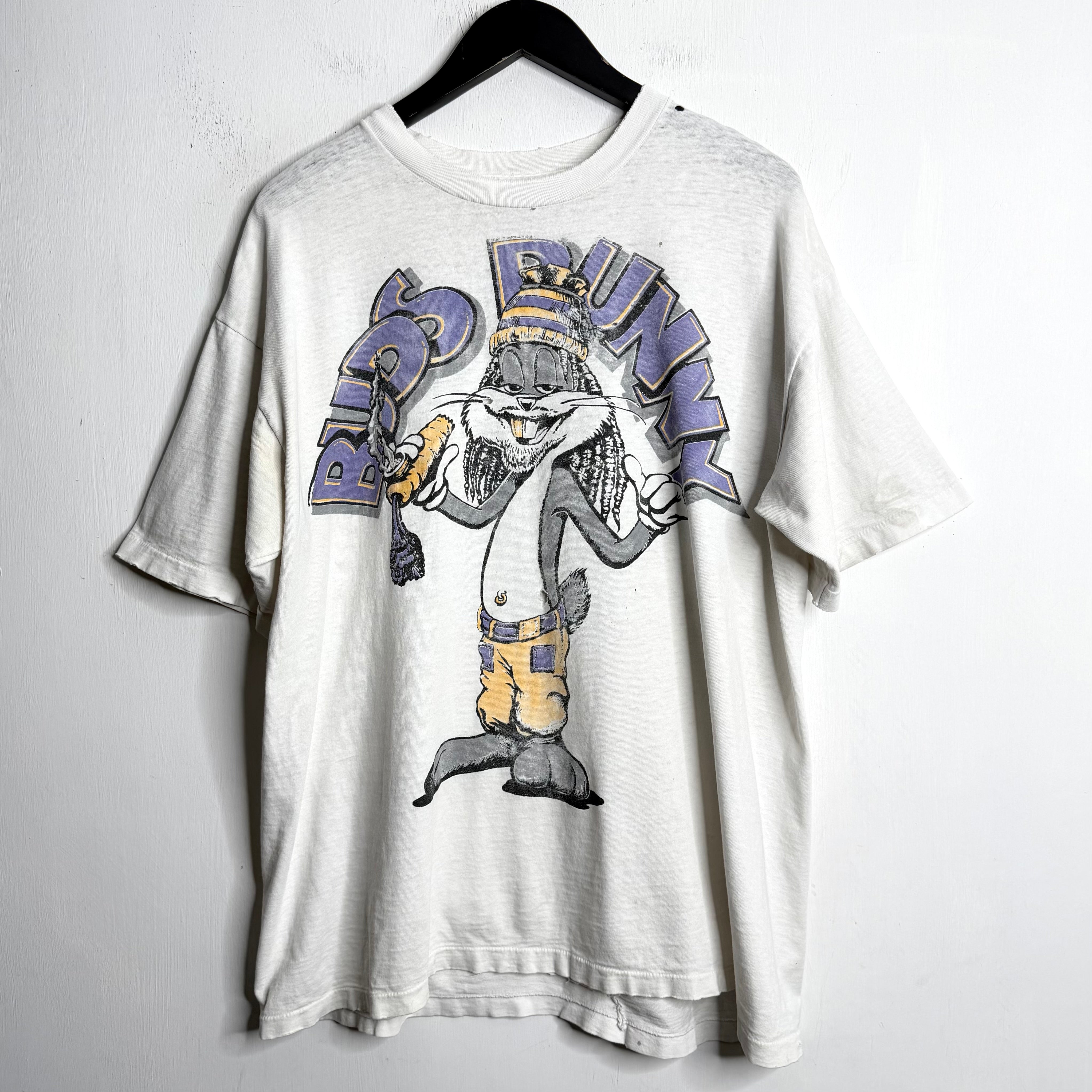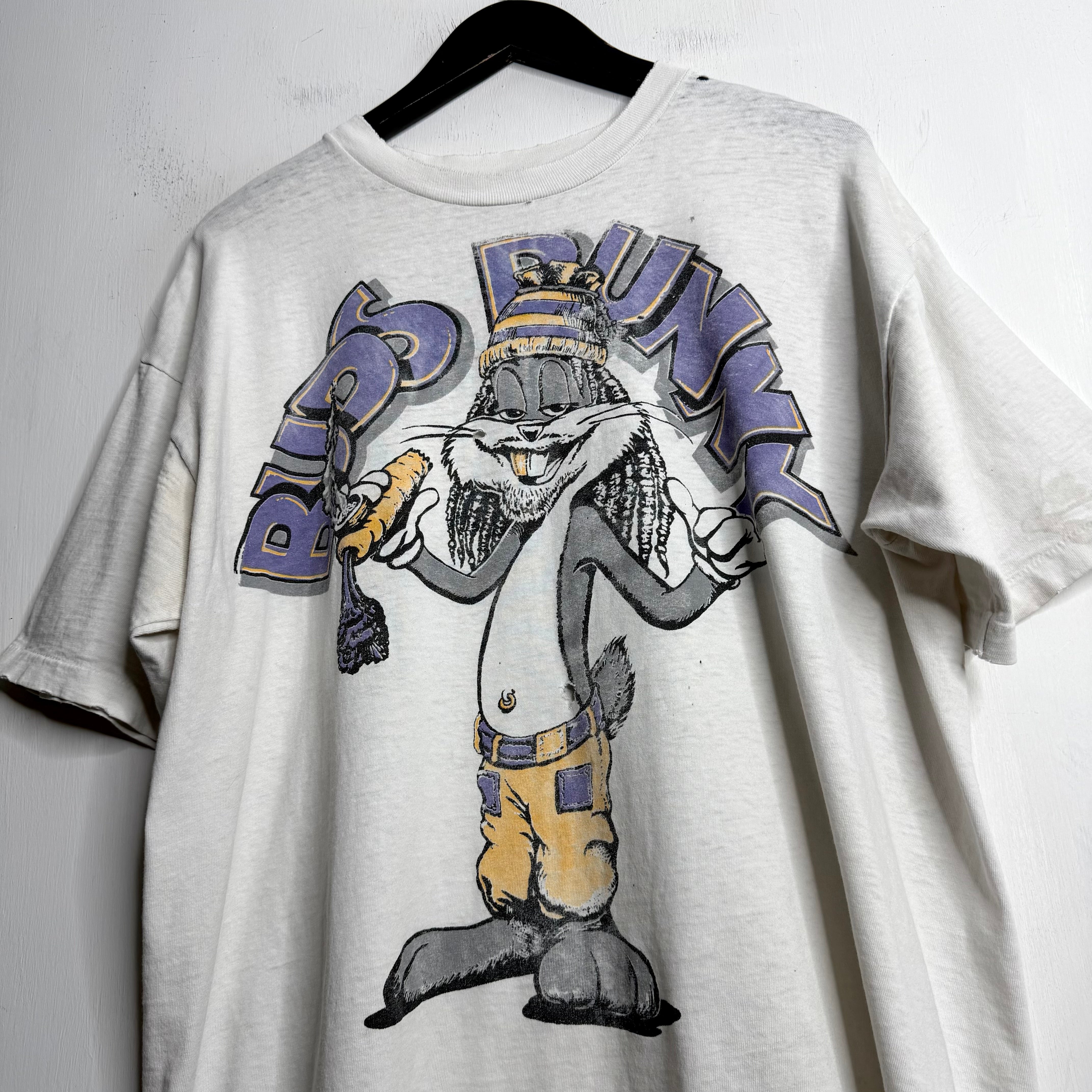 What's up doc? 24" armpit to armpit, 28.5" top of back collar to bottom. XL. 100% cotton. Made in the USA.