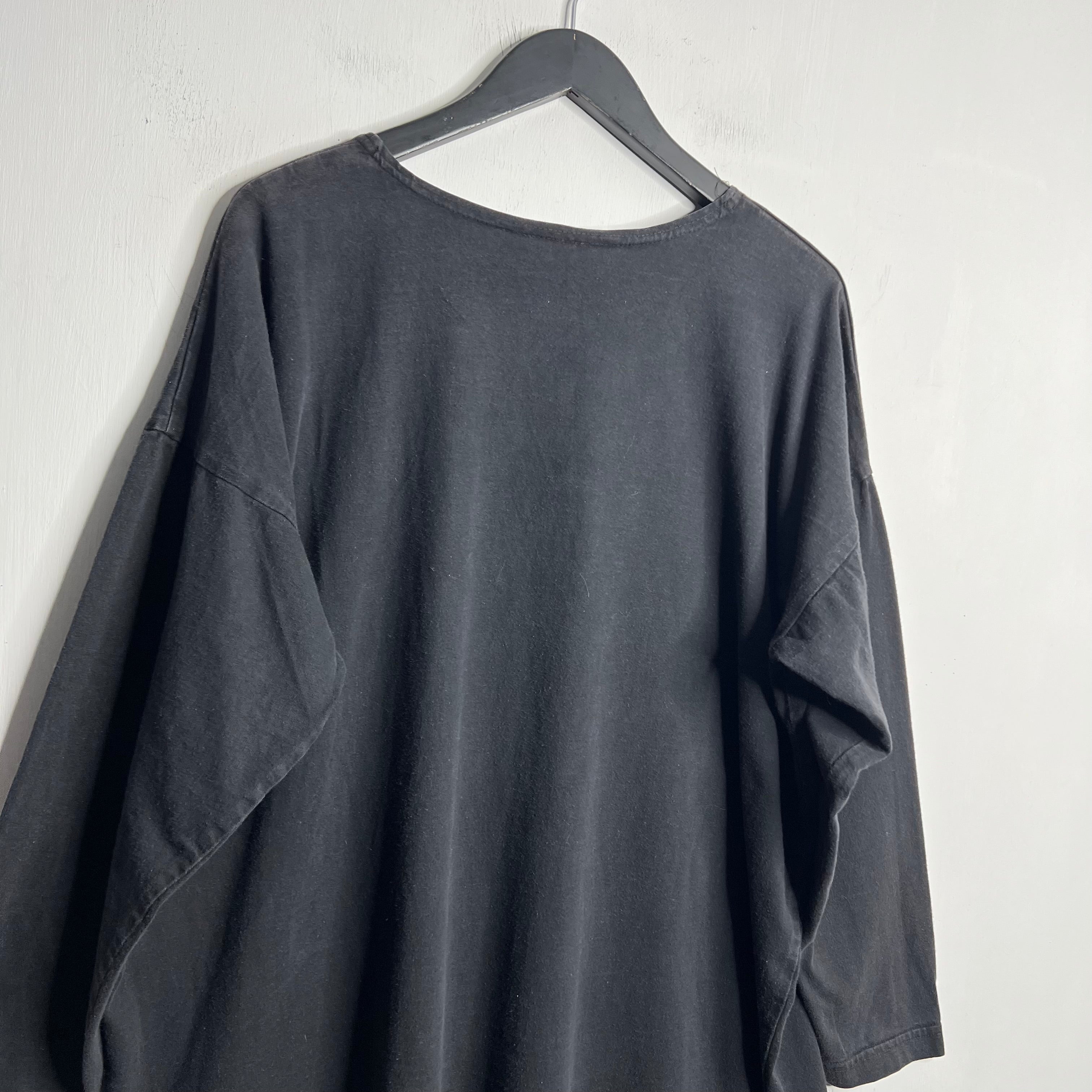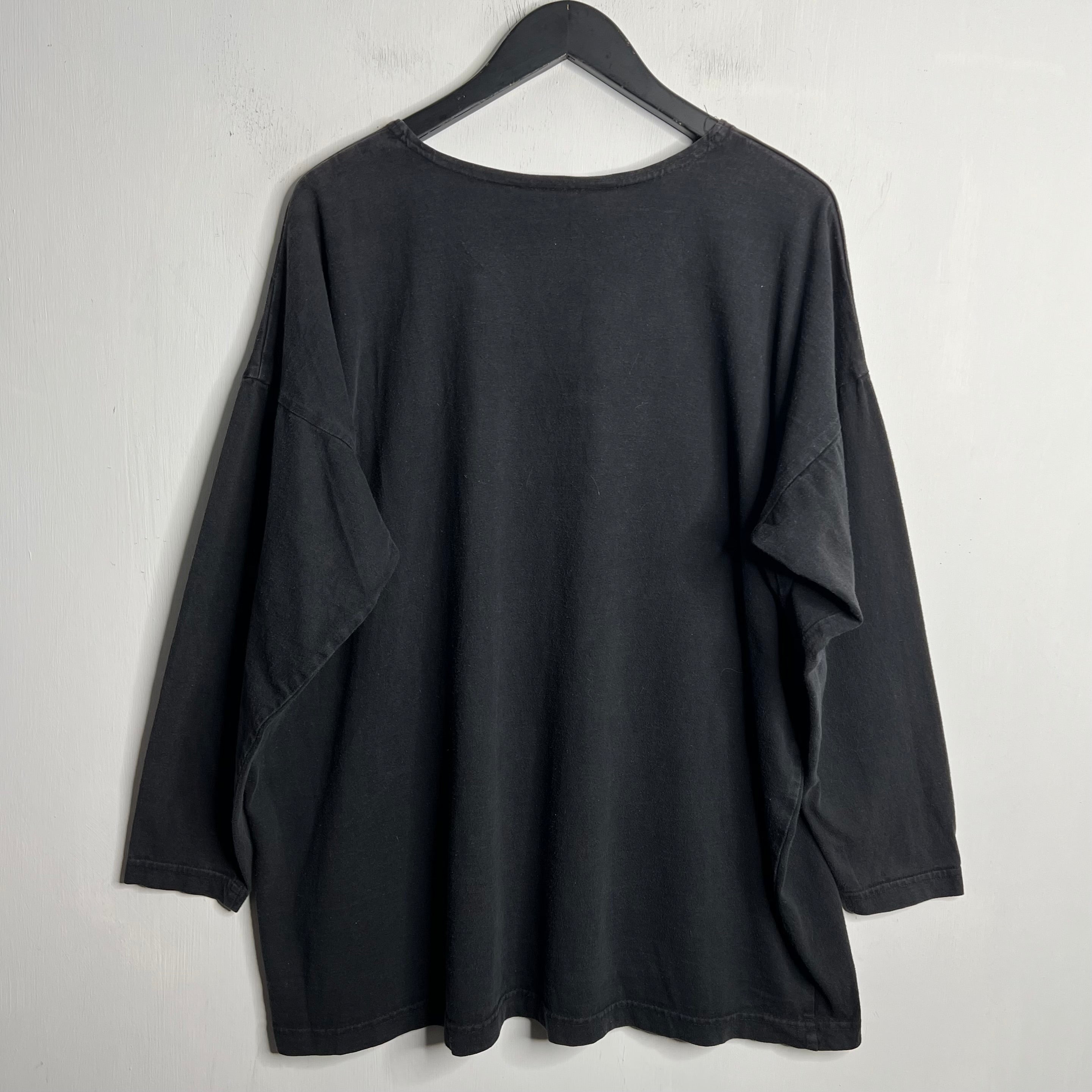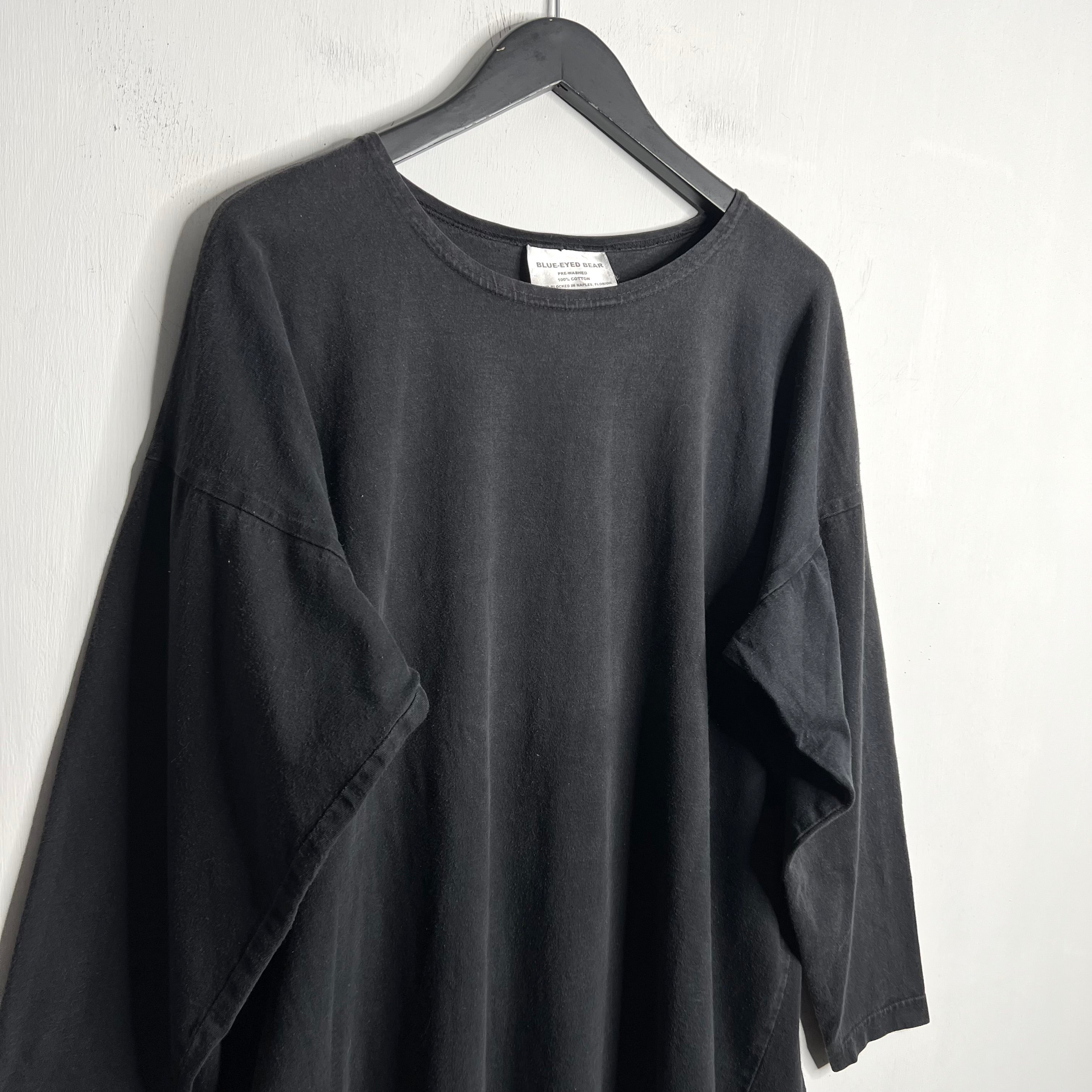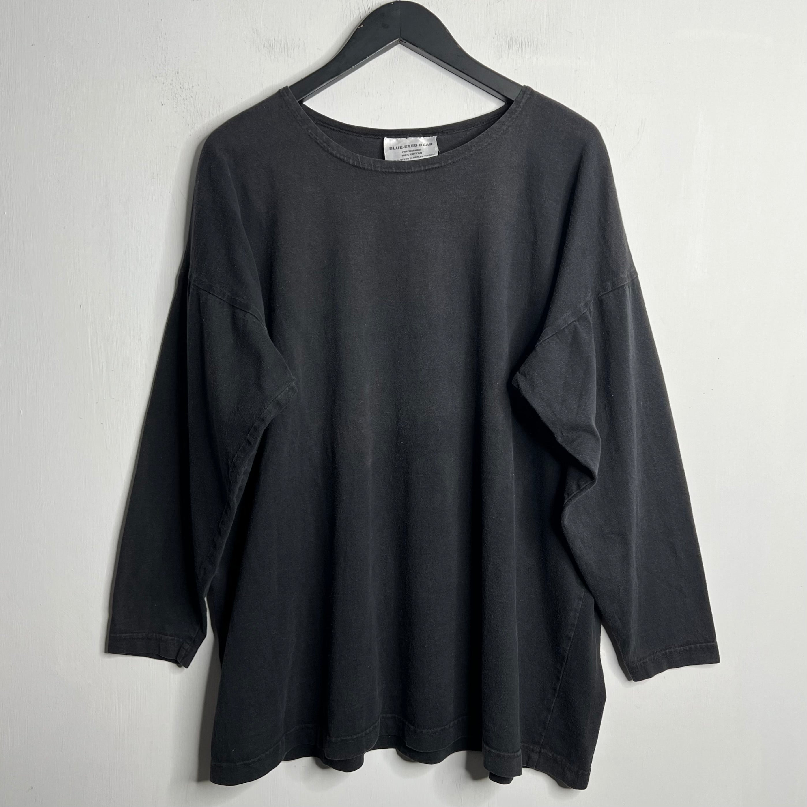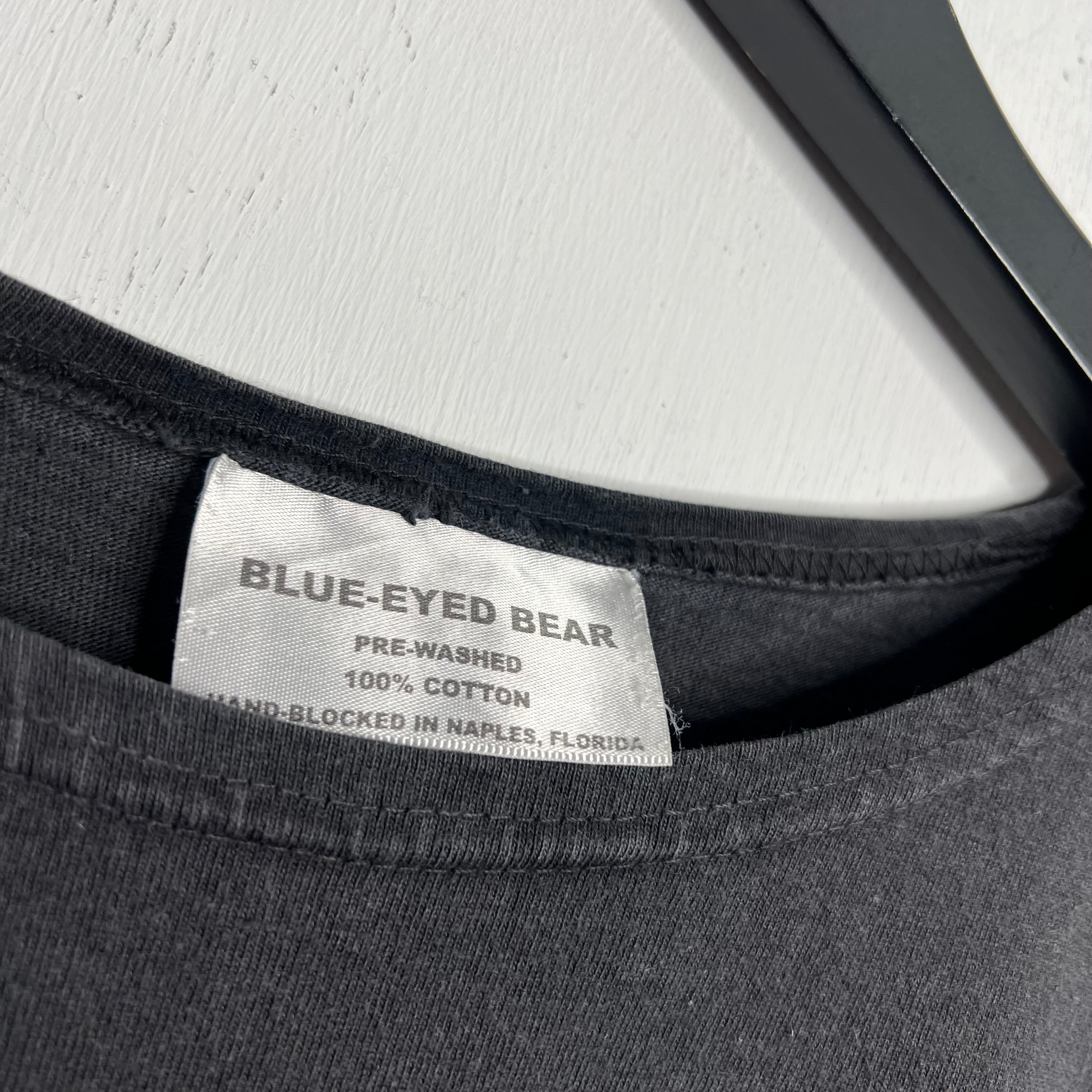 Beach noir. 28" armpit to armpit, 28.5" top of back collar to bottom. Blue-Eyed Bear says OSFA, fits a wide L/XL. 100% cotton. Made in the USA.