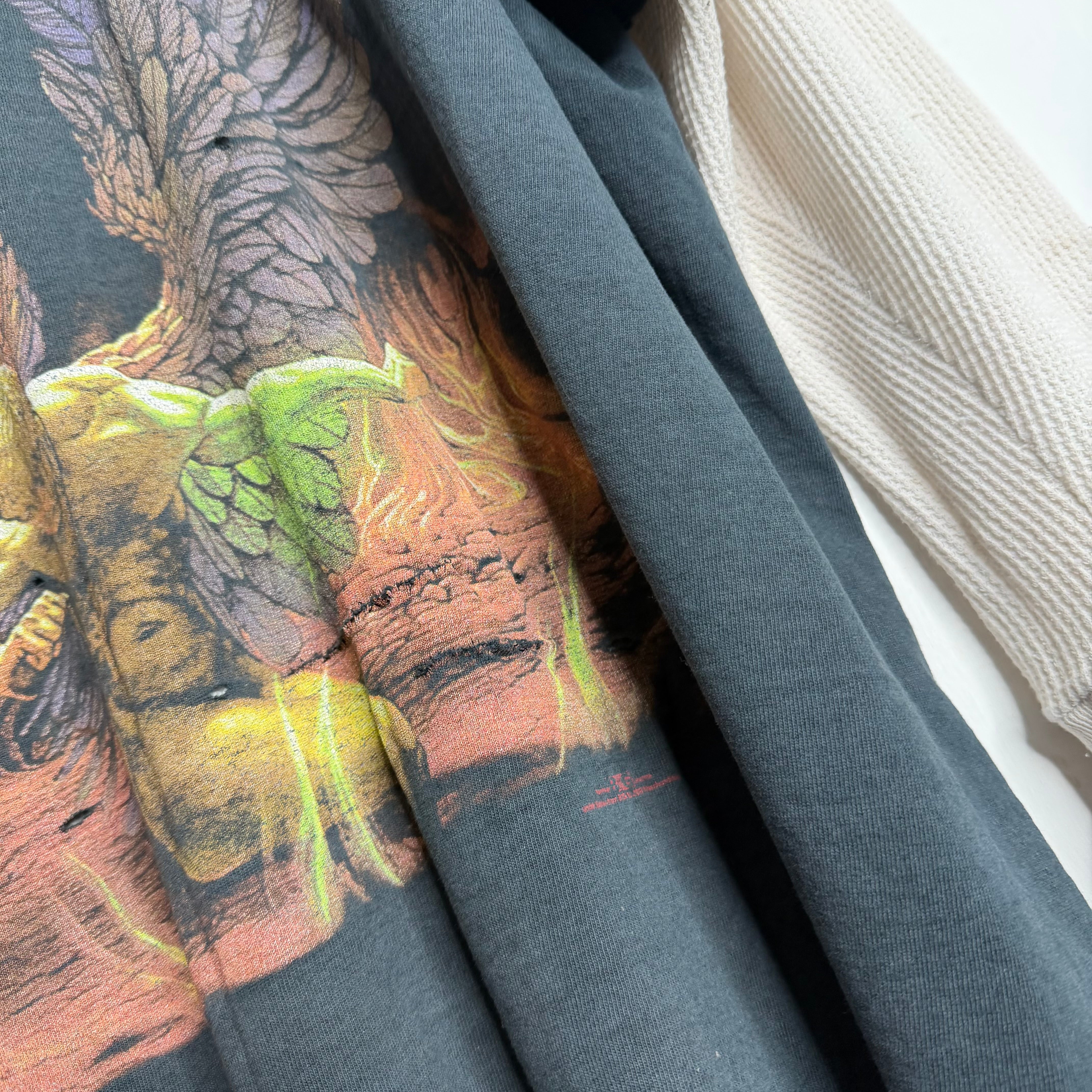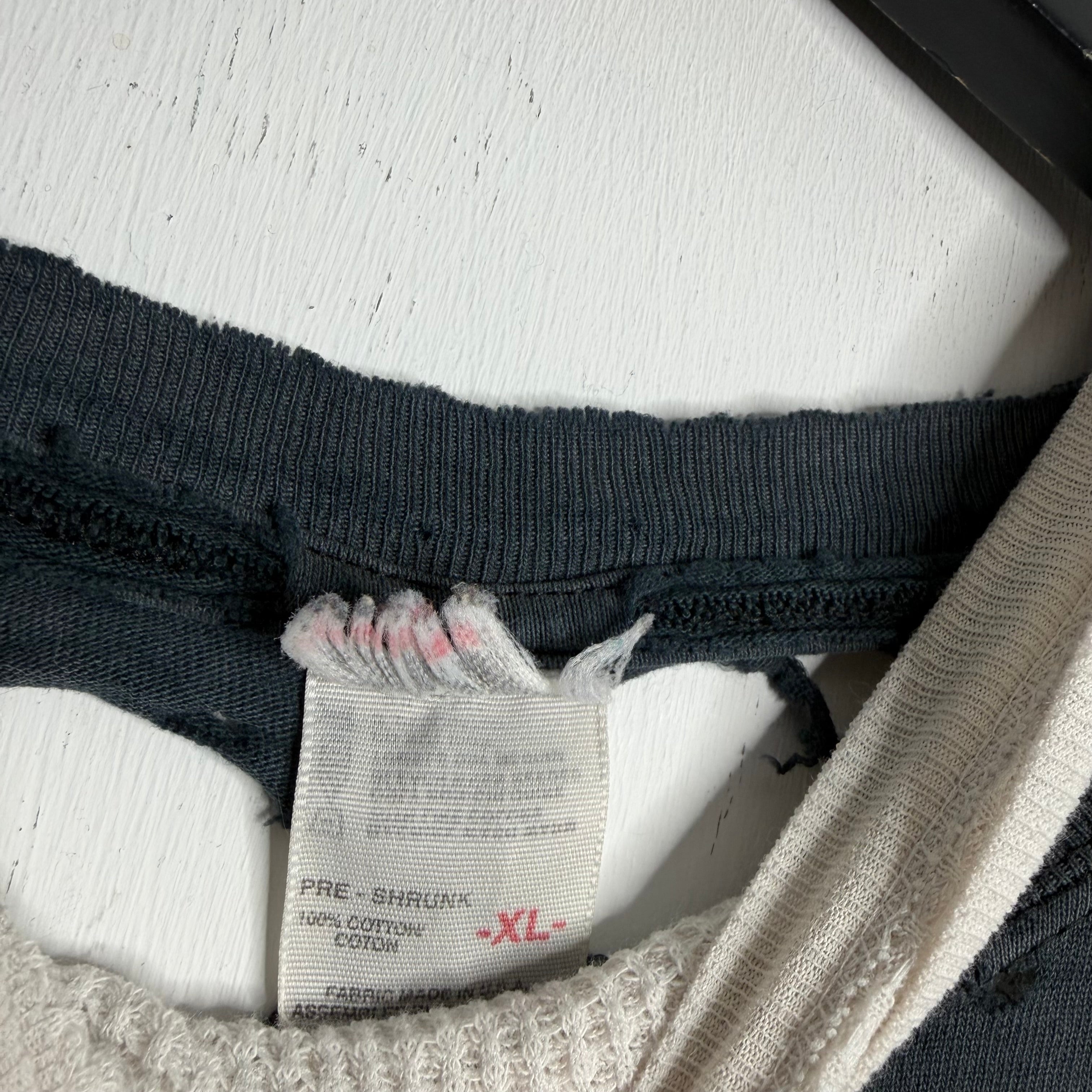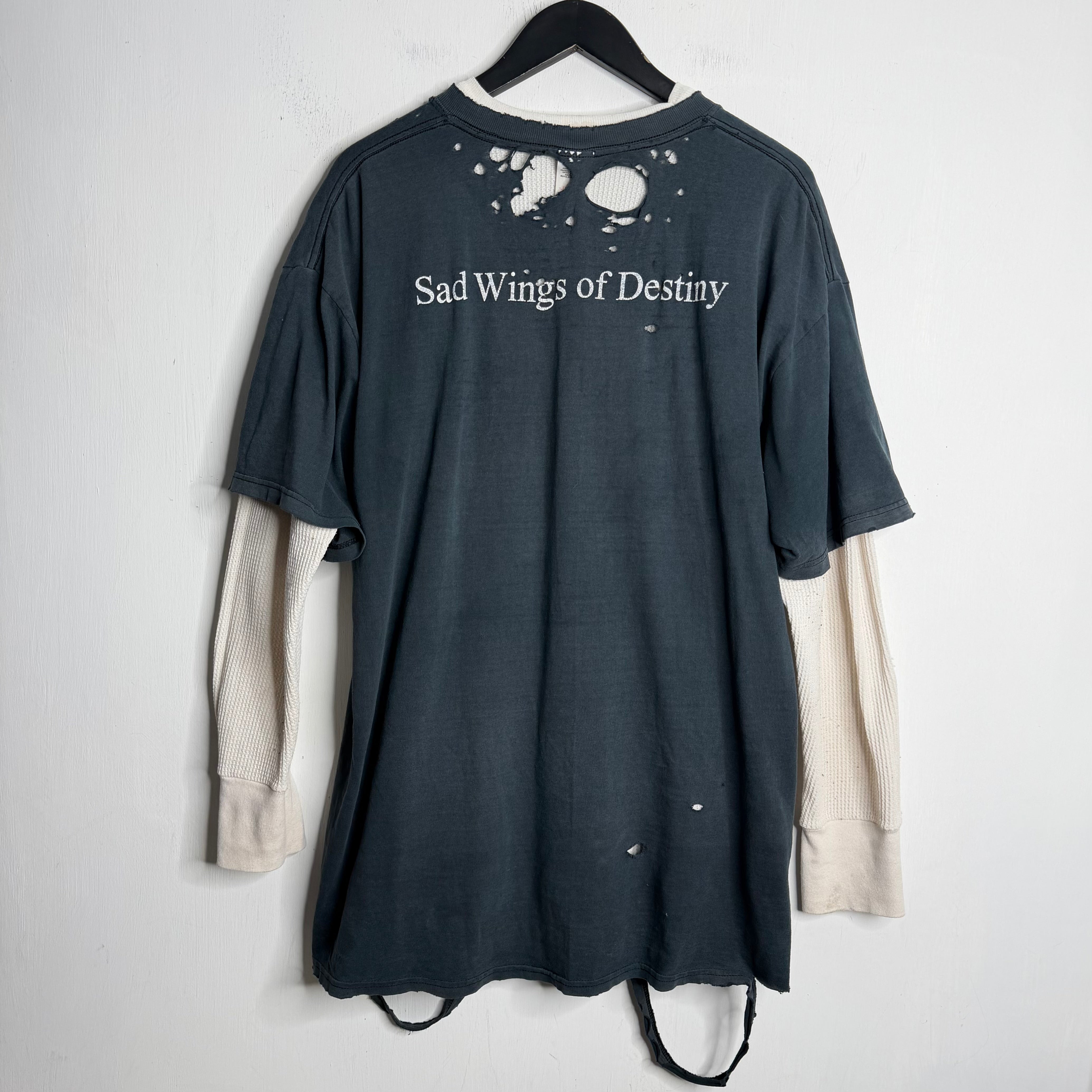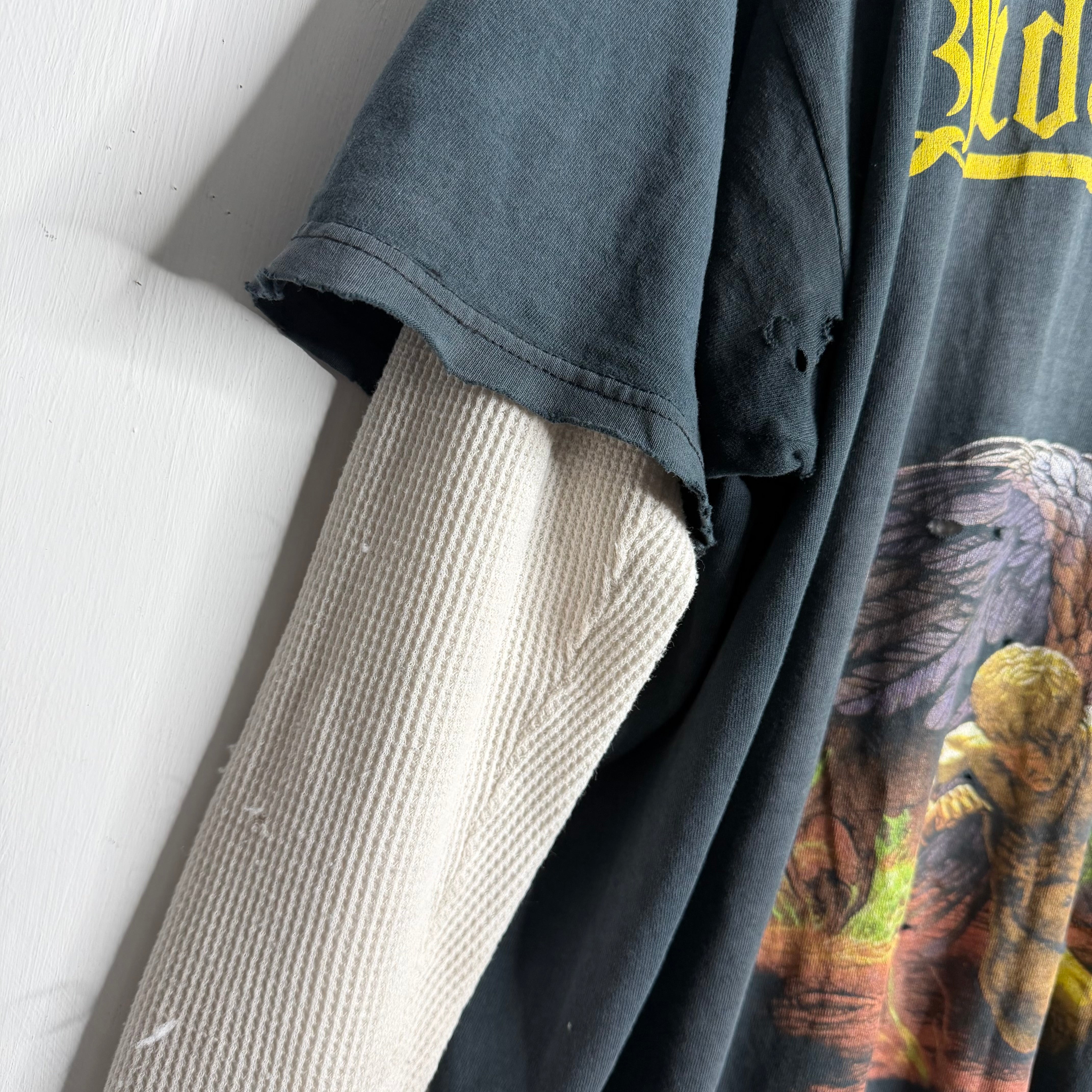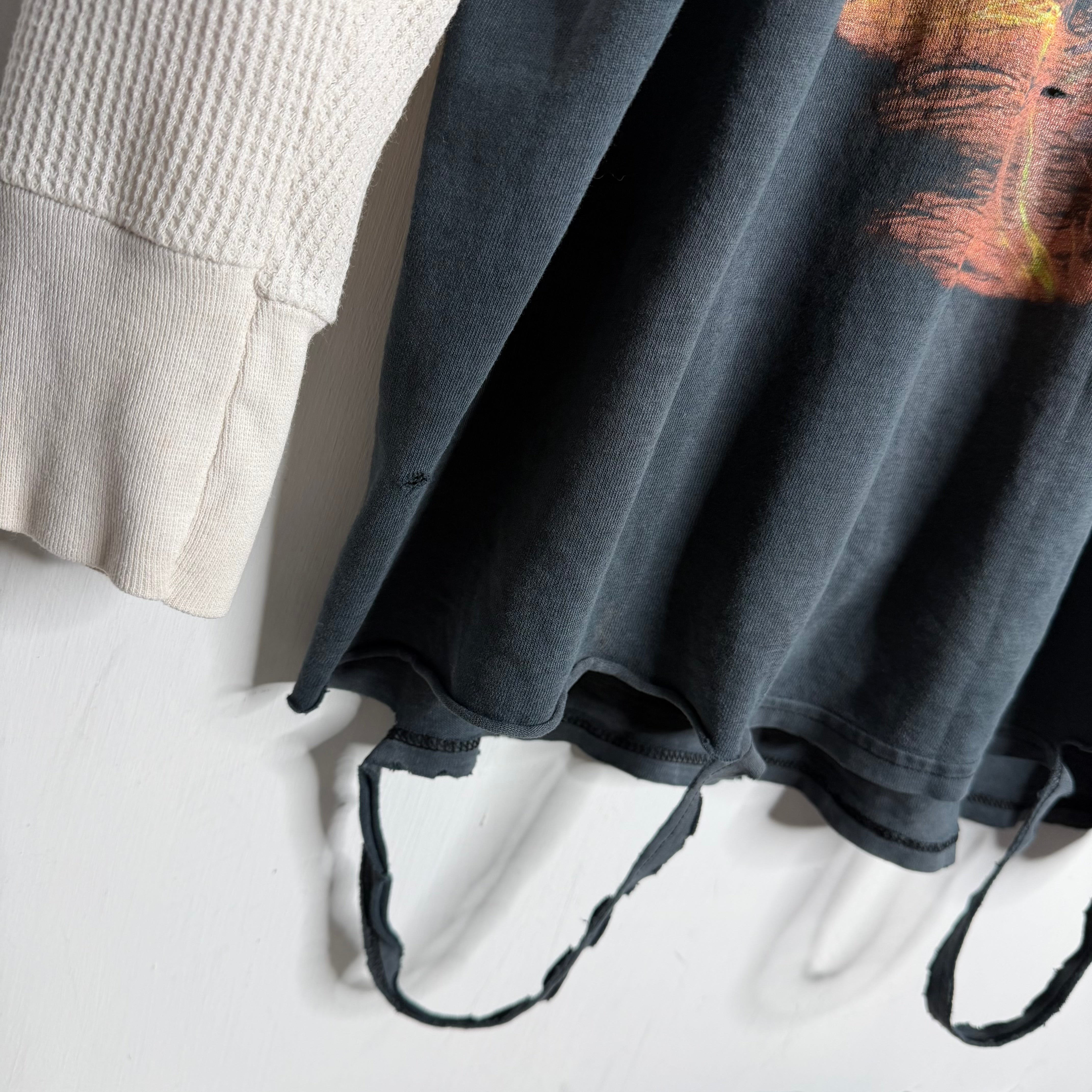 Unrepenter two-fer slays all oncomers. Thermal included with purchase. 24" armpit to armpit, 30.5" top of back collar to bottom. Hanes says XL on the JP tee and XL on the thermal. 100% cotton outer / 50% cotton/50% polyester thermal under. Made in the USA.